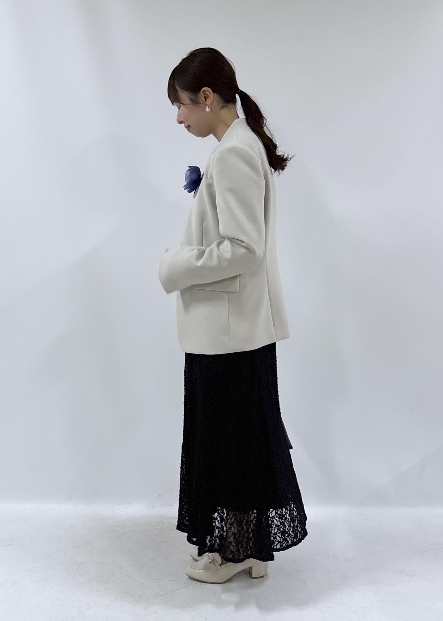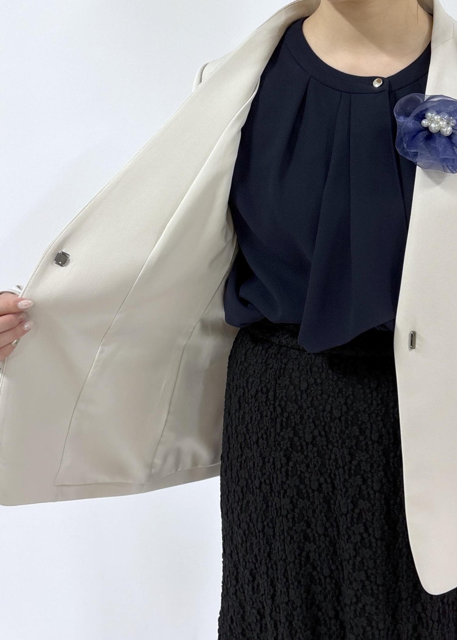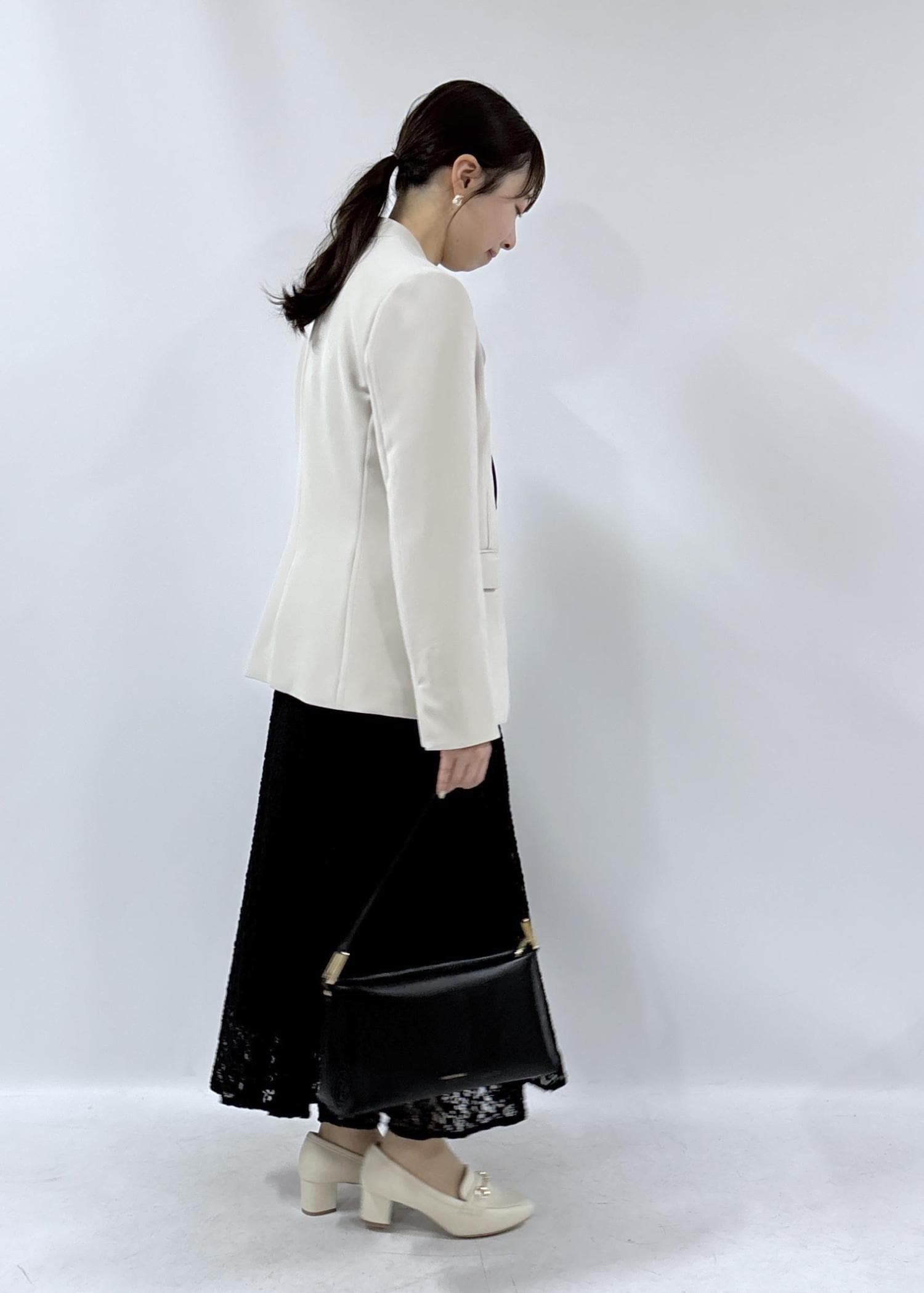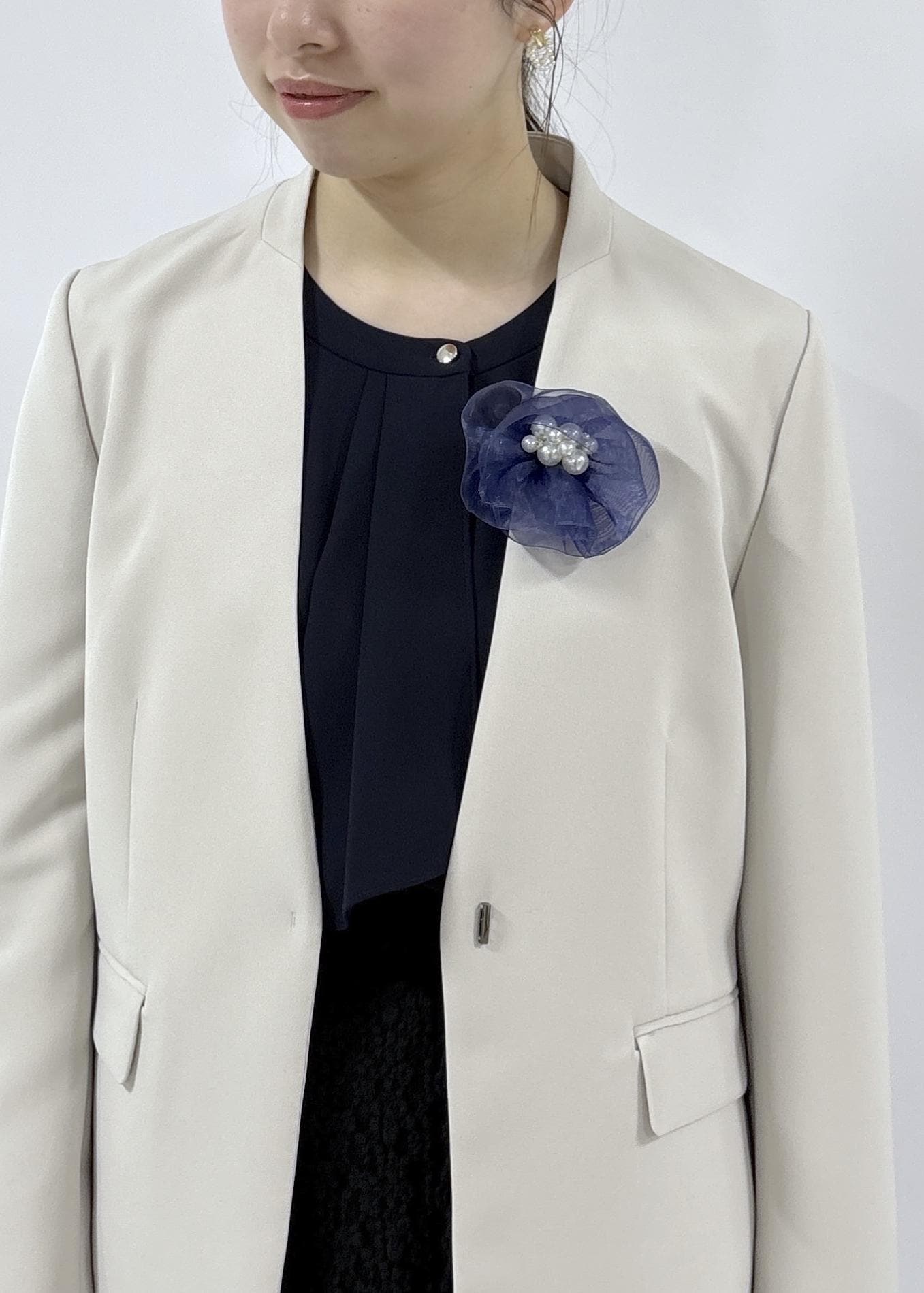 卒業式にオススメな、フェミニンさもあるコーディネートです。ブラックやネイビーをベースにし、ジャケットは入学式でも着用できるようにあえて明るいカラーで合わせてみました。