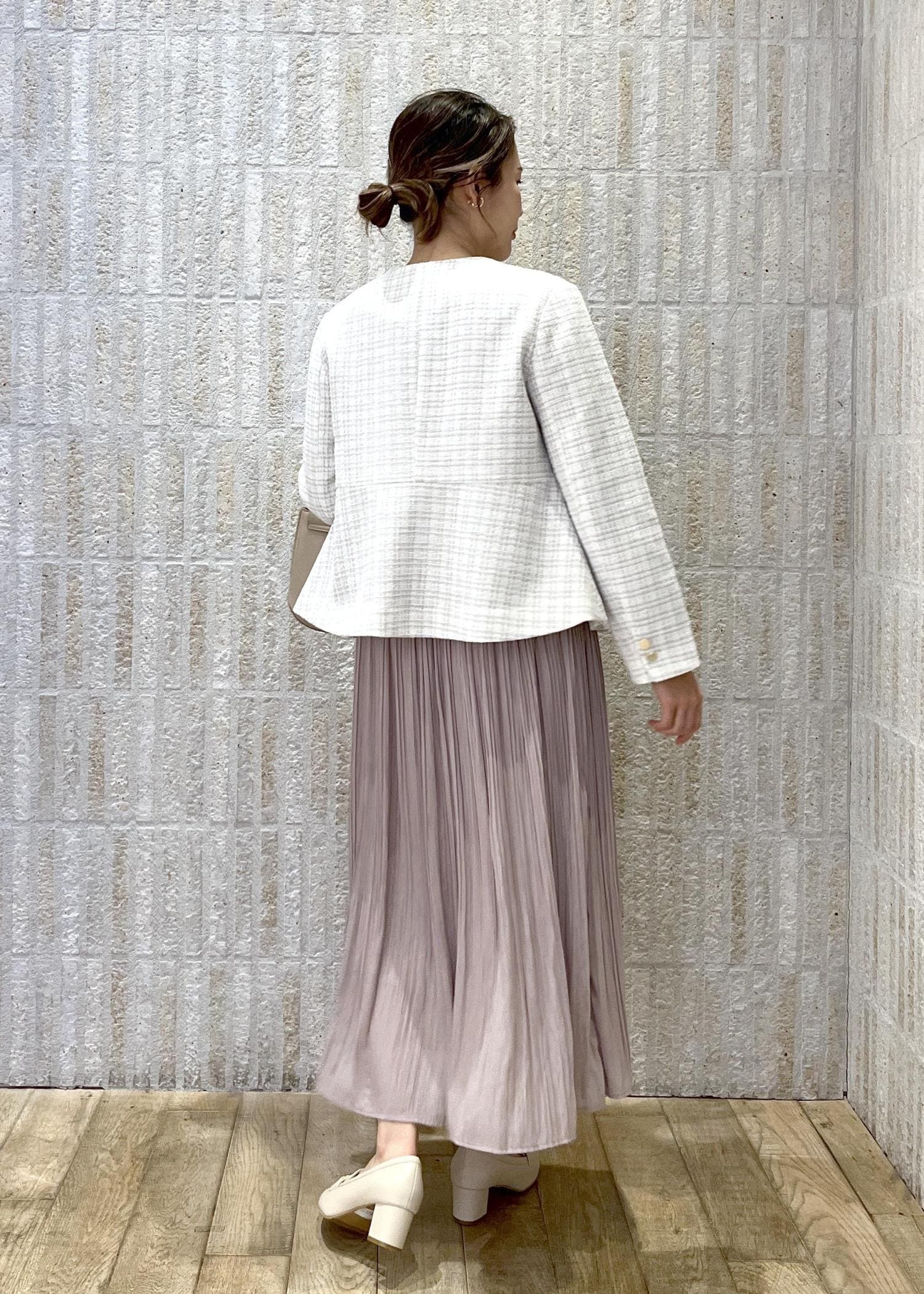 ピンクのプリーツスカートとツイードジャケットを合わせた、フェミニン系ママにおすすめのハレの日スタイル。
