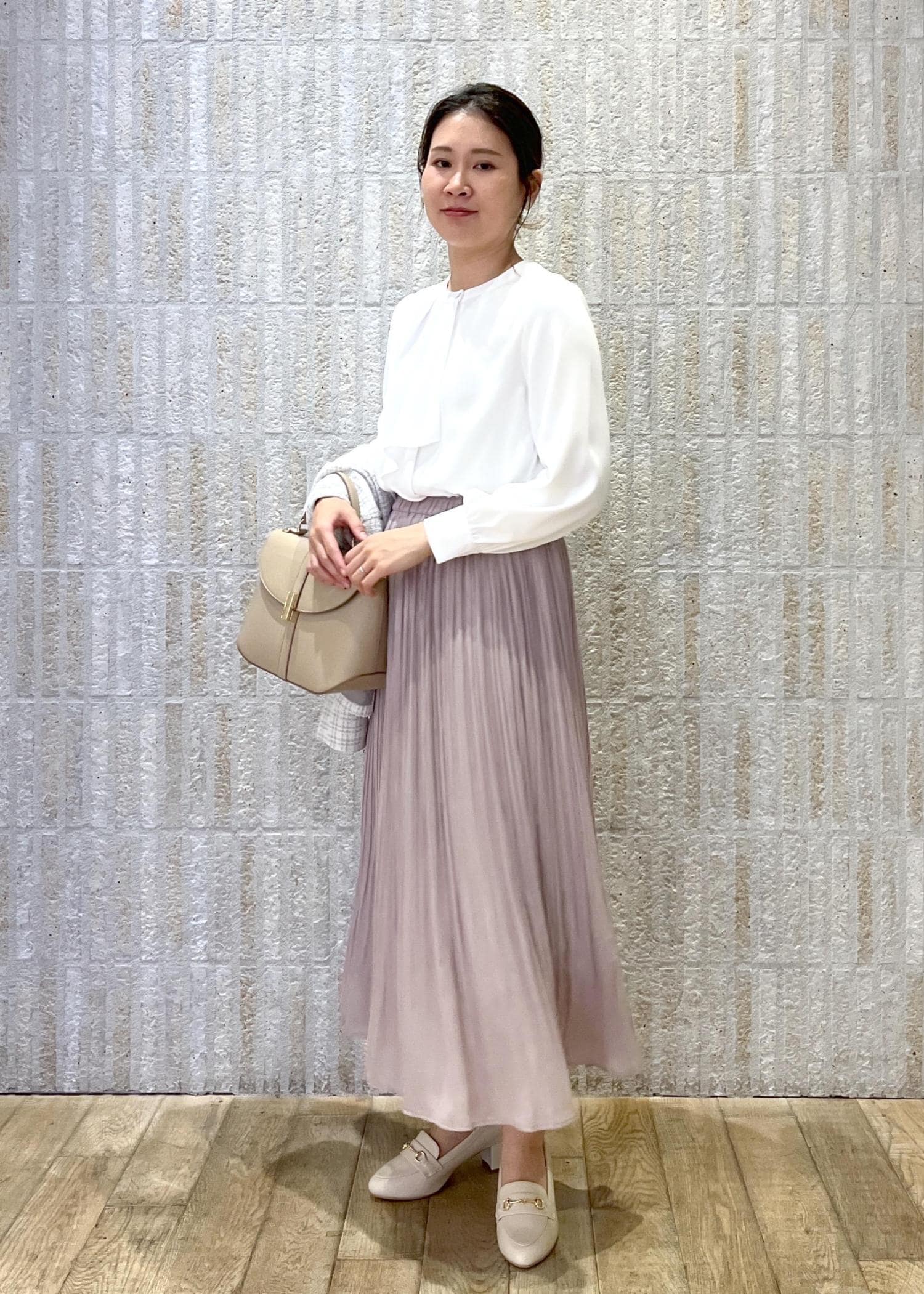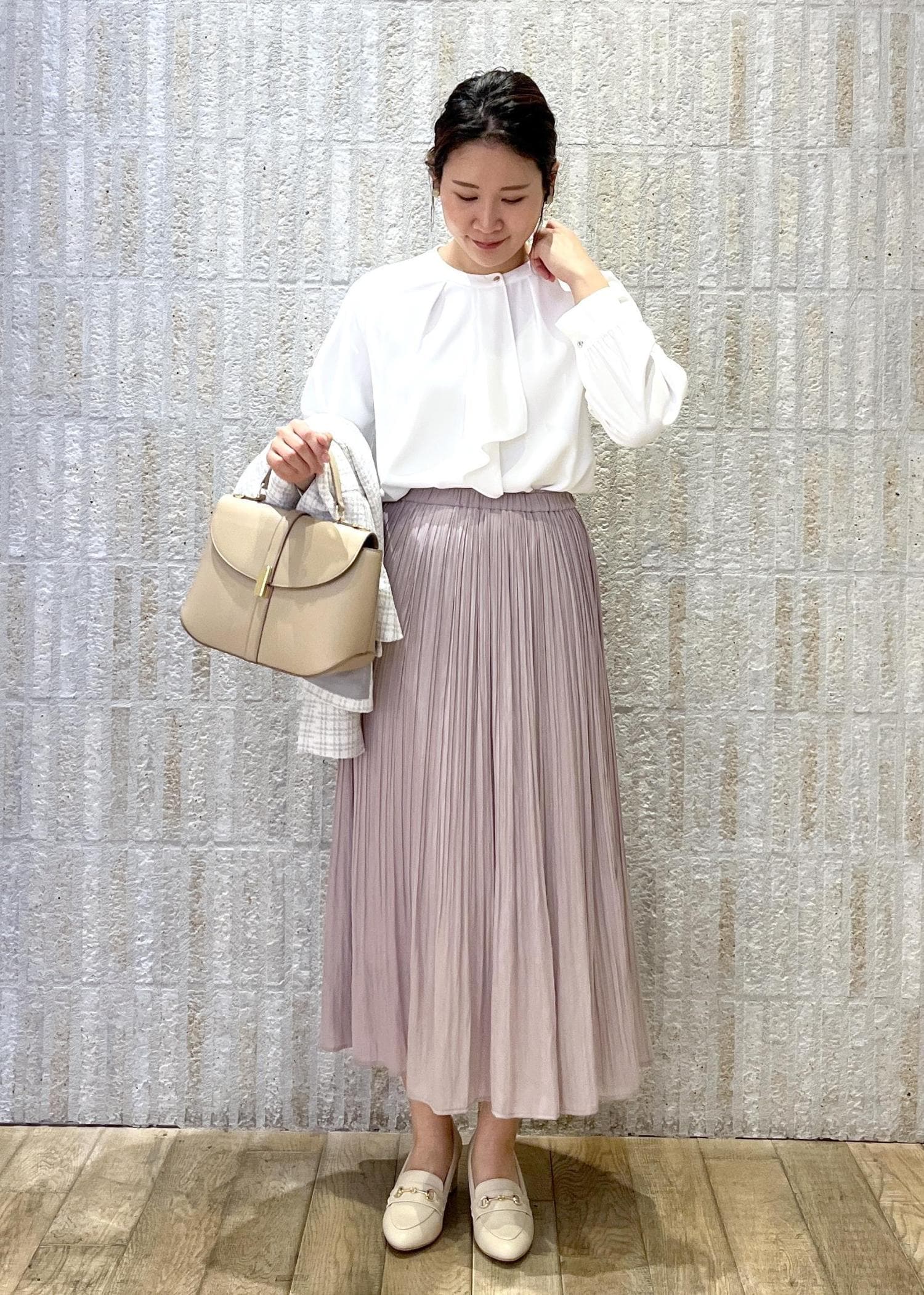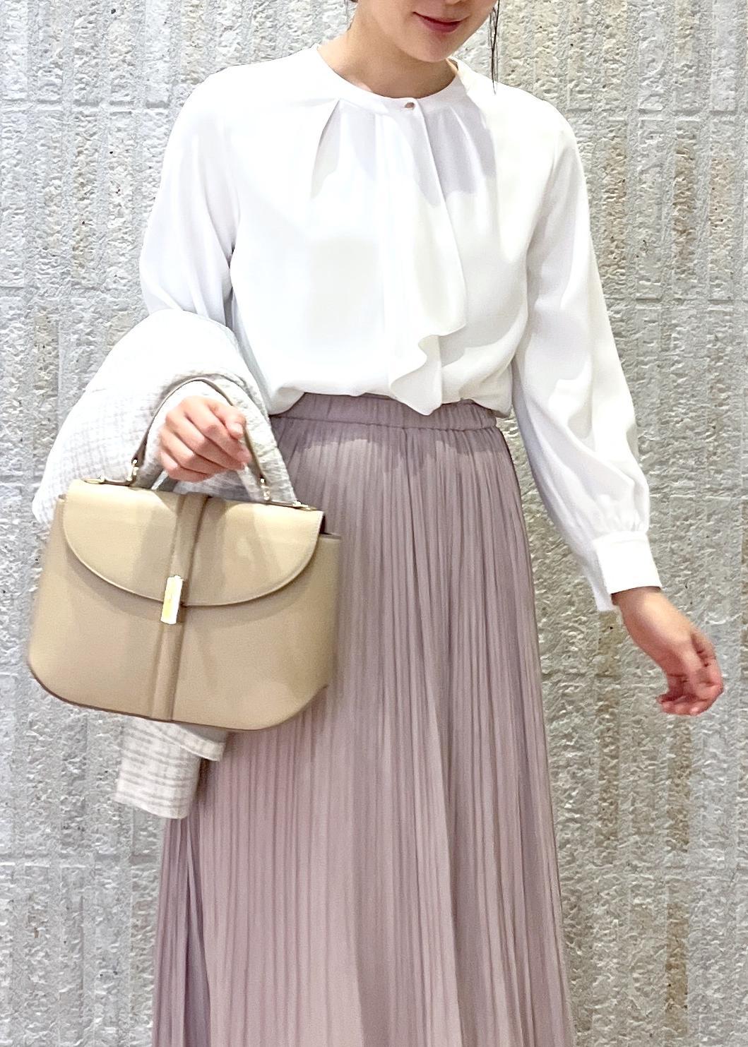 白×ピンクで桜の入学式シーズンにはぴったりのスタイリングです。