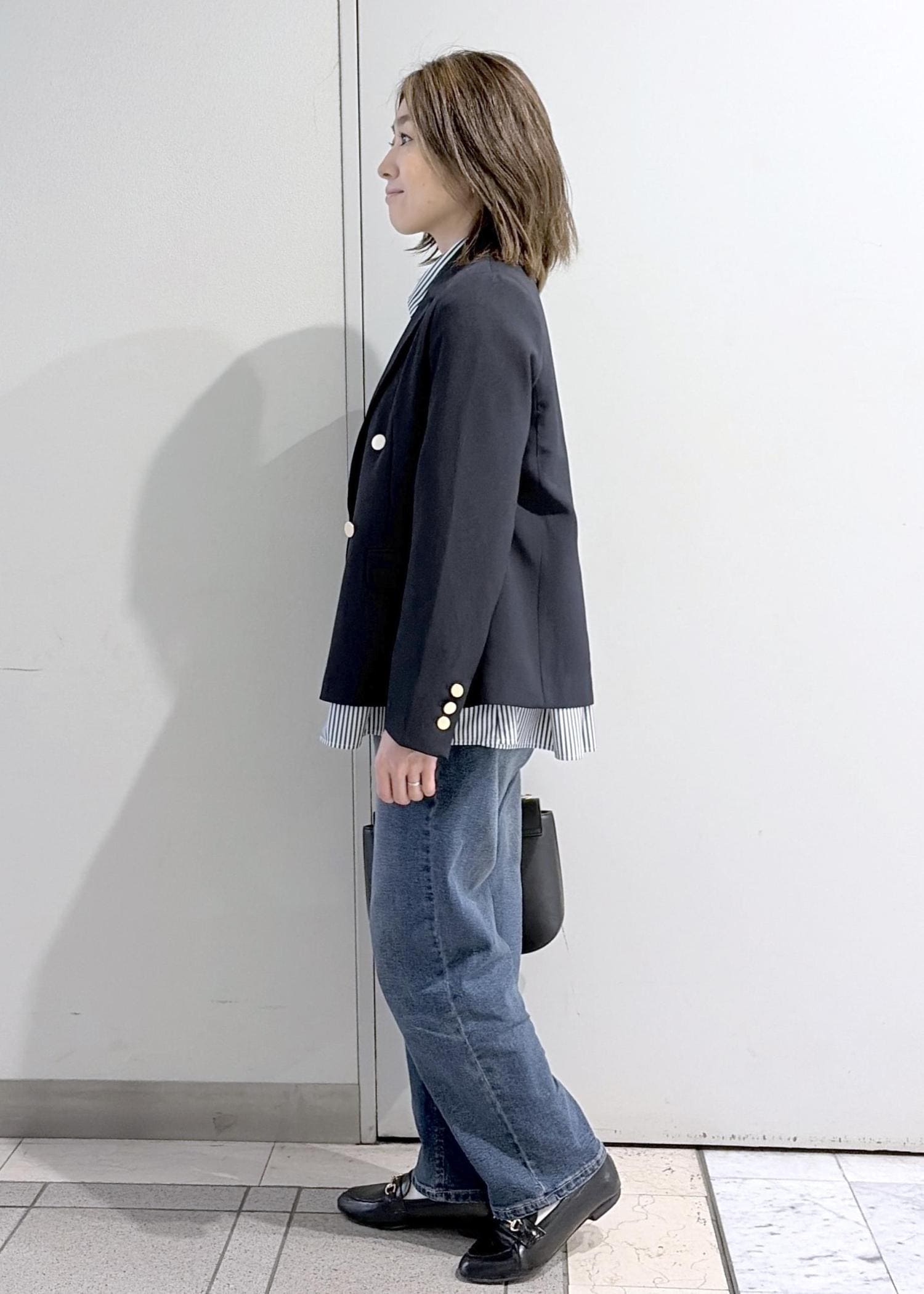 袖丈はちょうど良く、着丈は腰まわりにかかる長さです。 -
