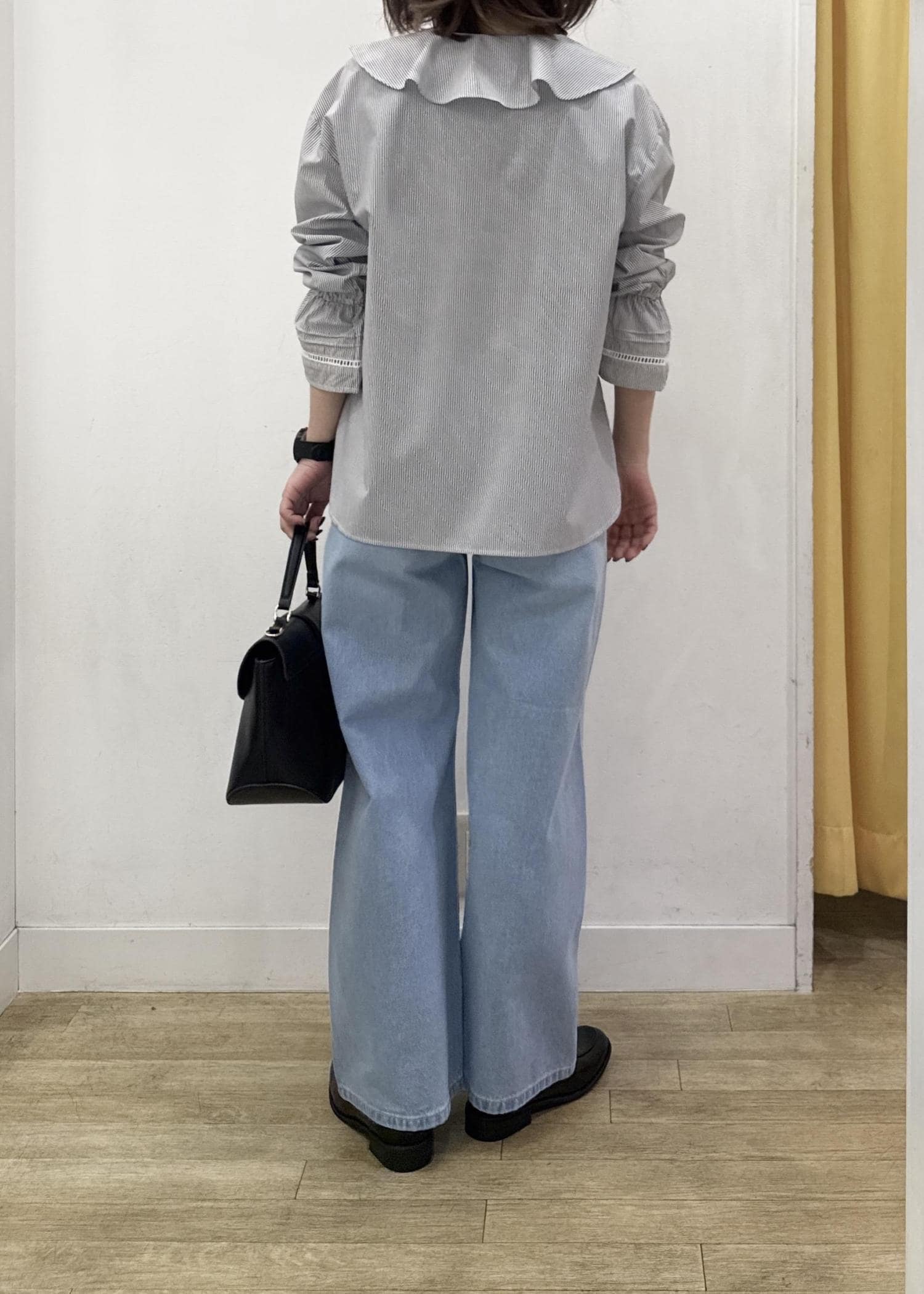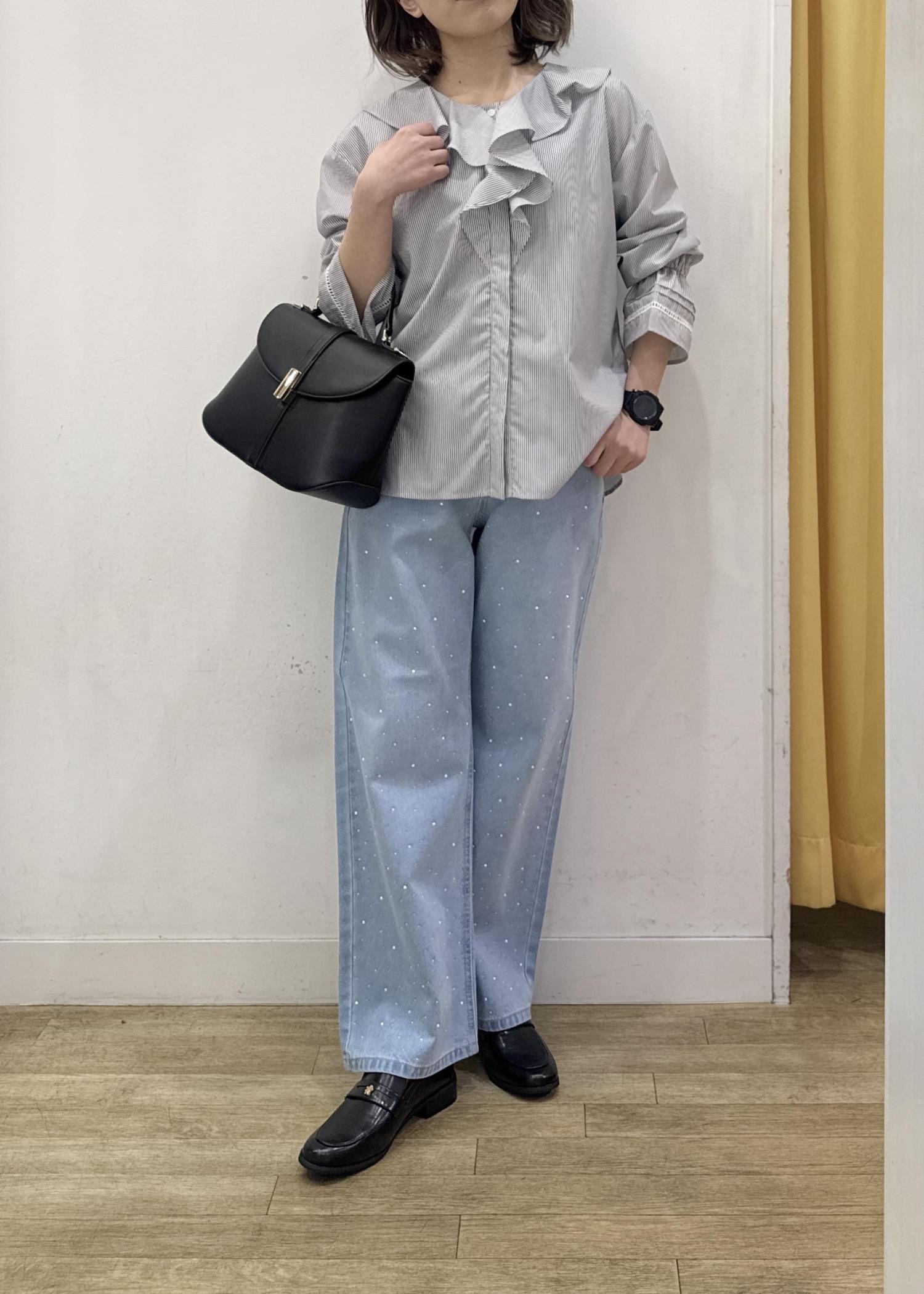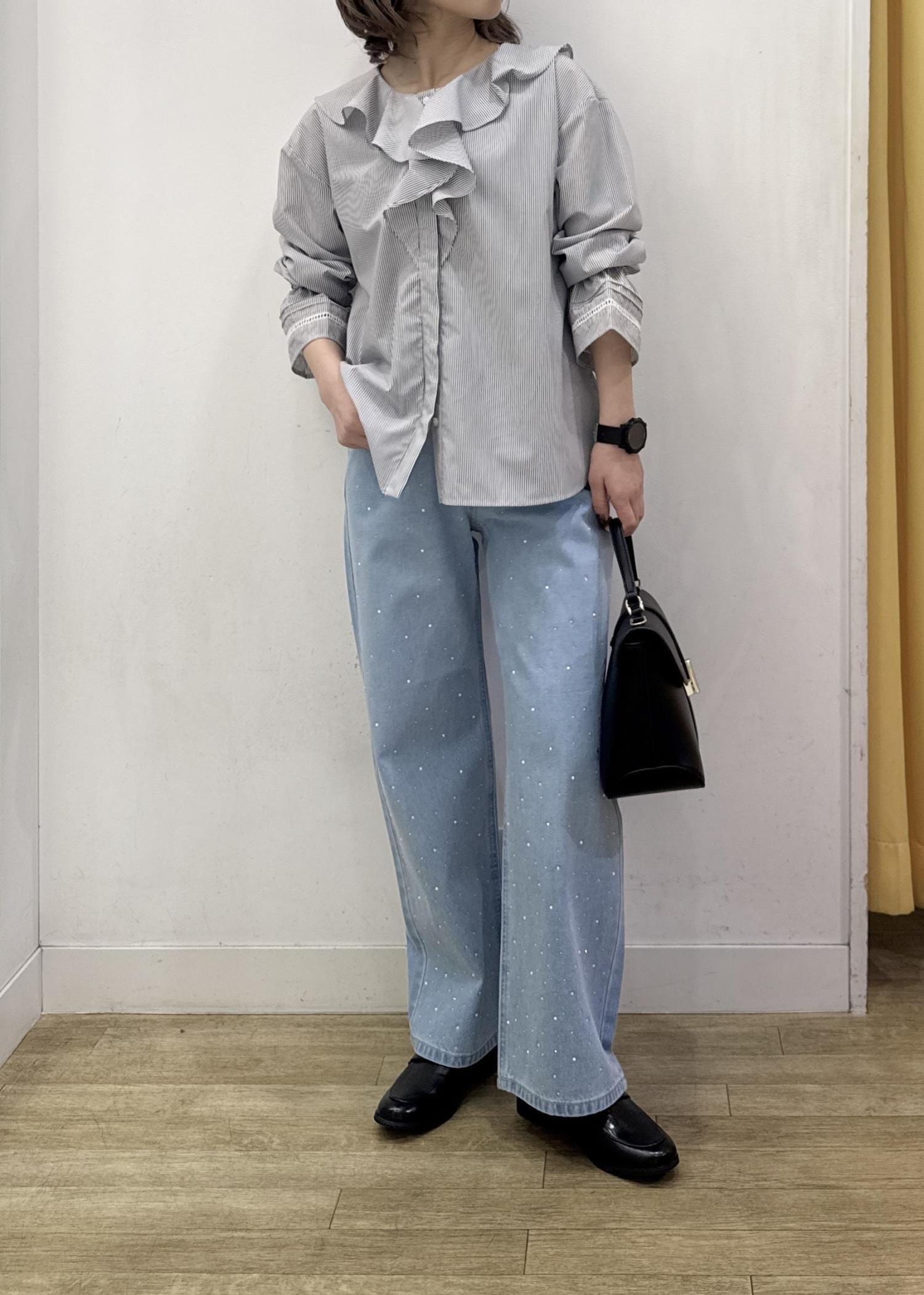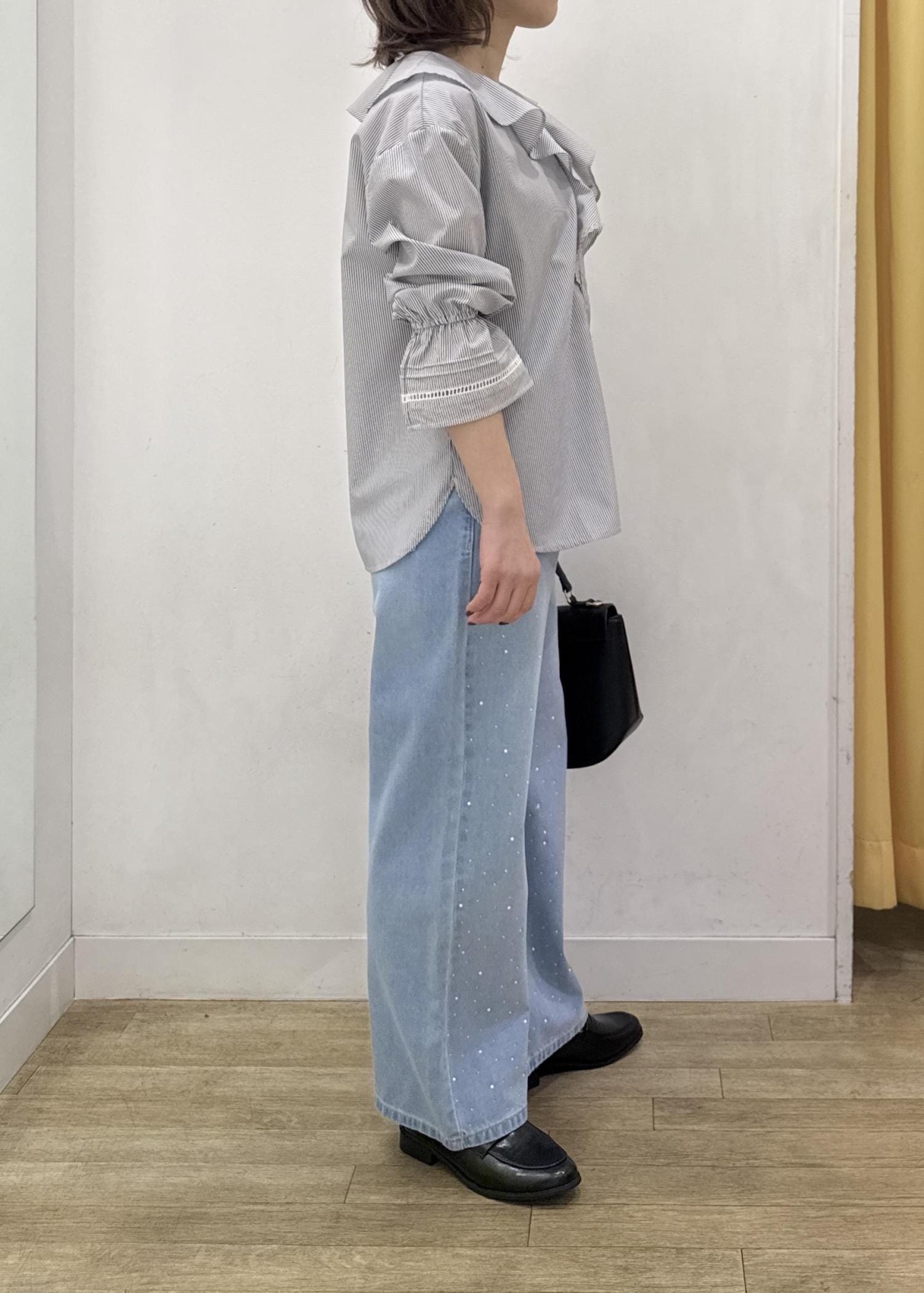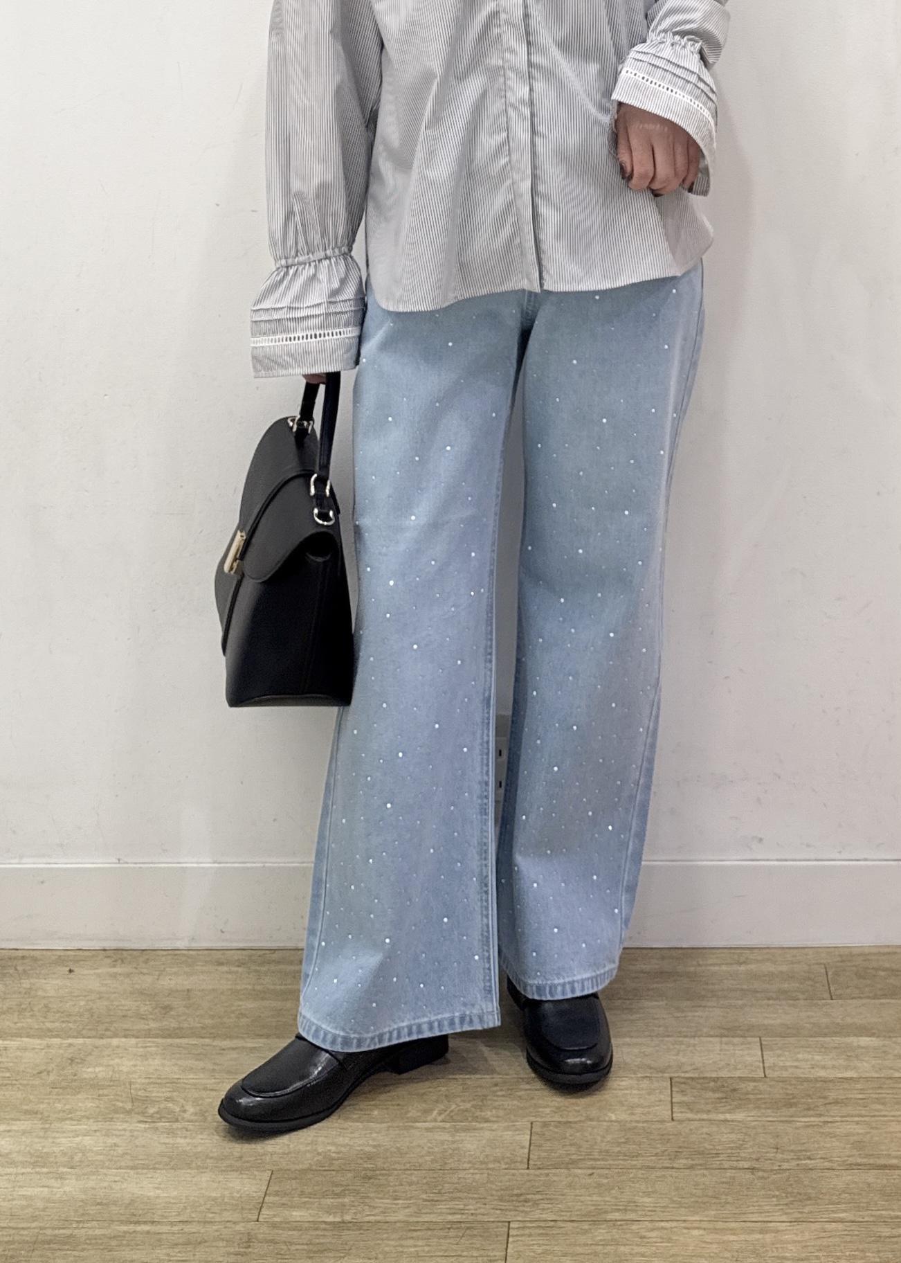 脚のラインは拾わないワイドシルエットで、カジュアルになりがちなデニムもビジューとパールデザインで華やかに着ていただけます。 -