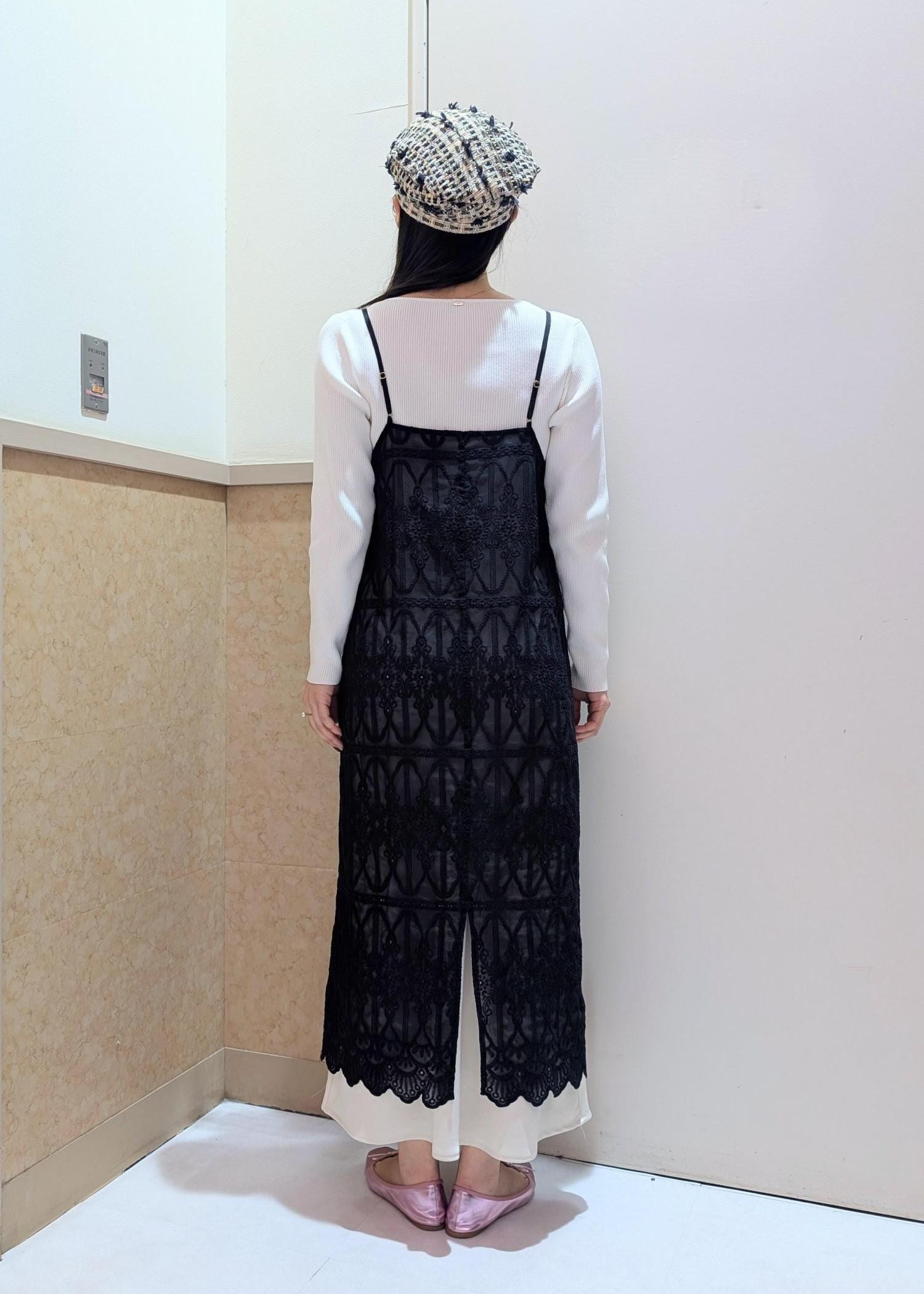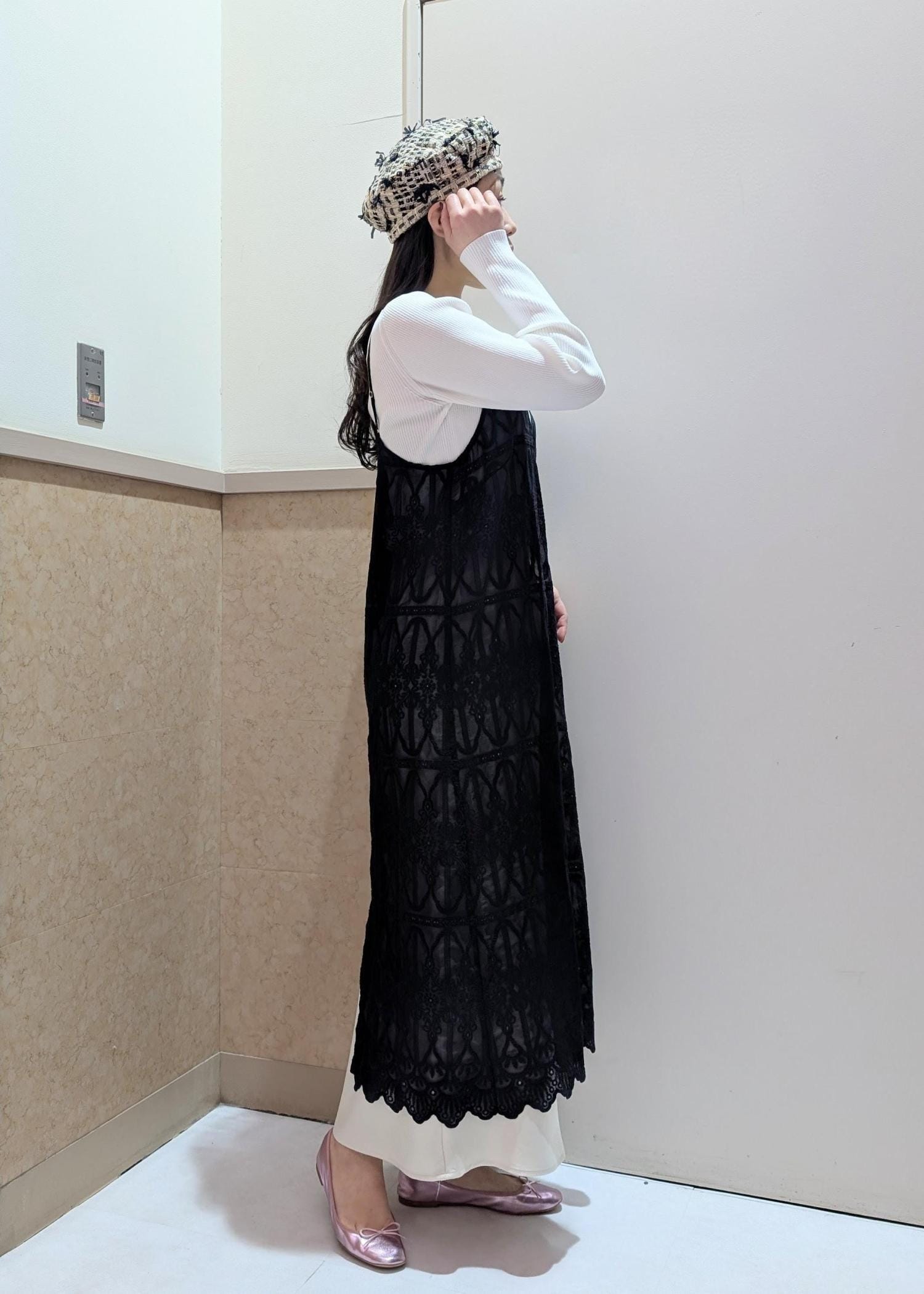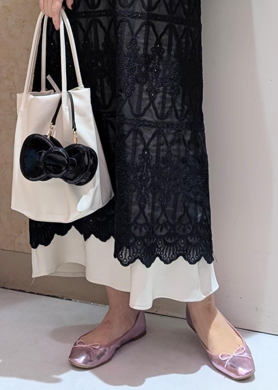 レースの柄が映えるようにインナーに使用したニットとスカートは白を選び、黒ジャケットでまとめました。