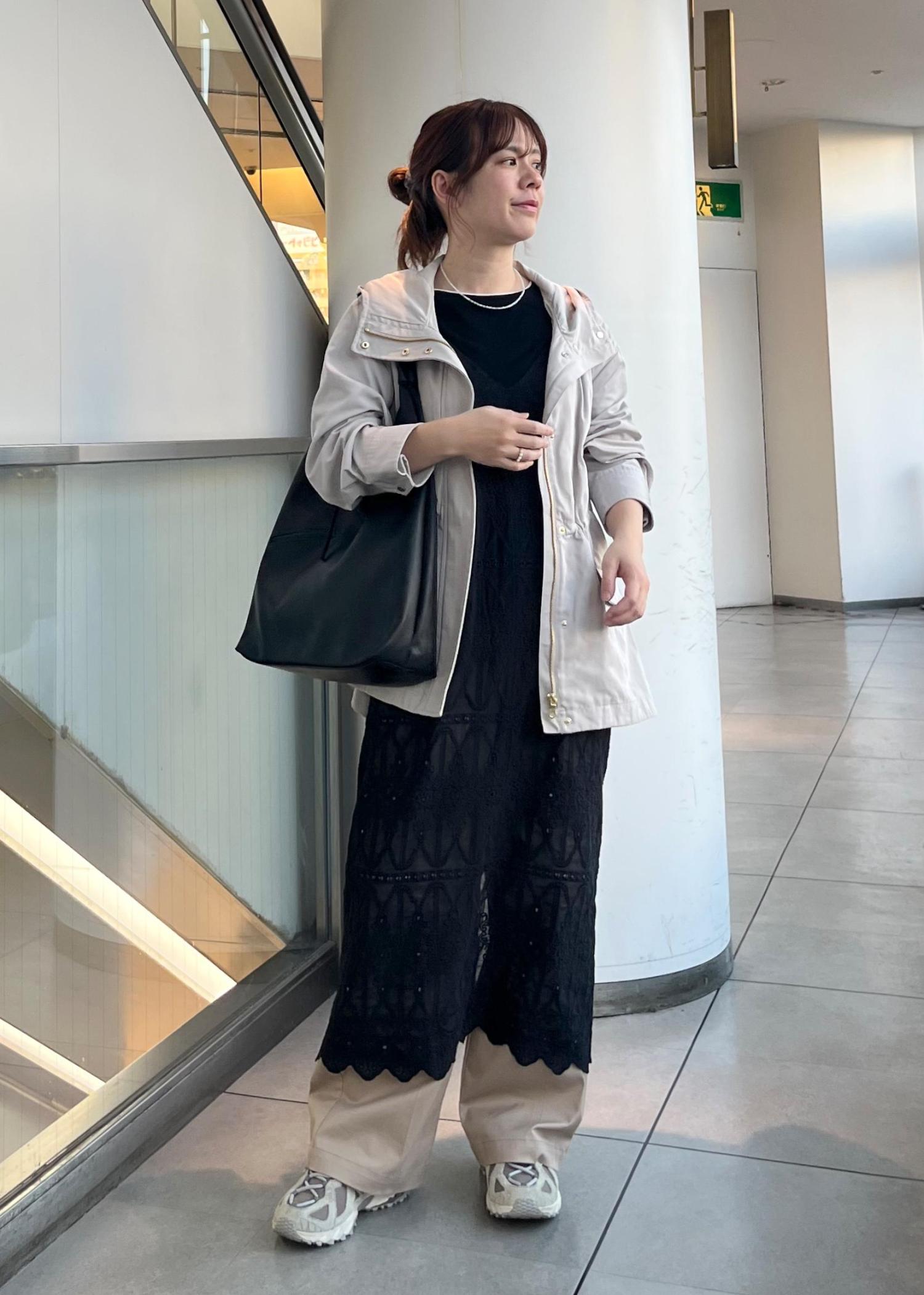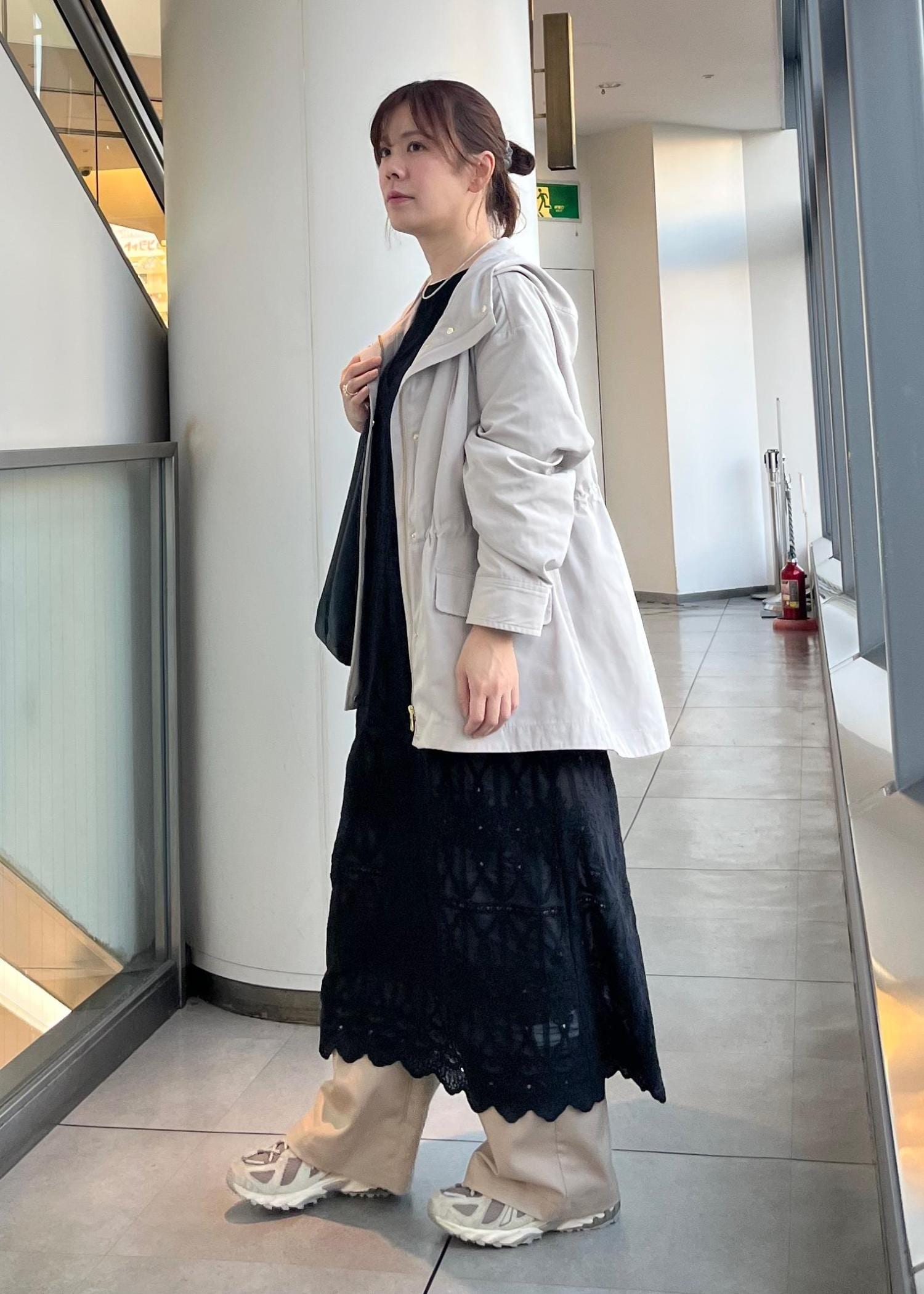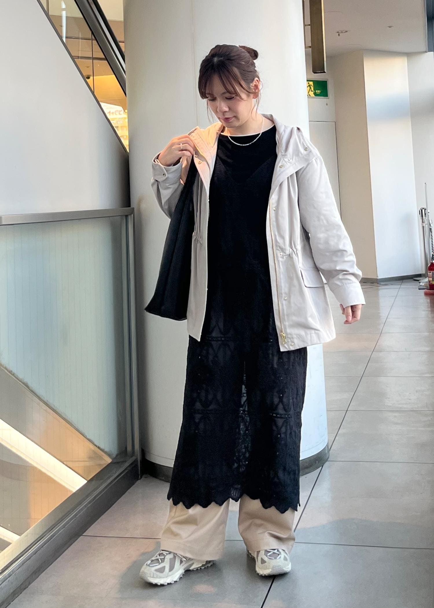 ミドル丈のマウンテンパーカーにレースワンピースをレイヤードした春コーデです。