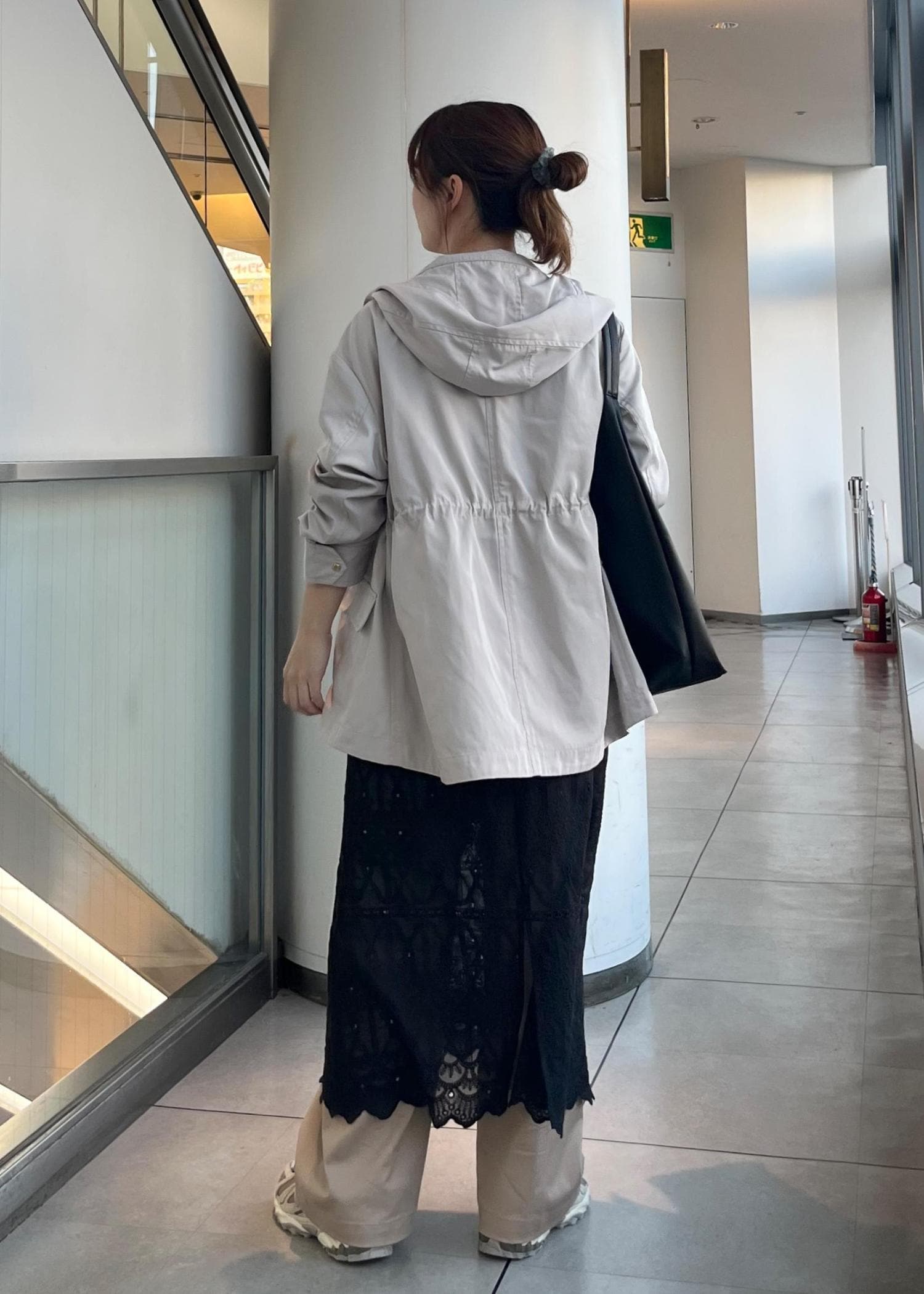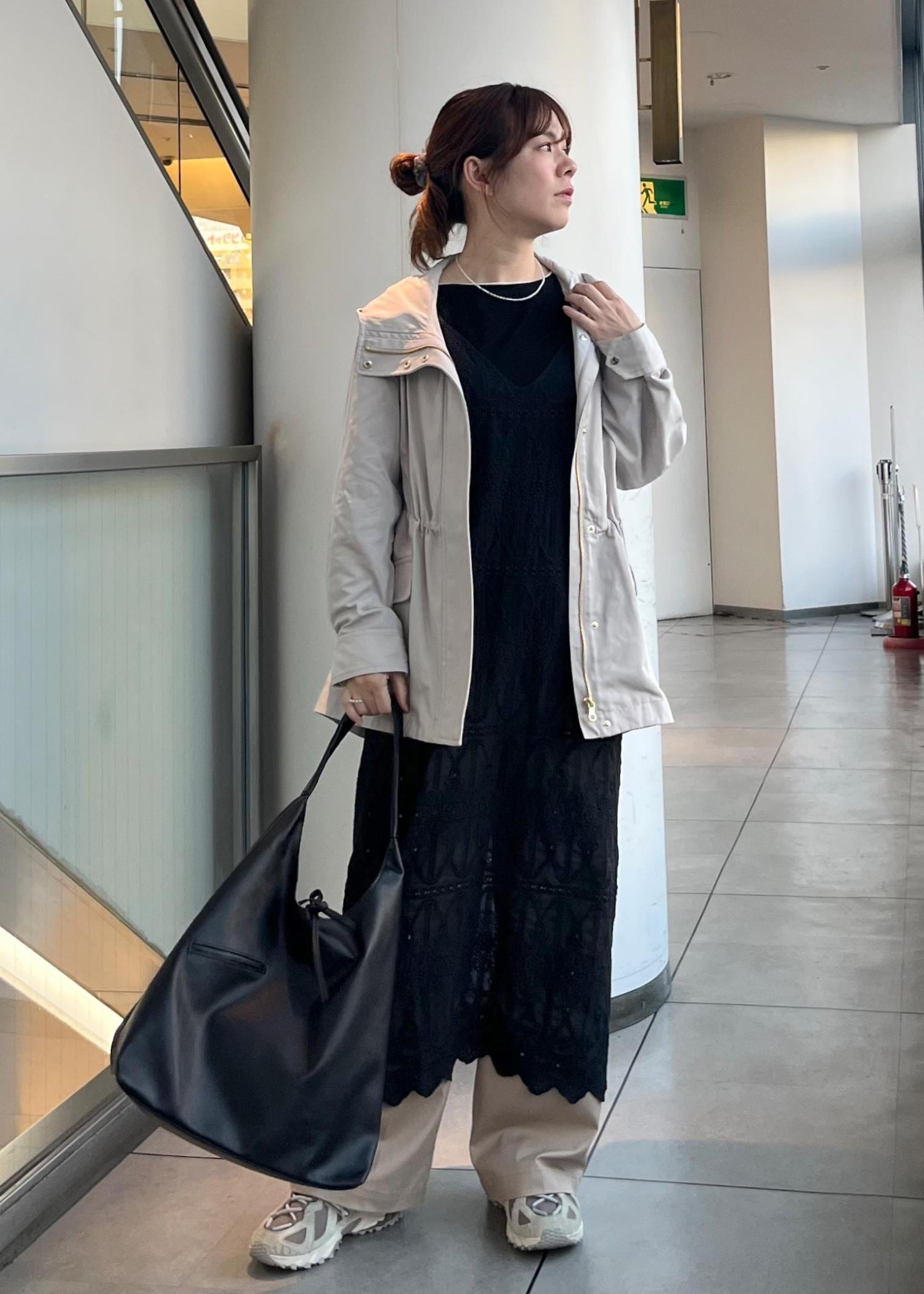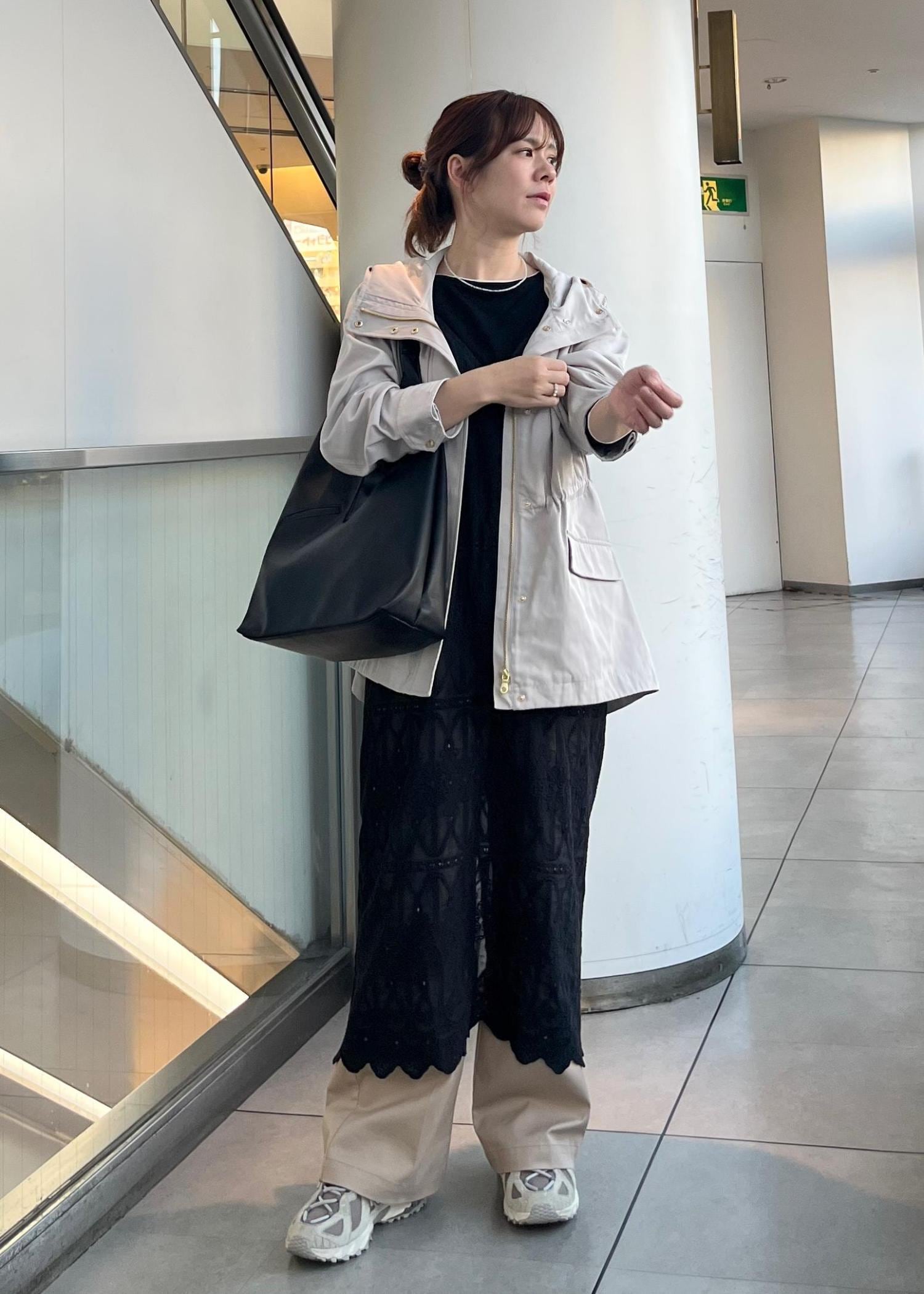 ミドル丈のマウンテンパーカーにレースワンピースをレイヤードした春コーデです。
