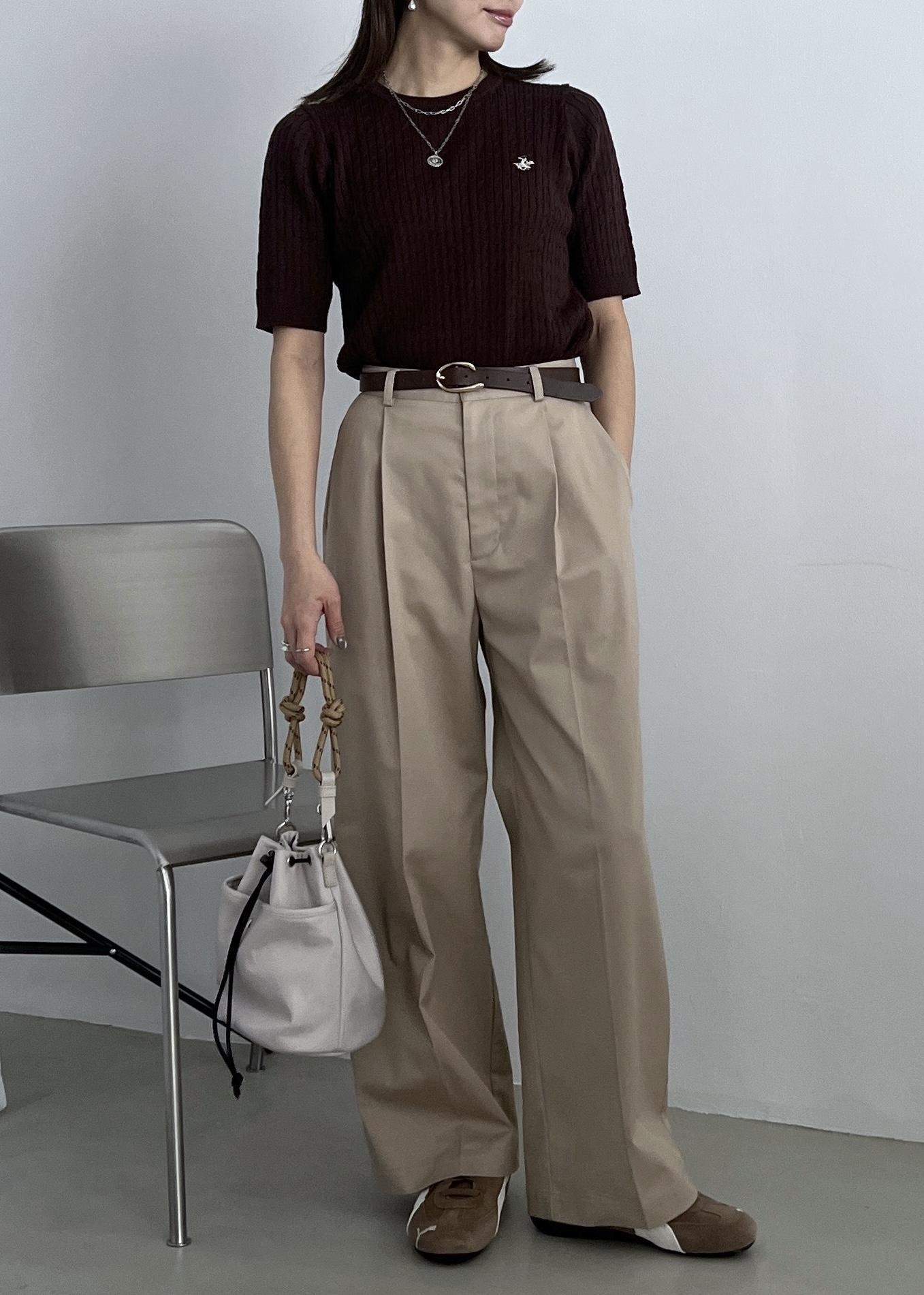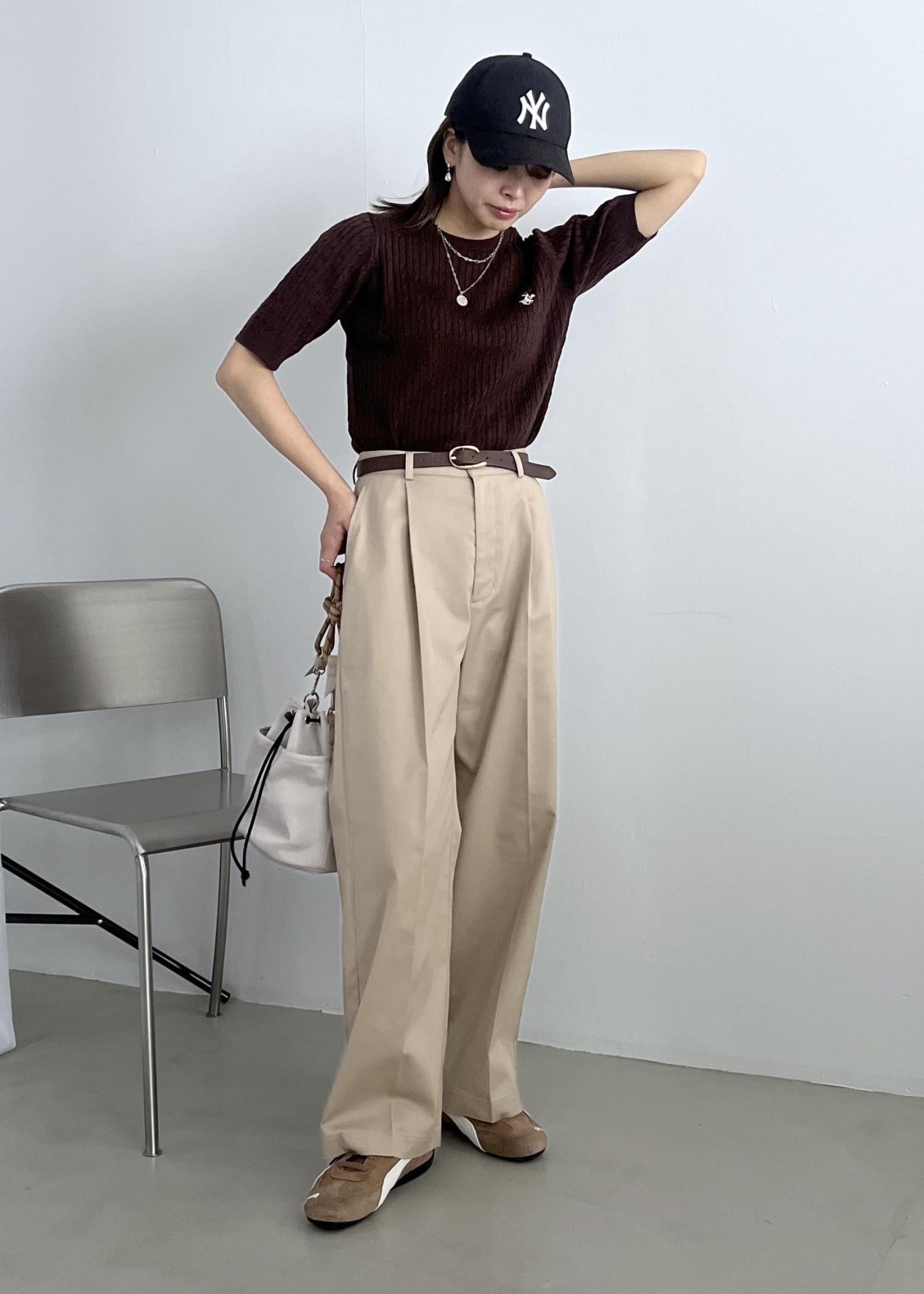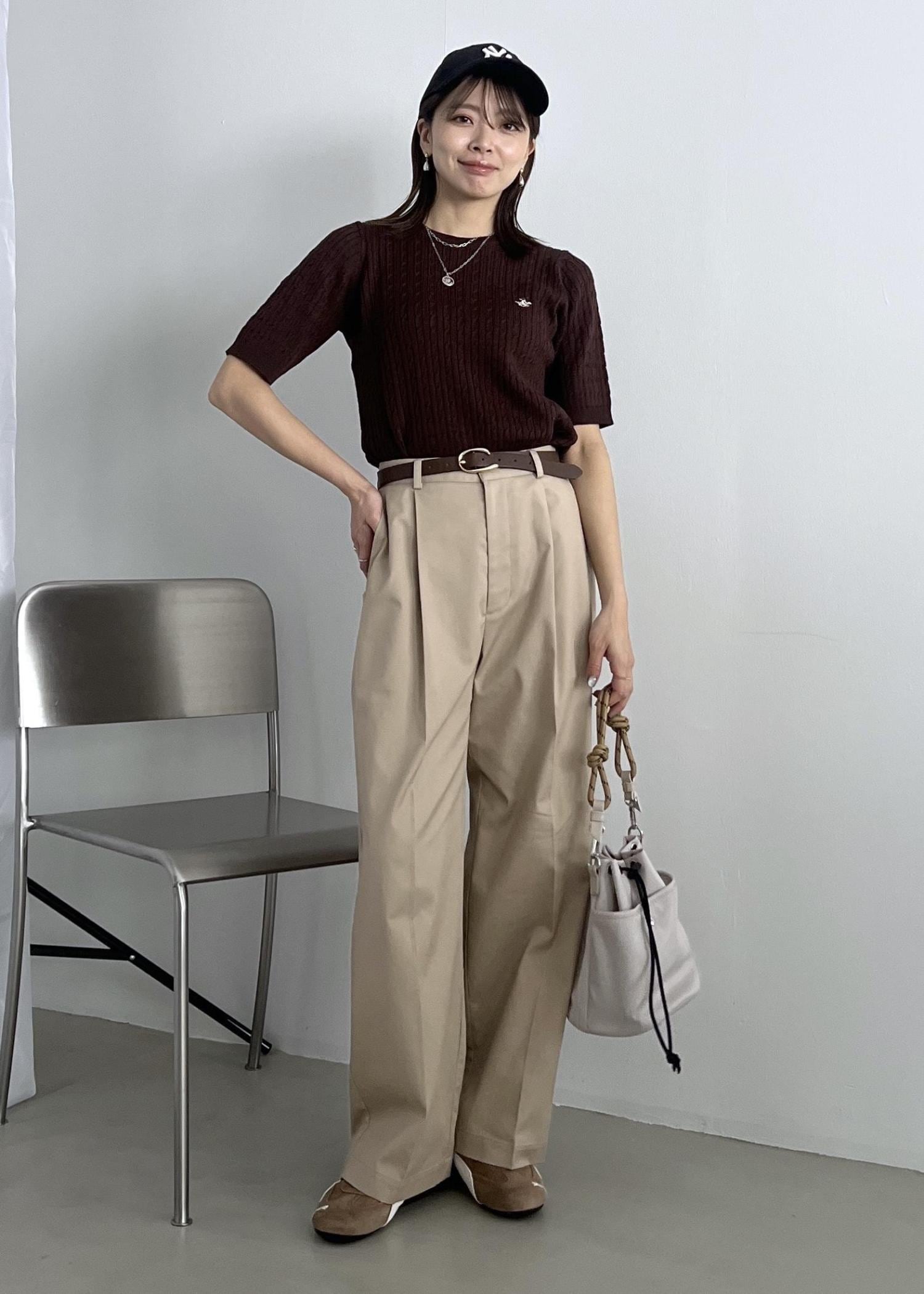 ブラウンの半袖ニットは、ベージュのチノパンツと合わせて大人カジュアルコーデに。