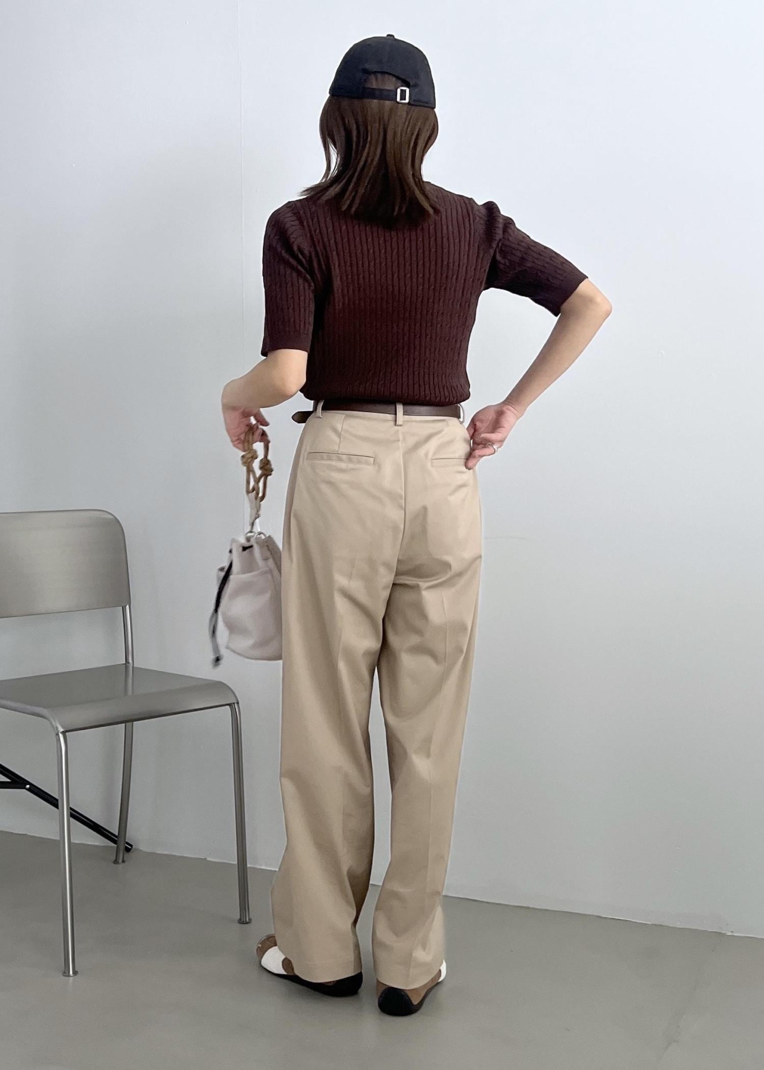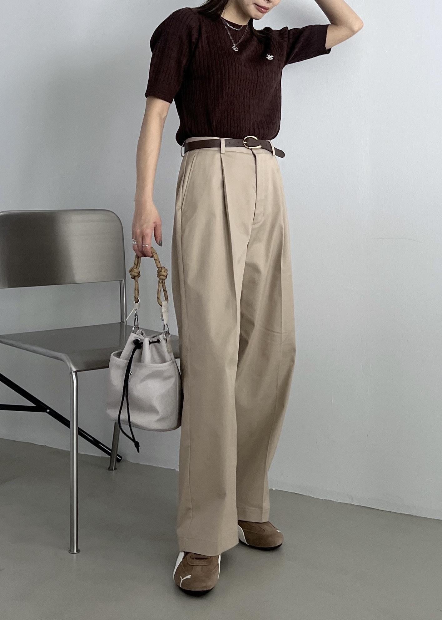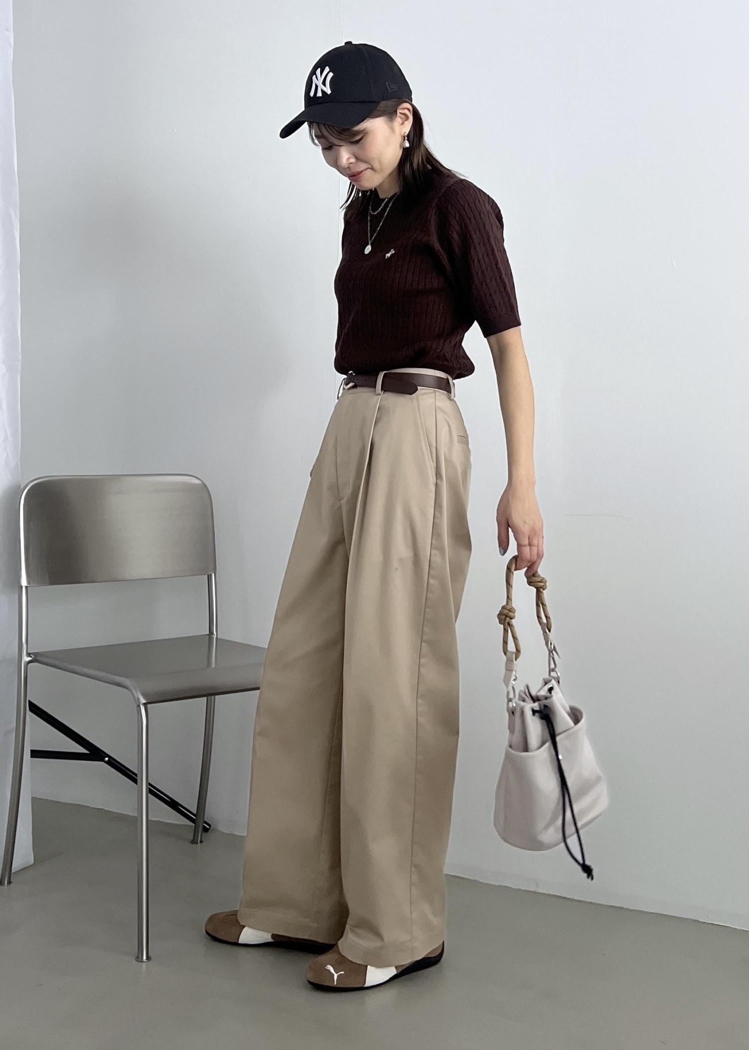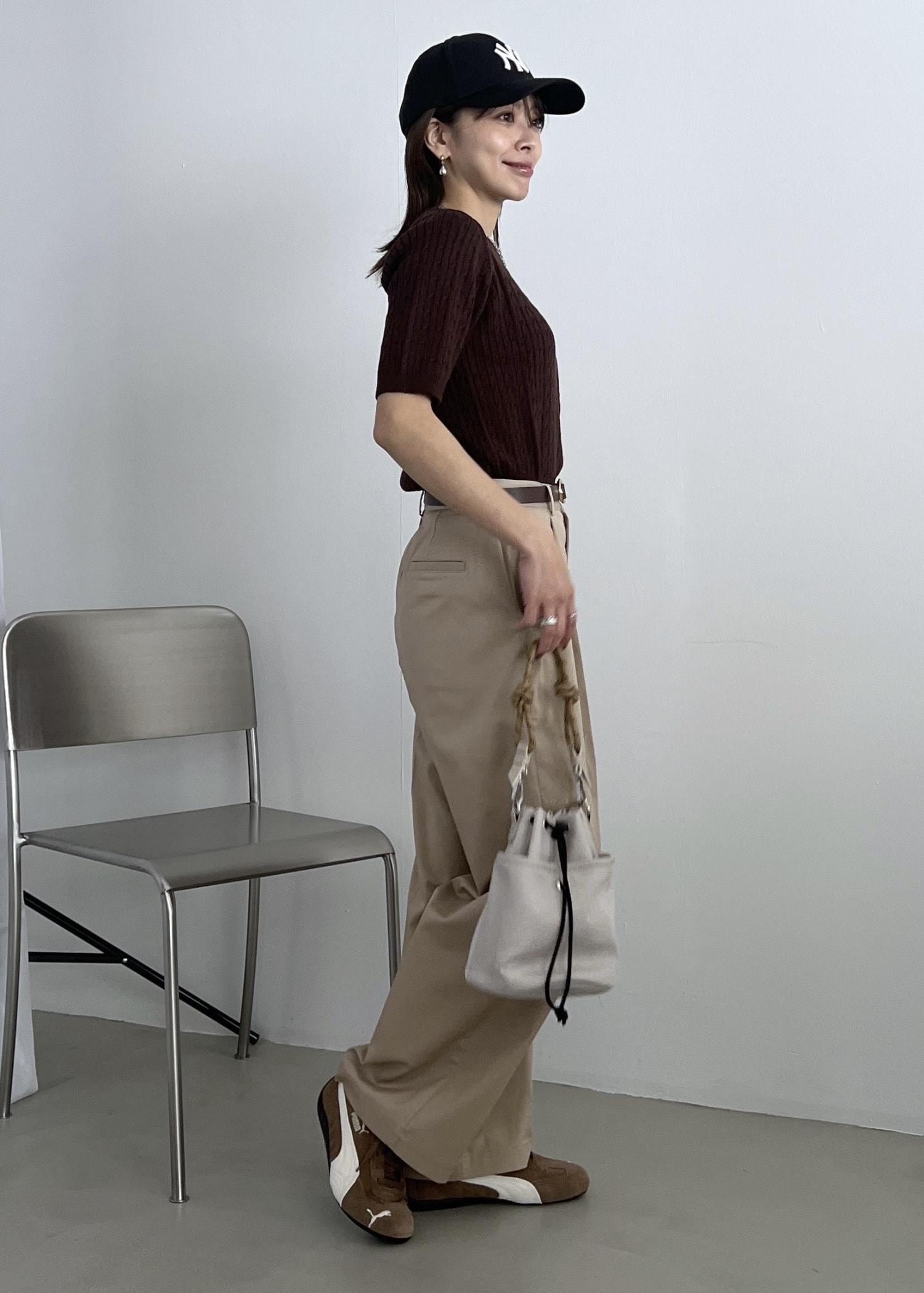 ブラウンの半袖ニットは、ベージュのチノパンツと合わせて大人カジュアルコーデに。