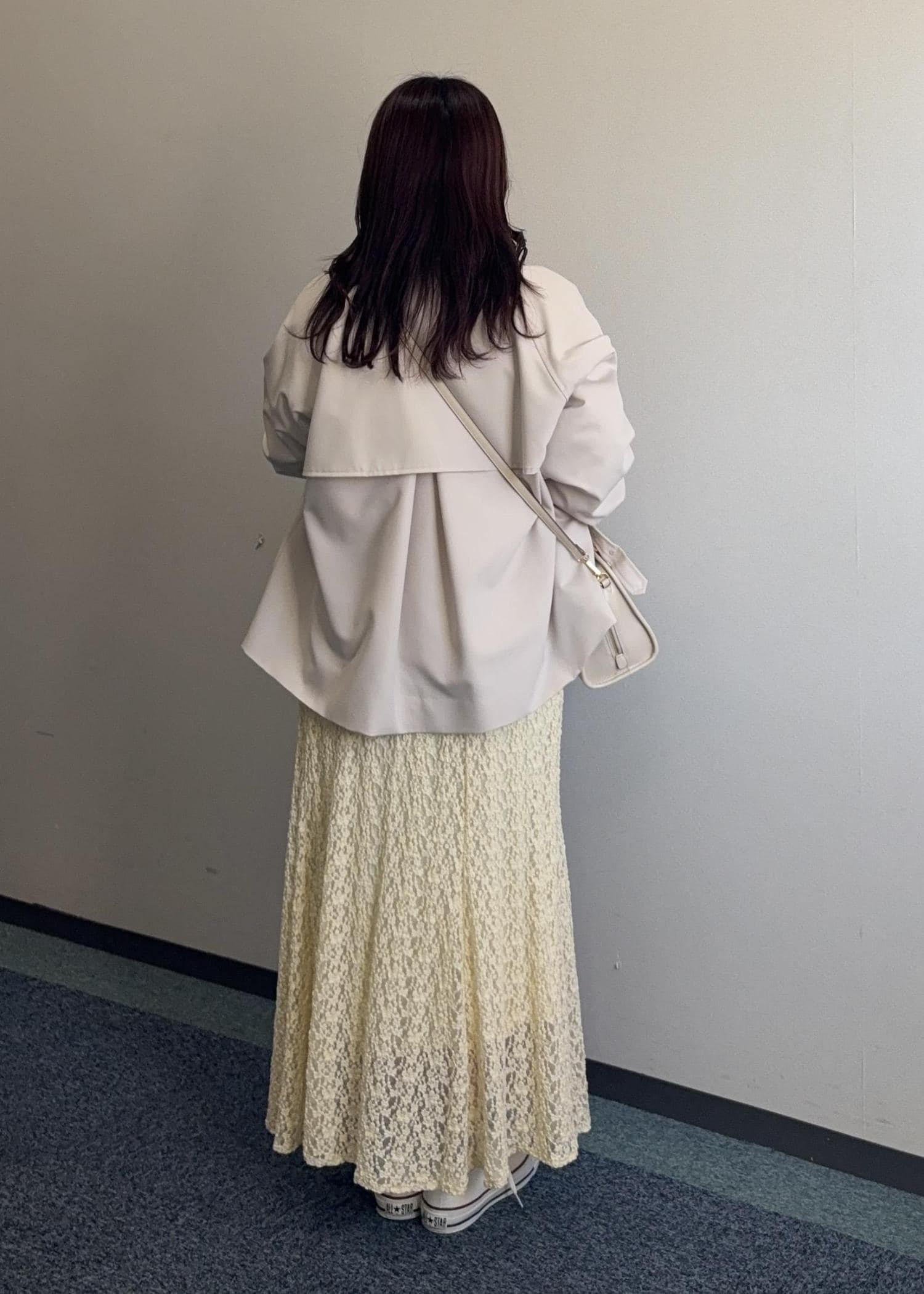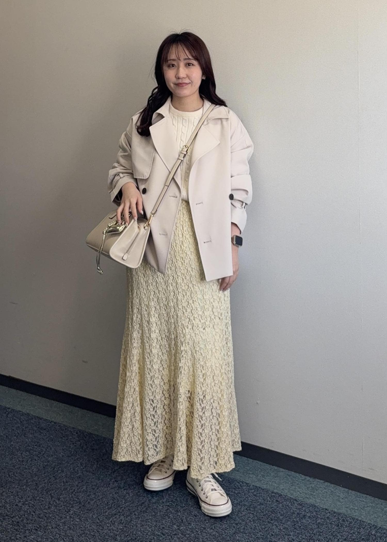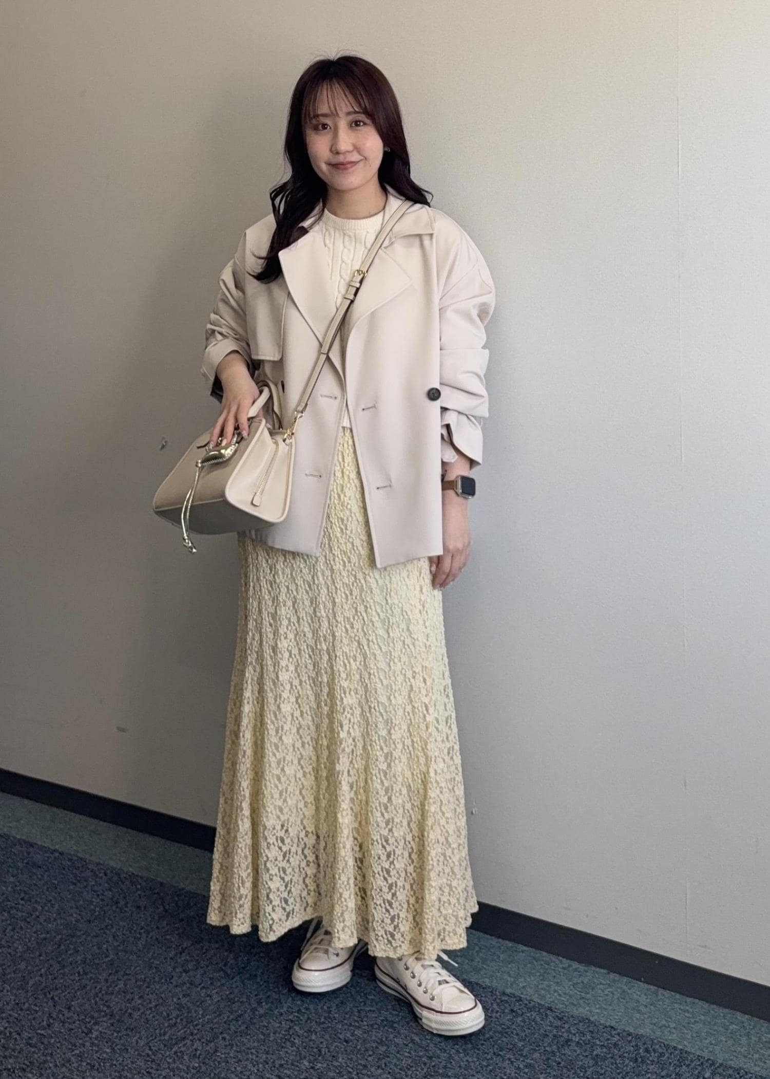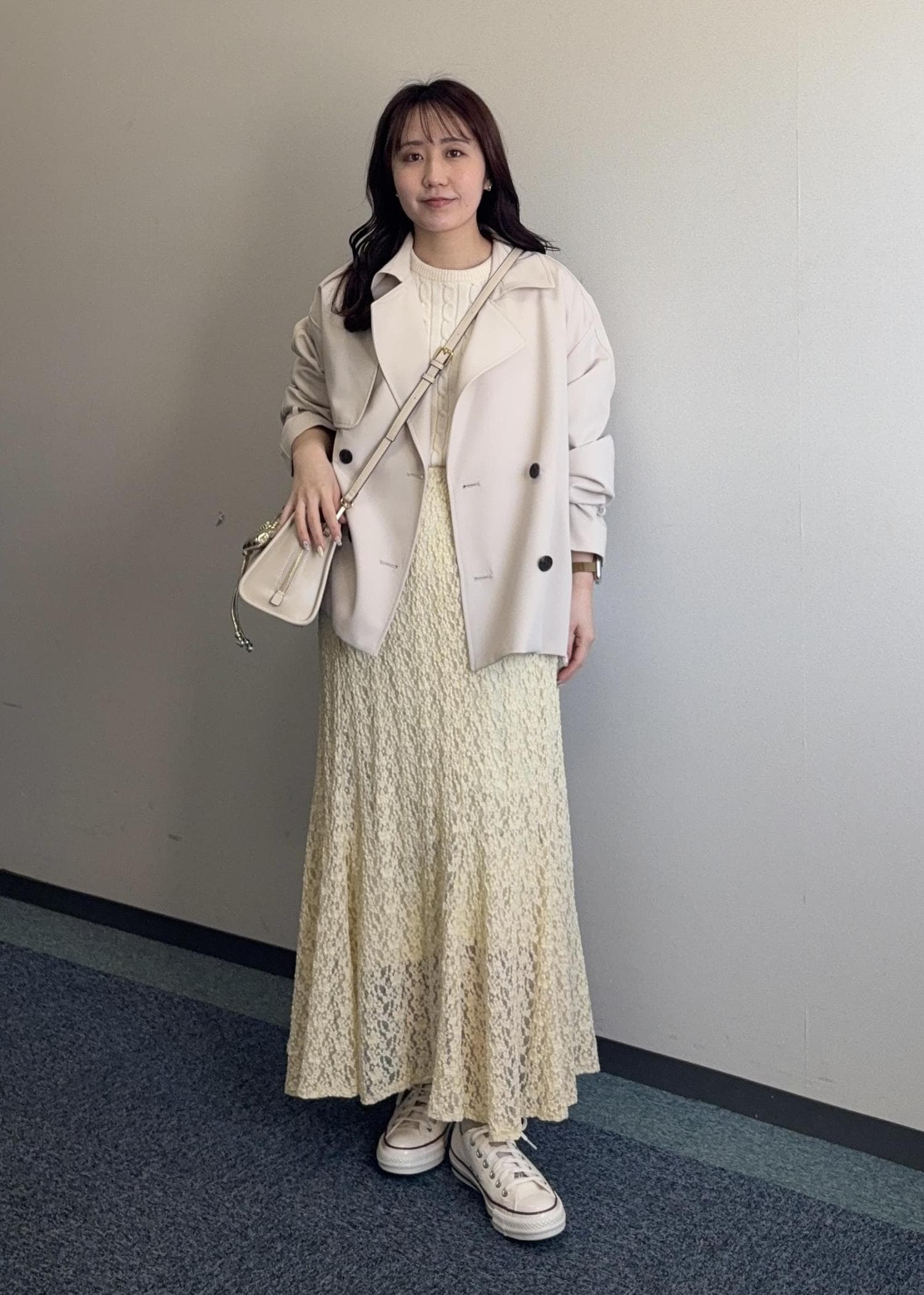 春らしいイエローのレーススカートにトレンチを合わせた春コーデ。それぞれラインも拾わずゆったりしているのでストレスフリーです♬