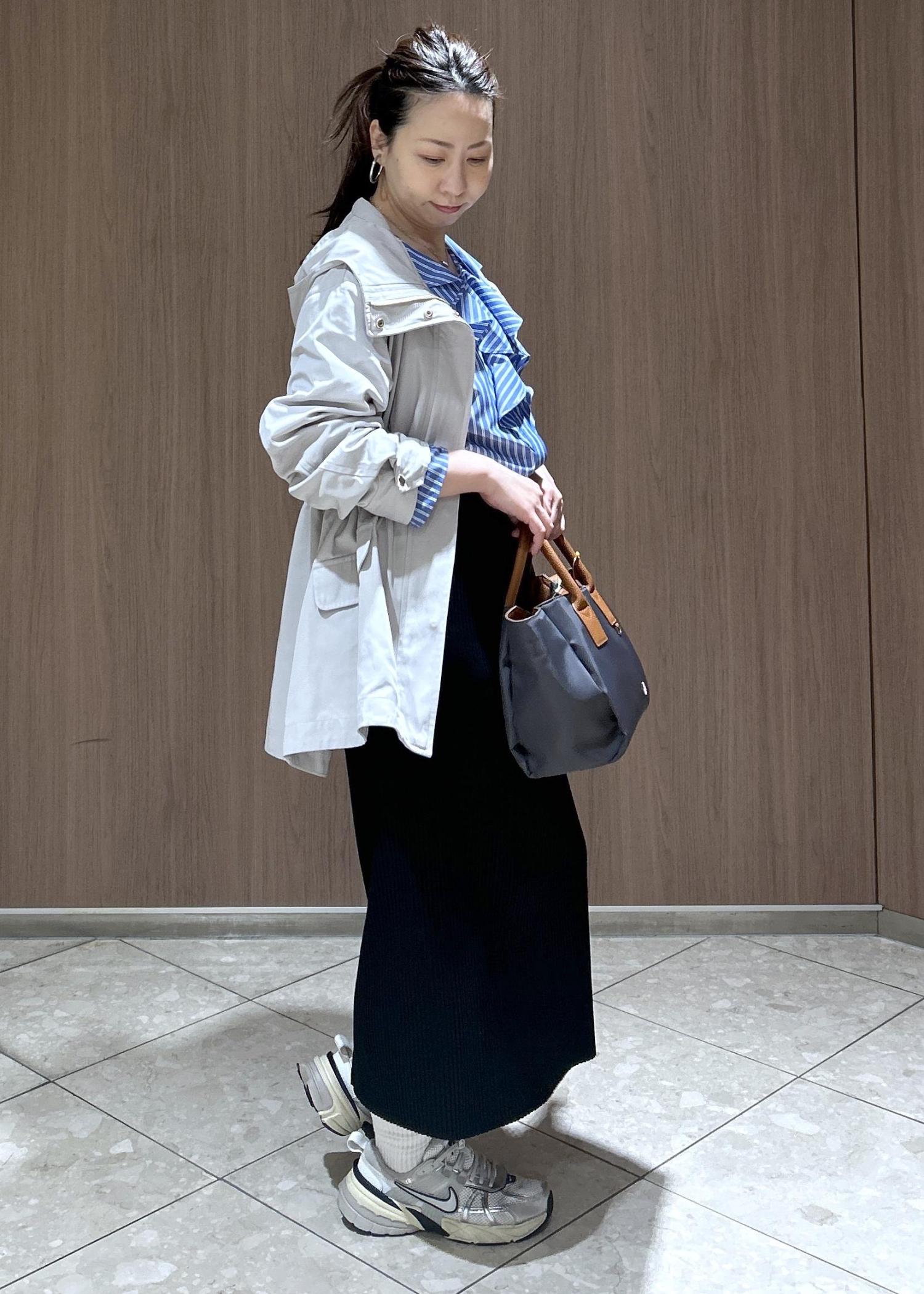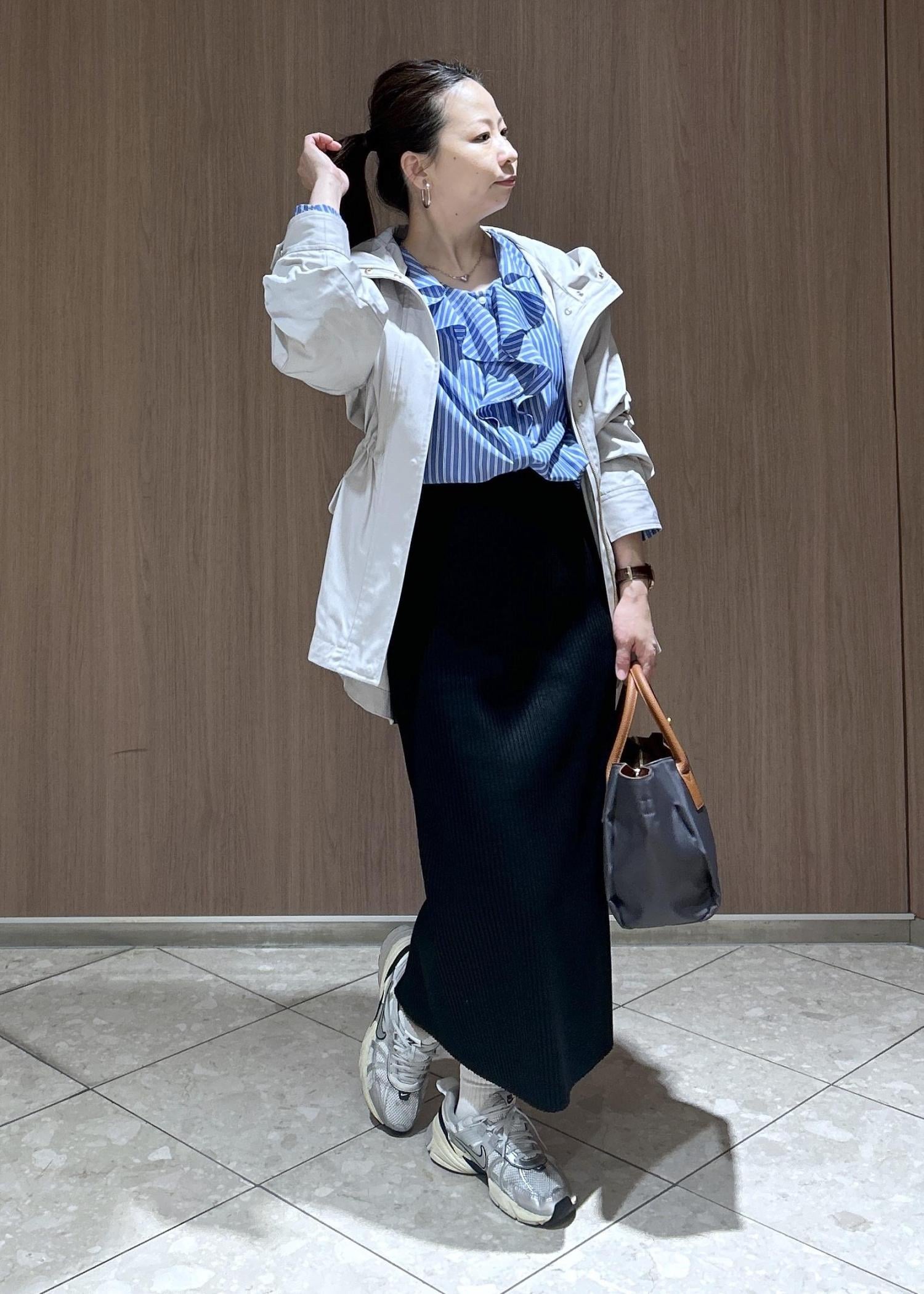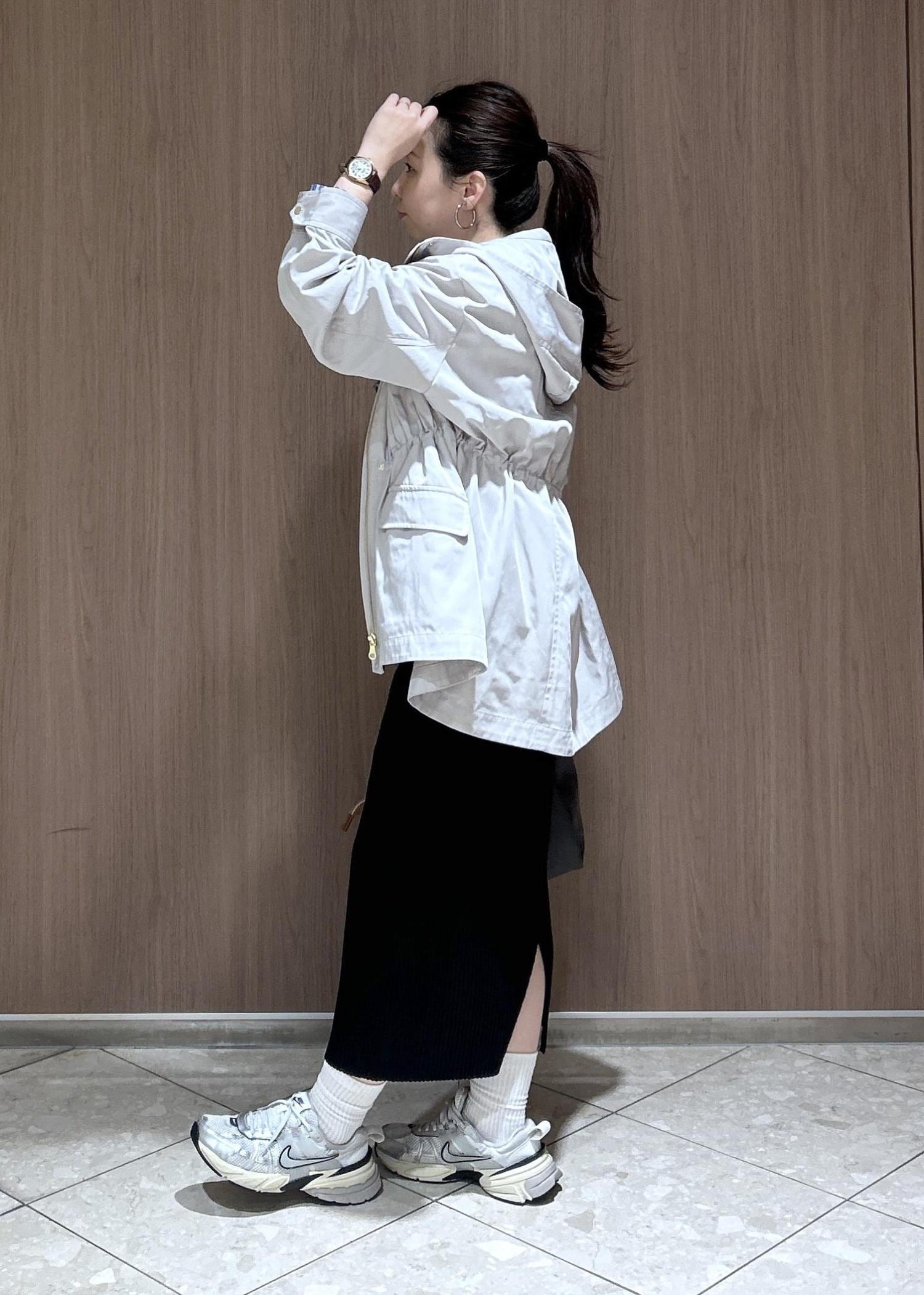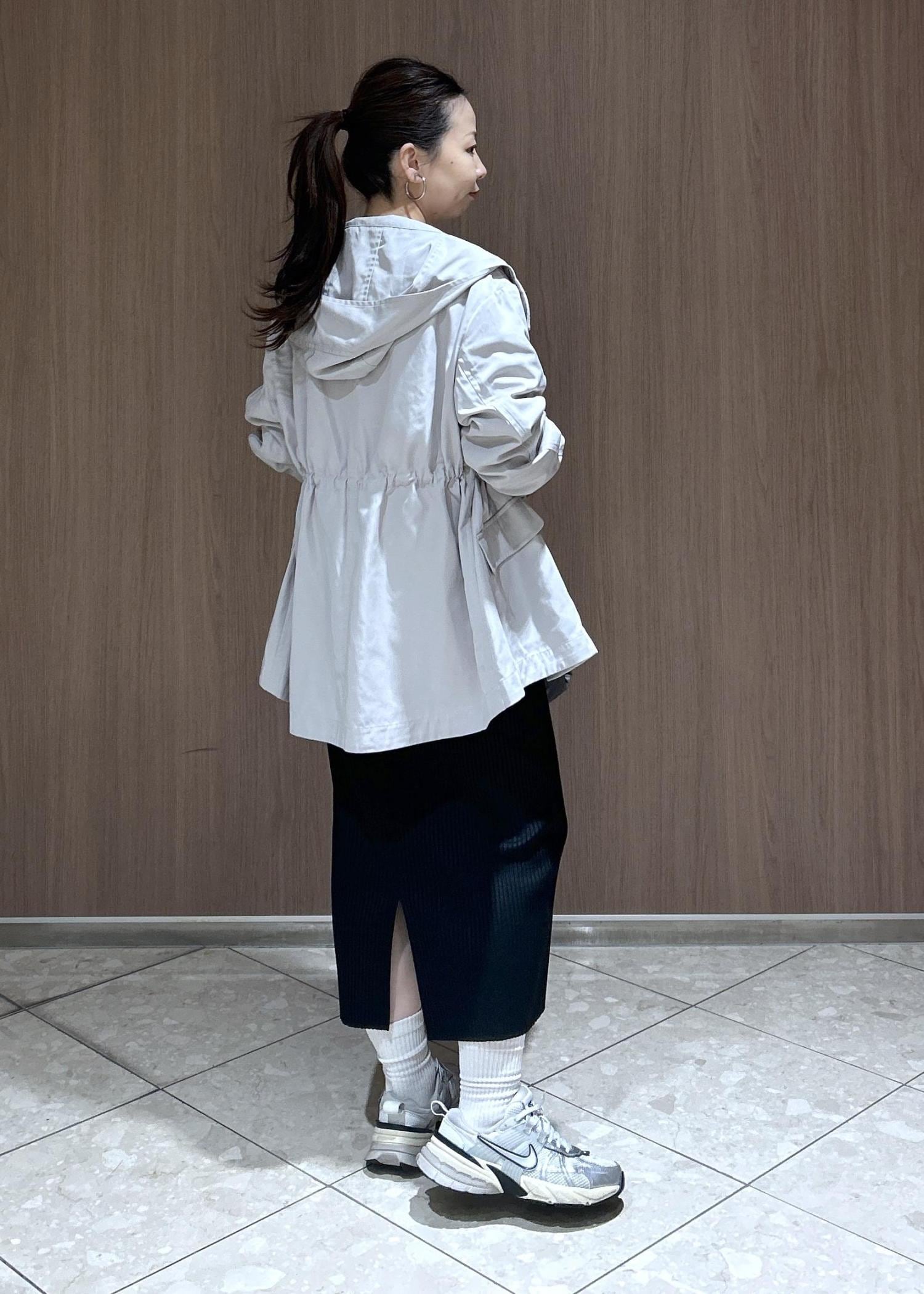 マウンテンパーカーにアイラインスカートでカジュアルだけど女性らしさをプラスしたスタイリングです。