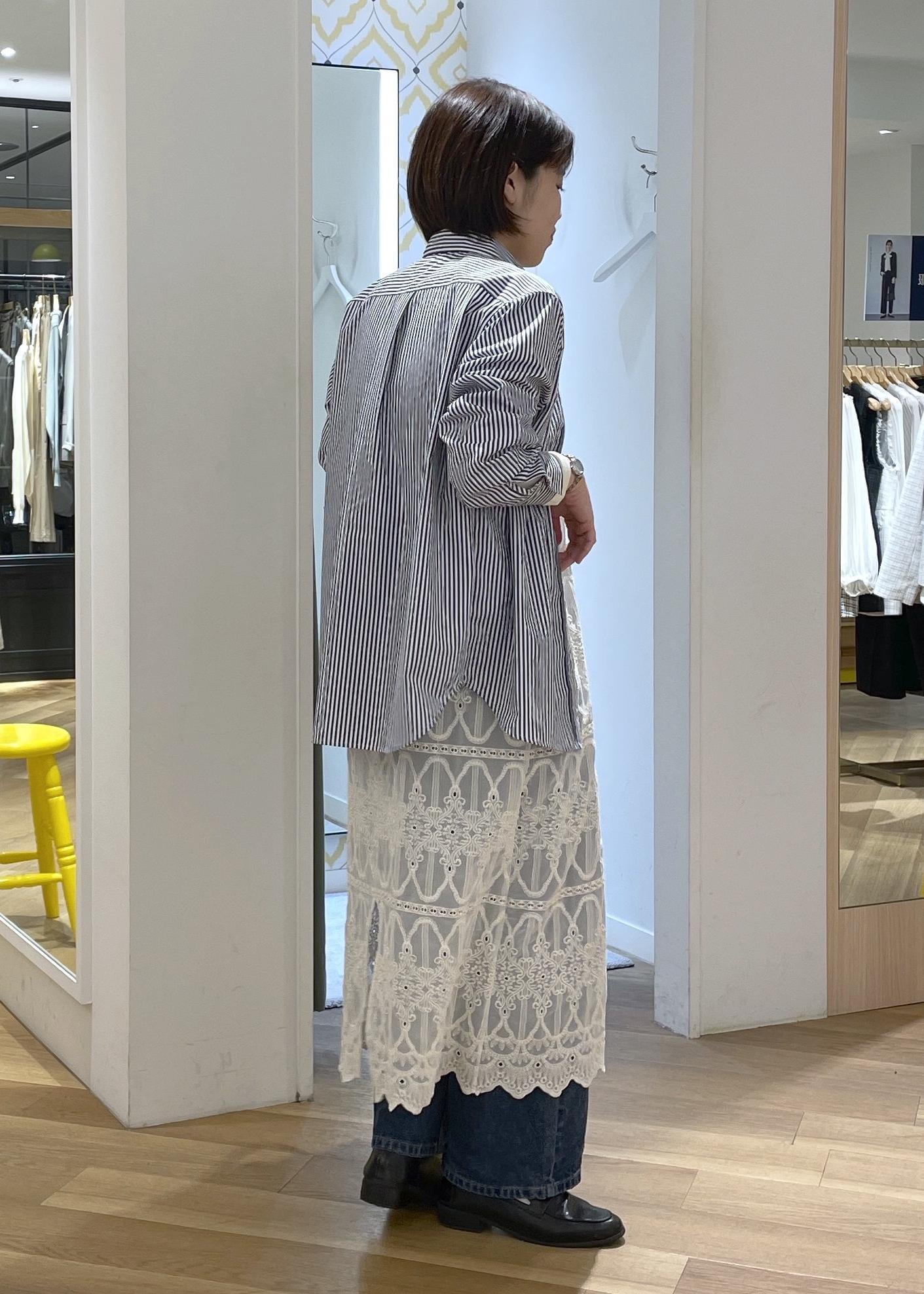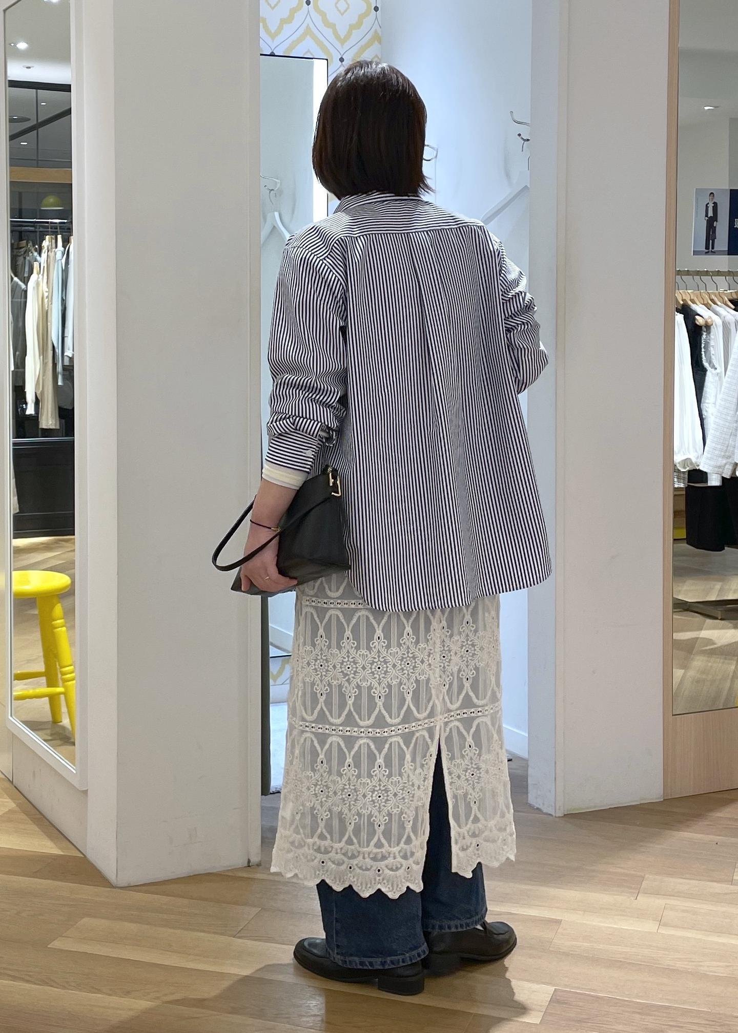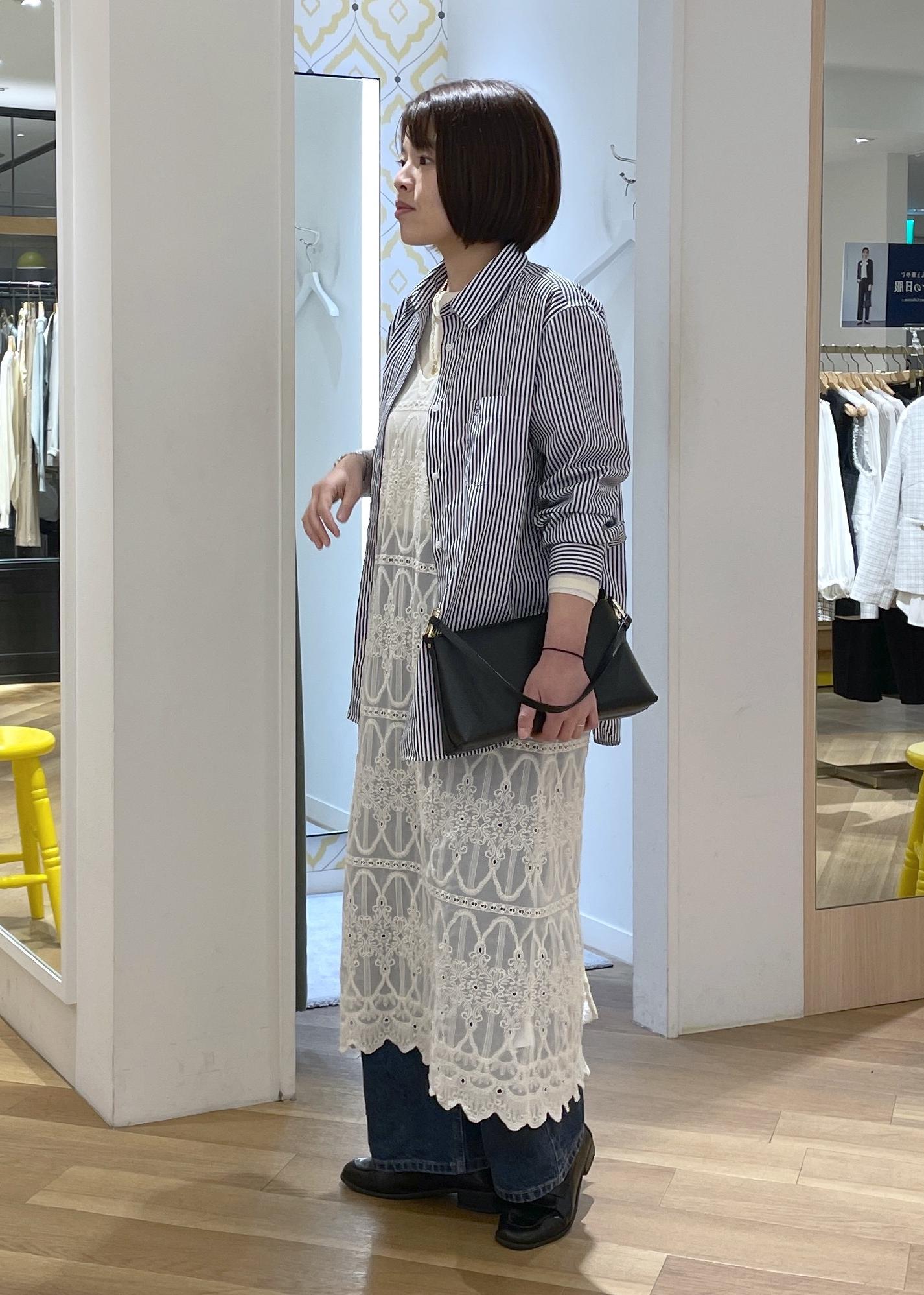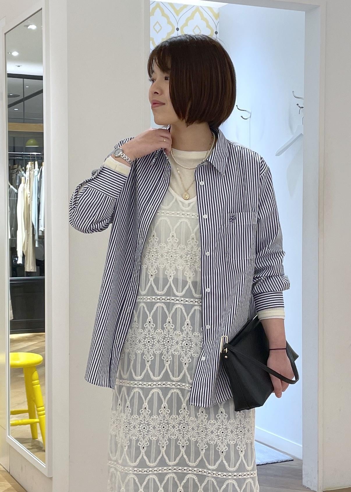 トレンド感のあるレースキャミワンピースのレイヤードコーデに、ストライプのシャツを羽織った、爽やかな休日カジュアルコーデです!
