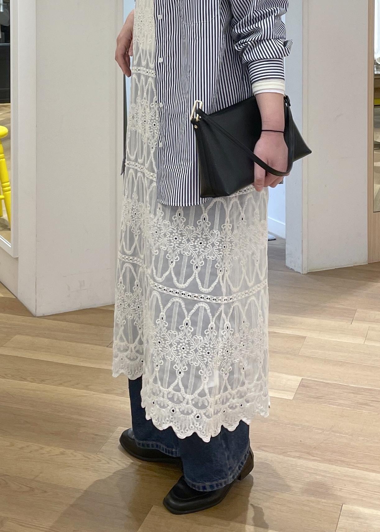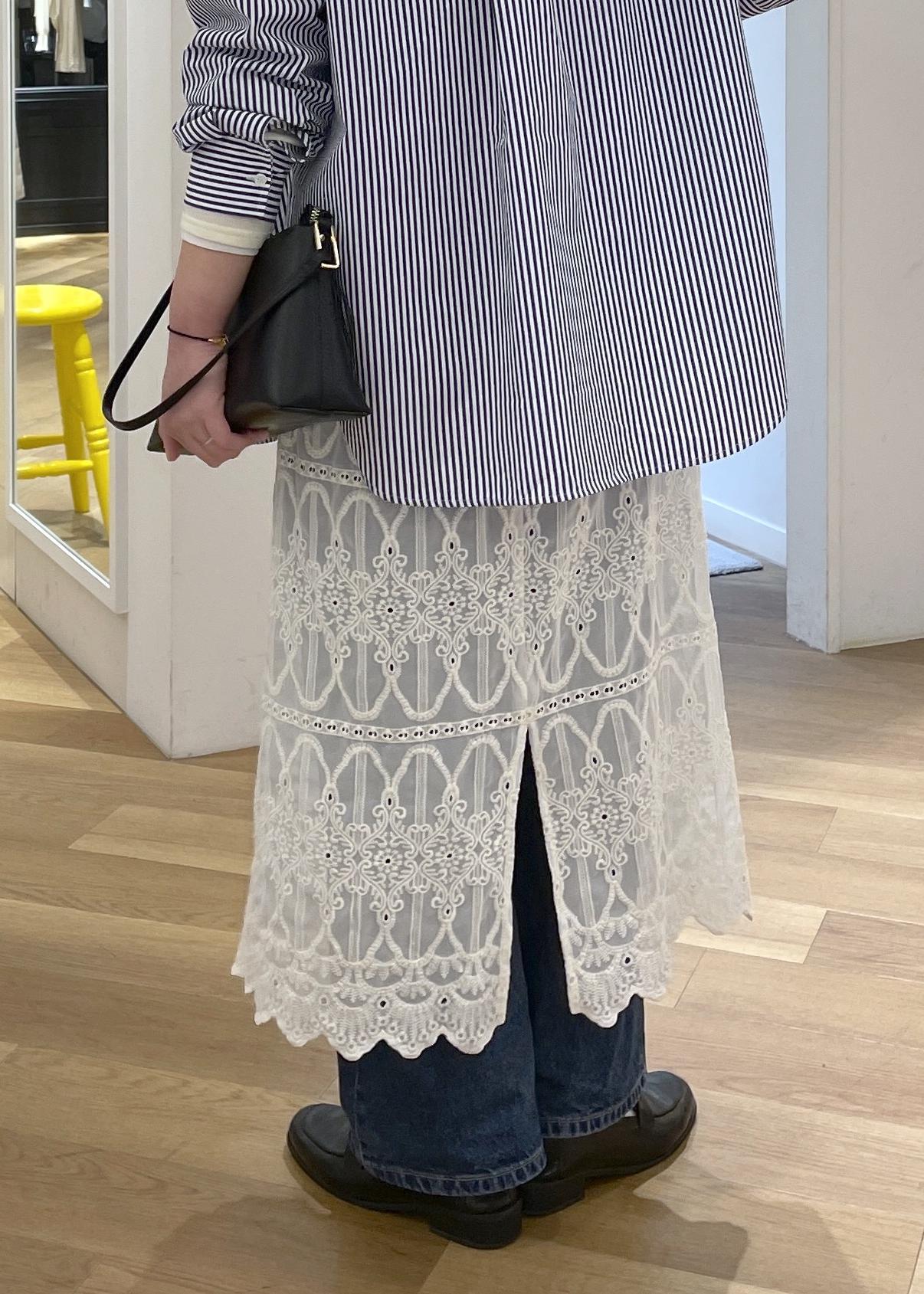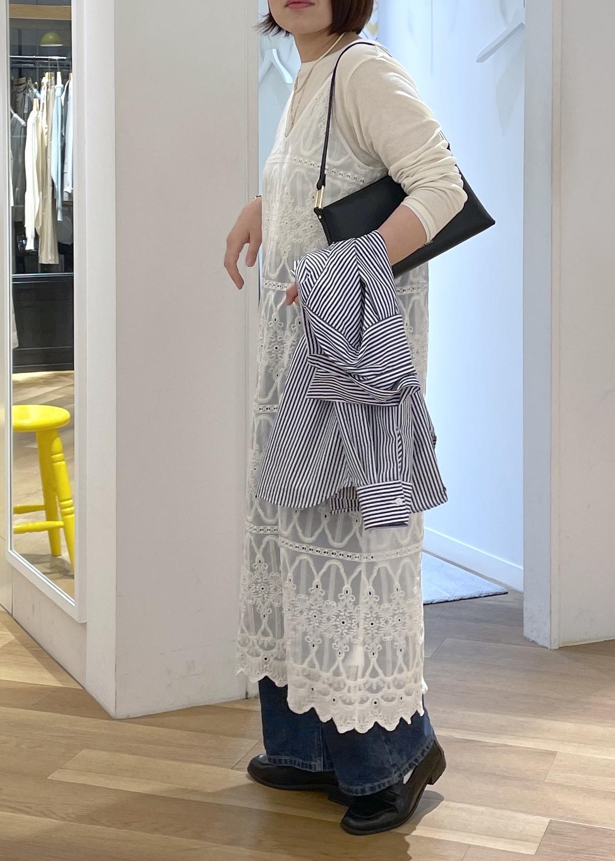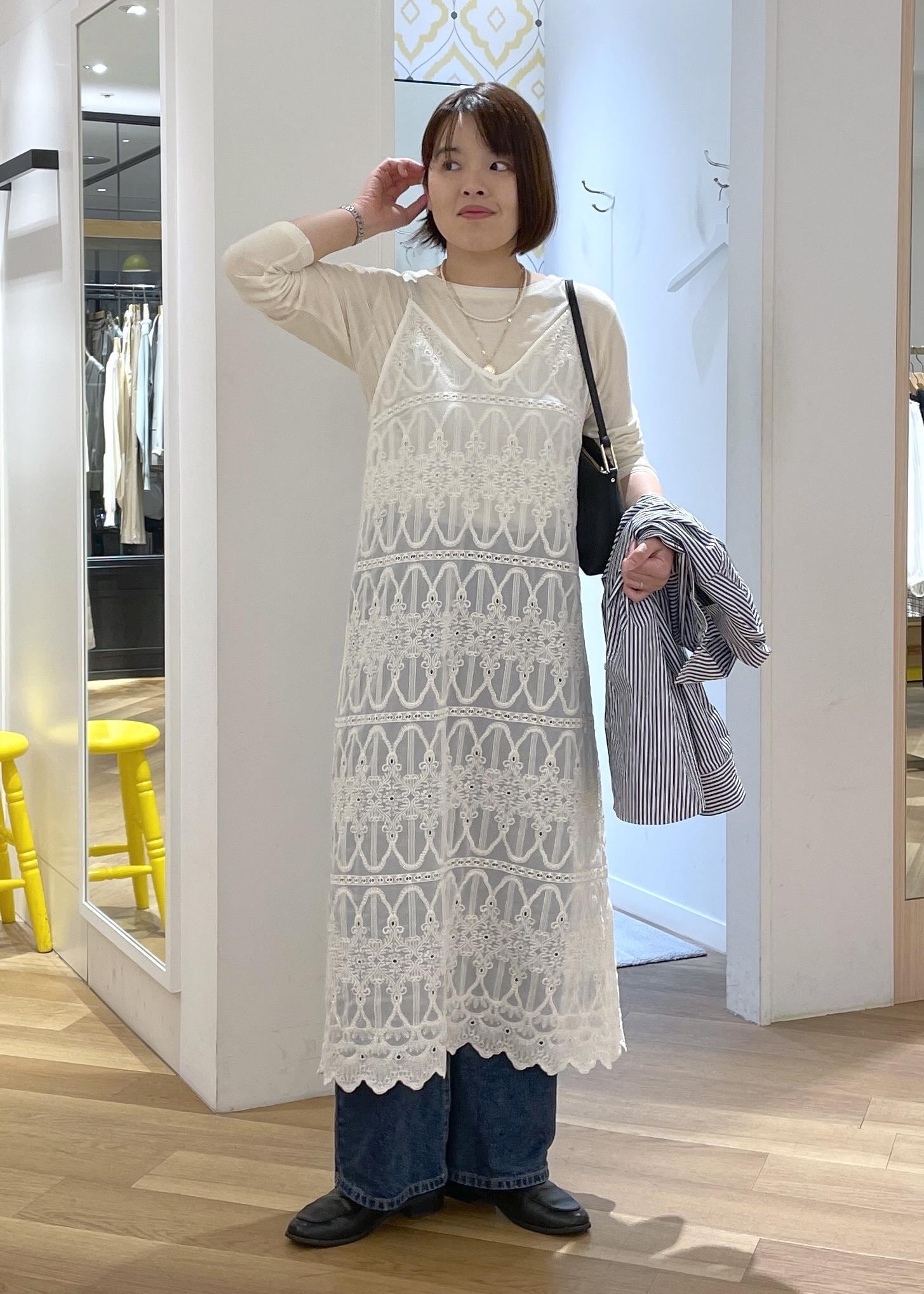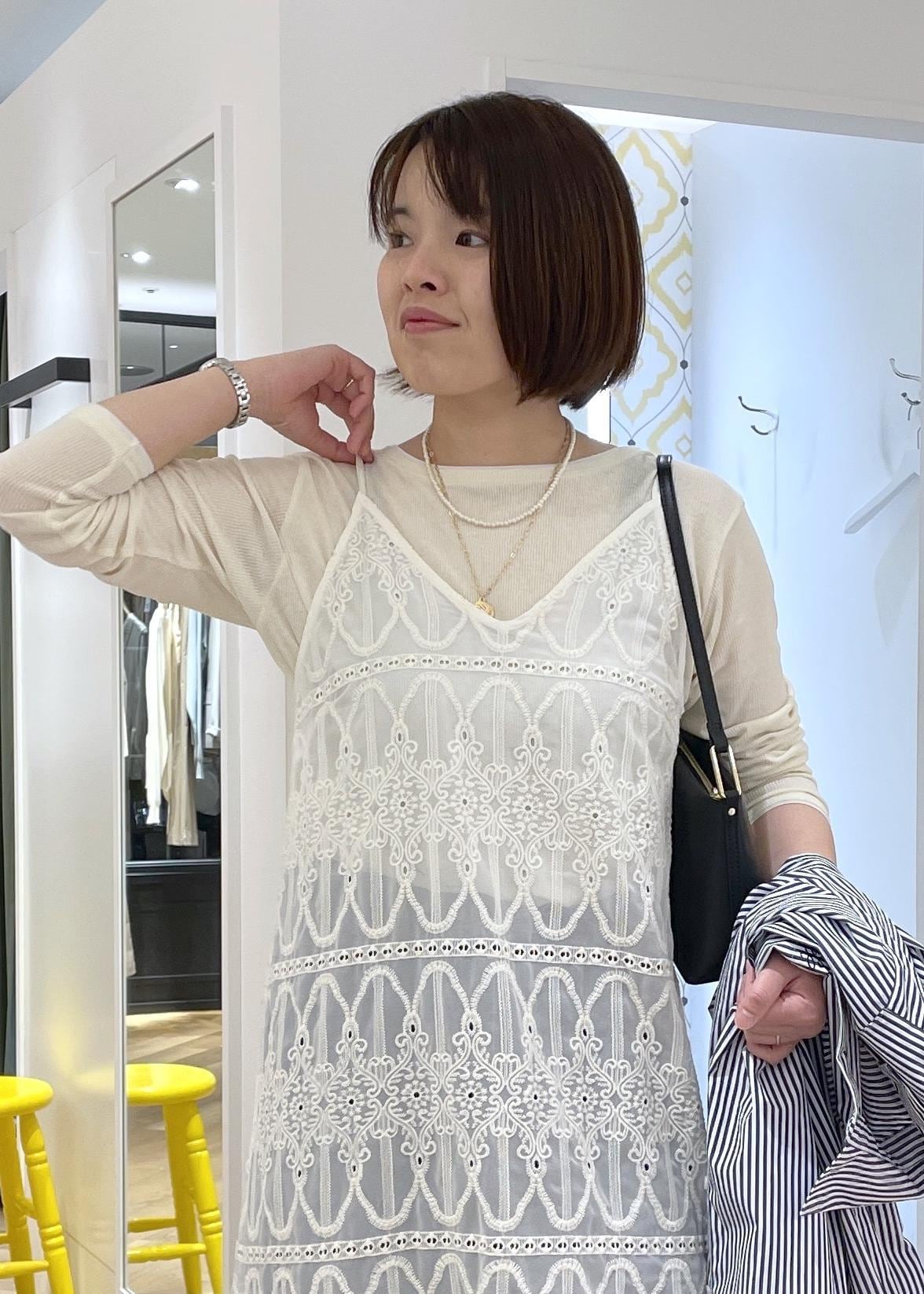 レースキャミワンピの下にはクリームカラーのシアーカットソーを重ねて春っぽさをプラス◎