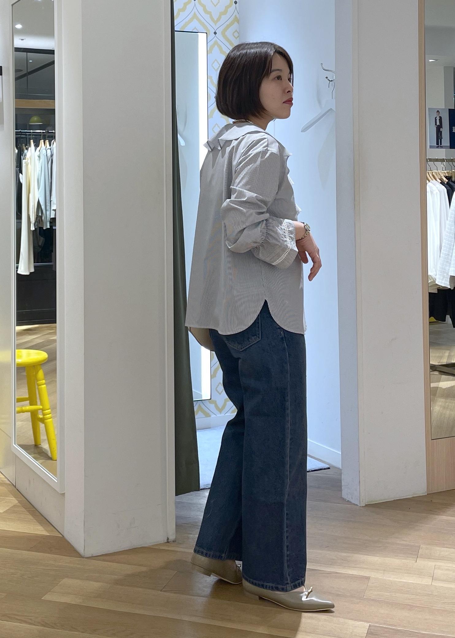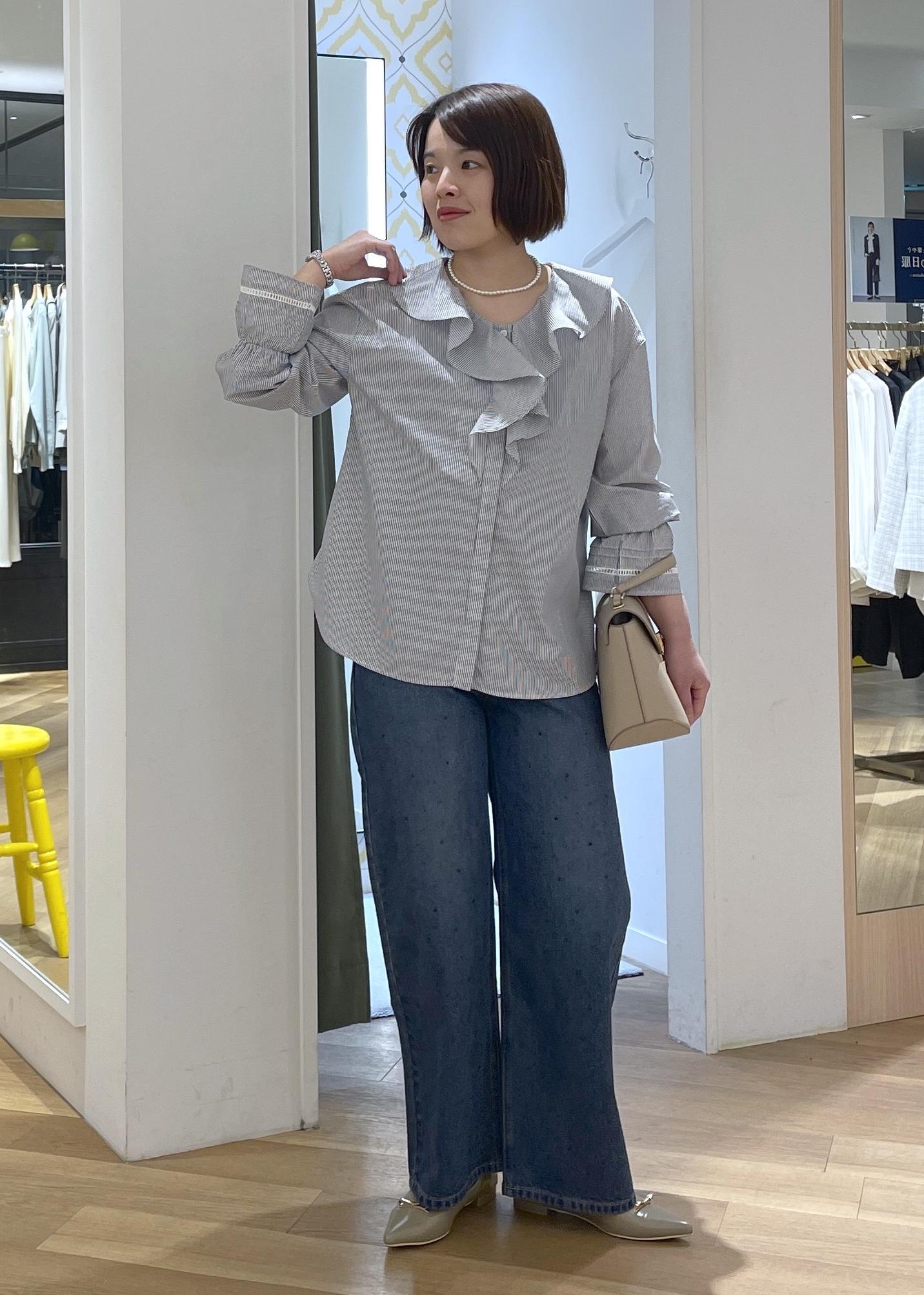 フェミニンな印象のラッフルブラウスにビジューデニムを合わせたカジュアルコーデです!