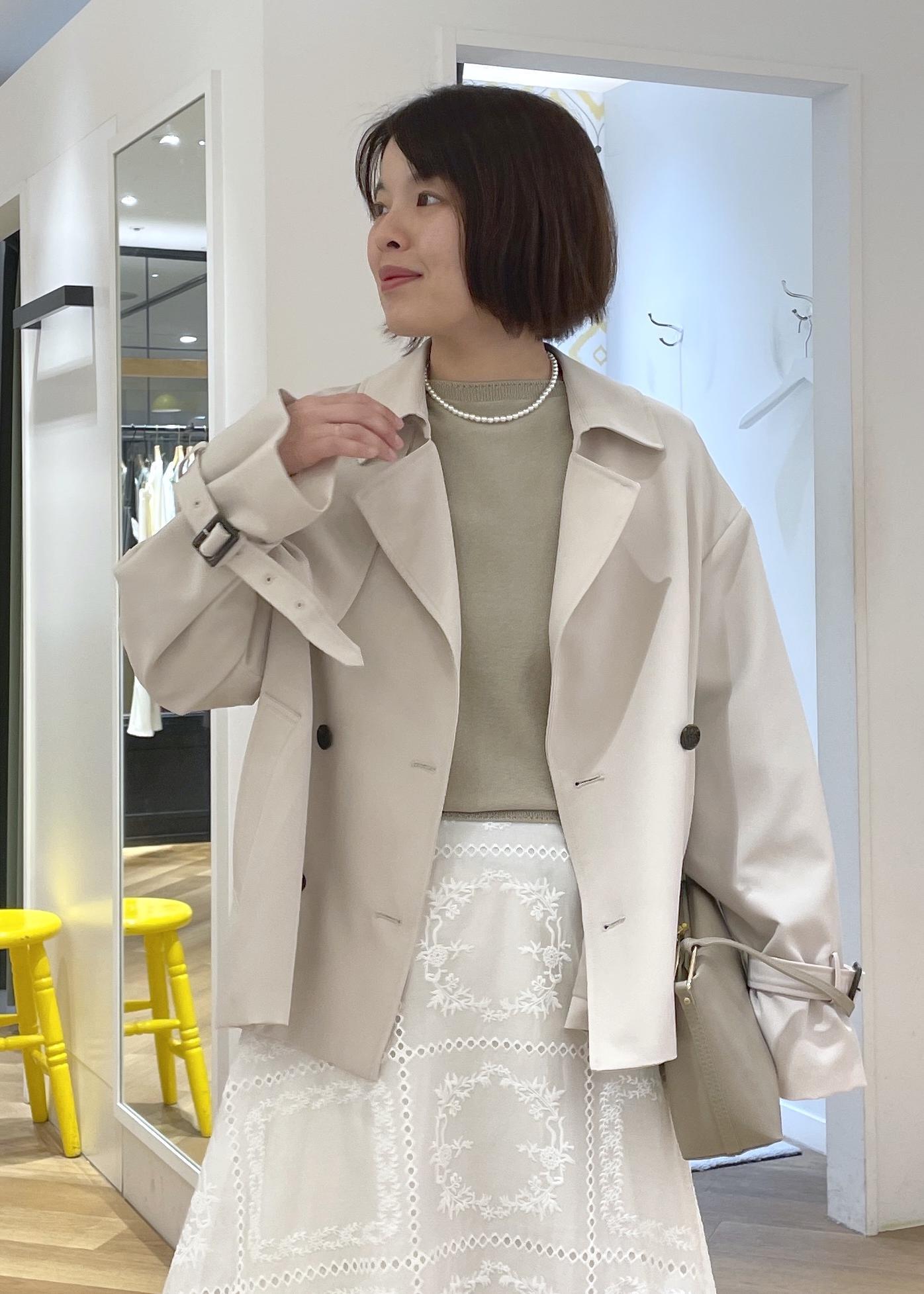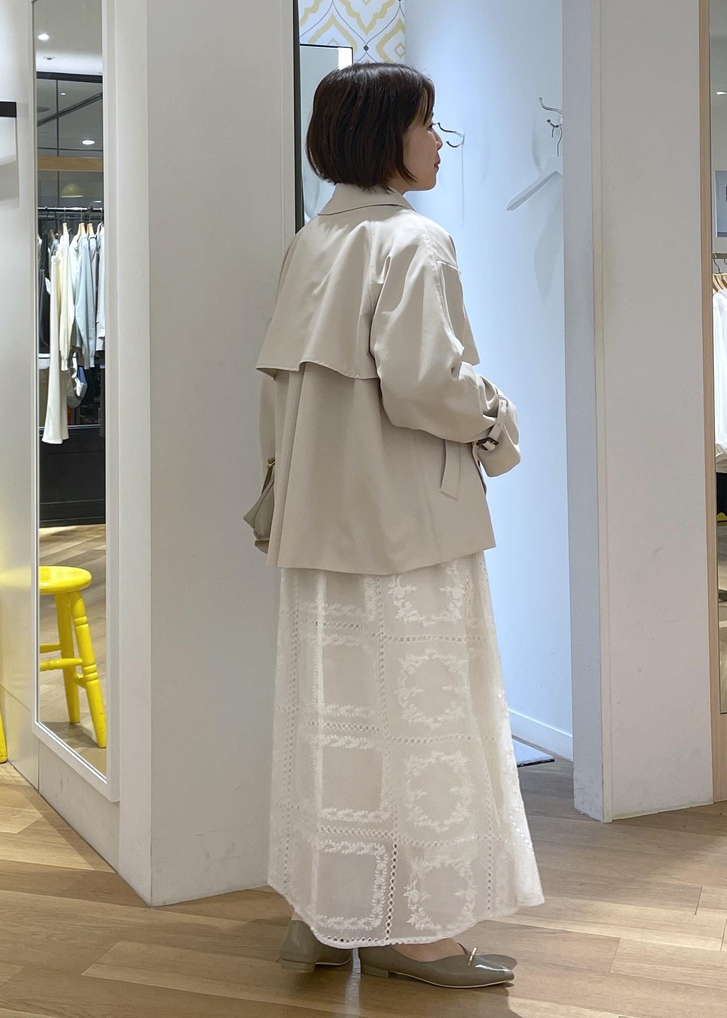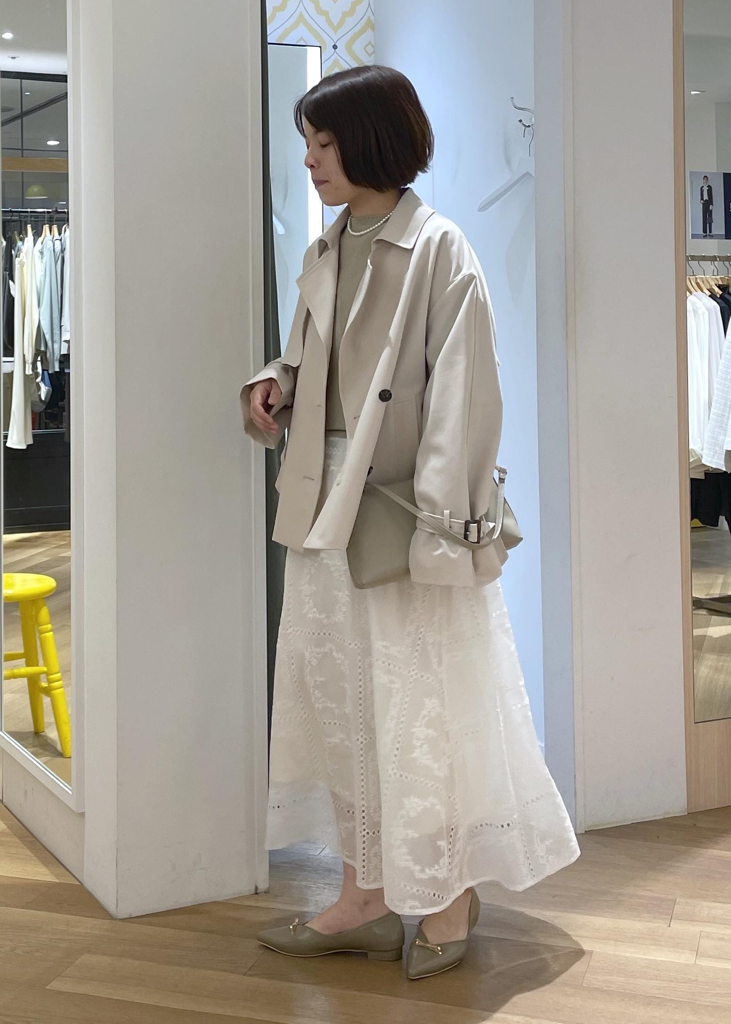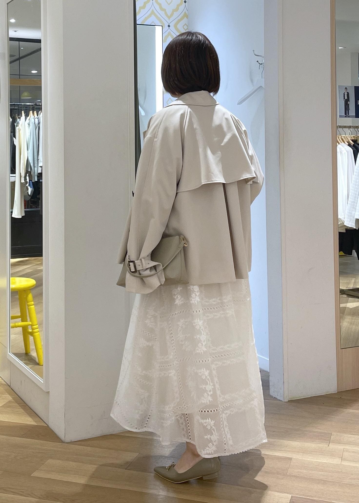 きれい見えするショートトレンチにレーススカートを合わせた、レディな大人カジュアルコーデです!