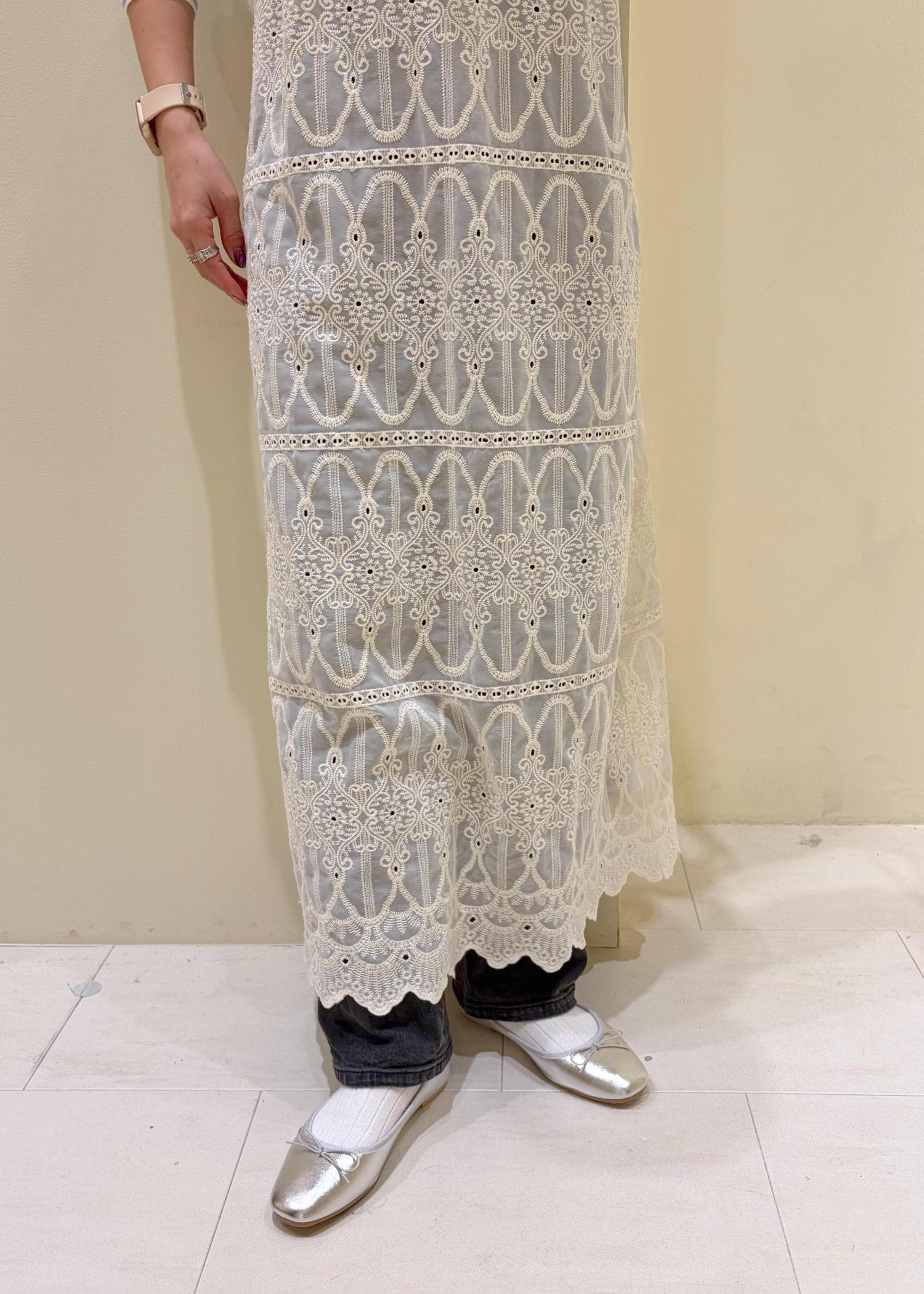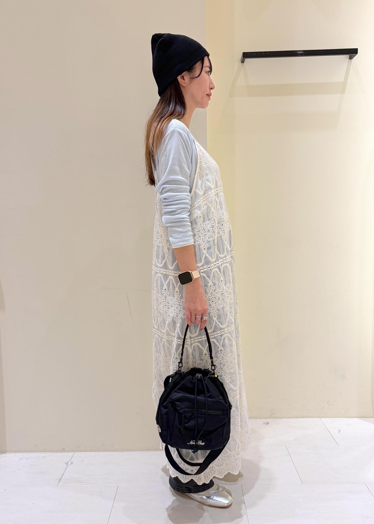 レースのワンピースをレイヤードした春コーデ。