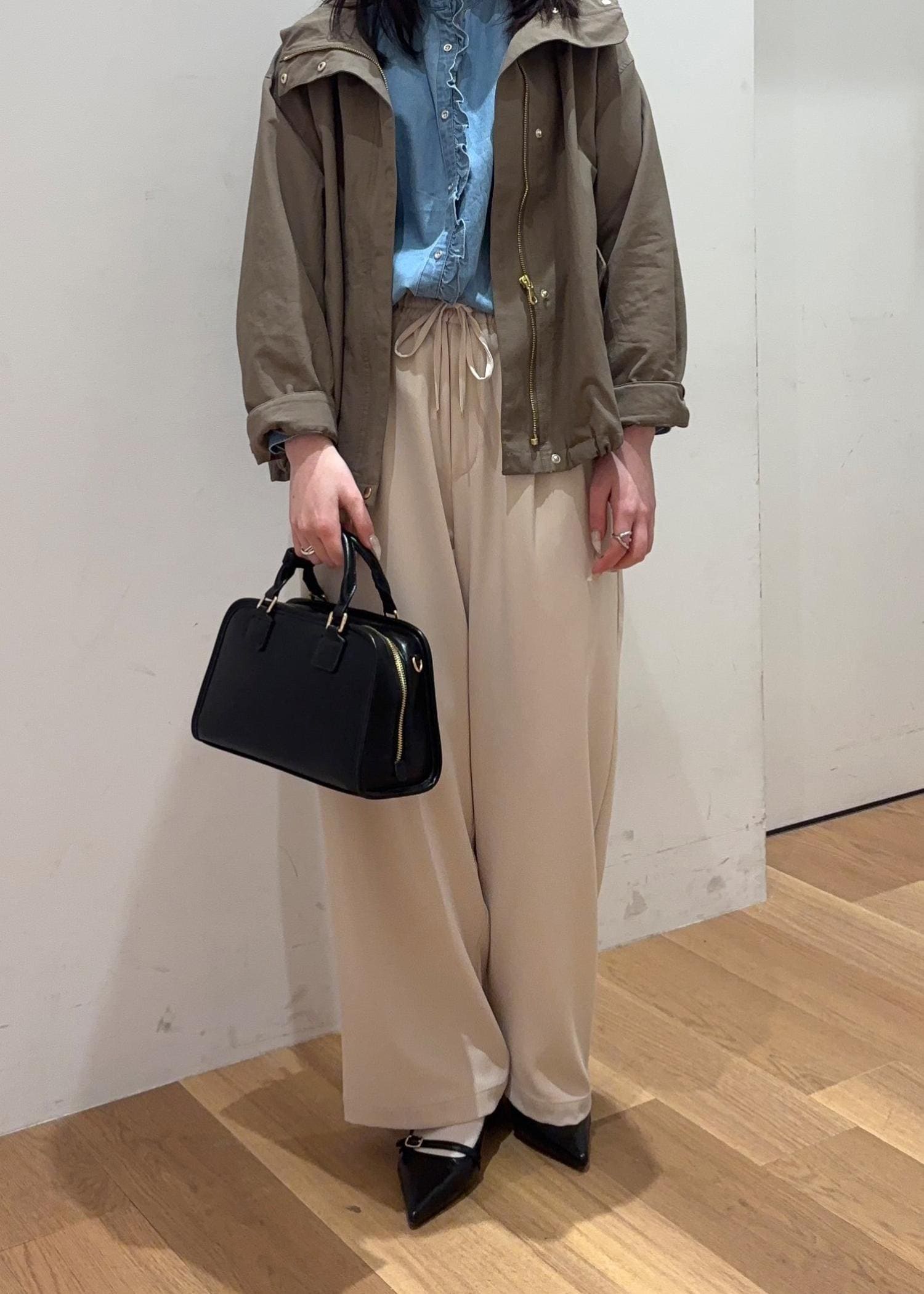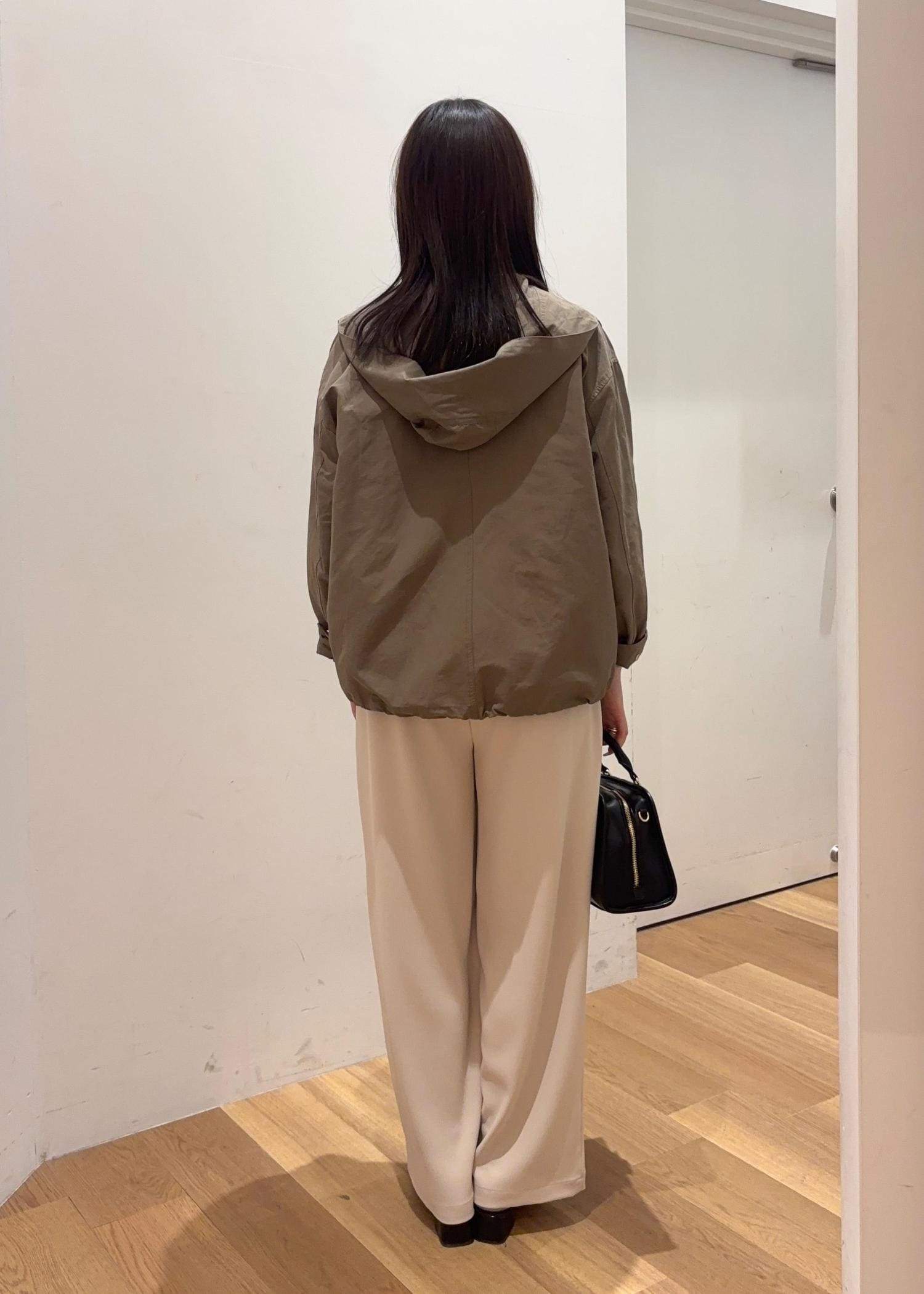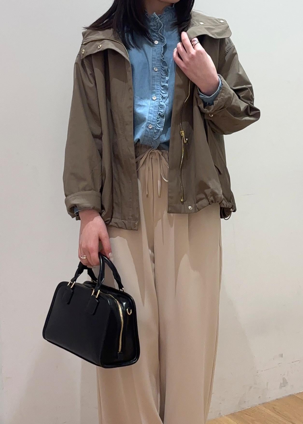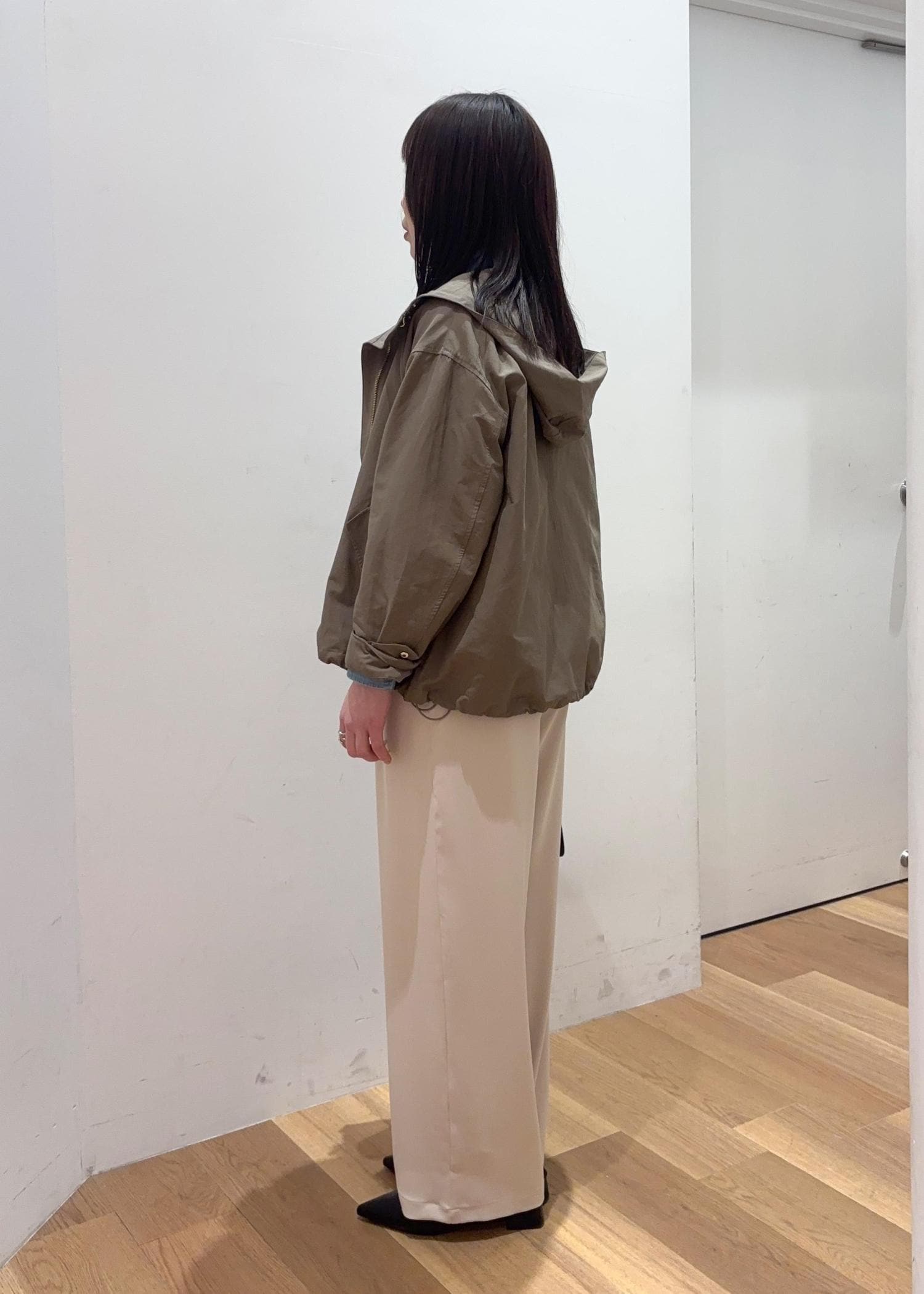 撥水加工で雨の日でも安心して着ていただけます。裾コード紐をひく事で、シルエットがバルーン上に変化します。