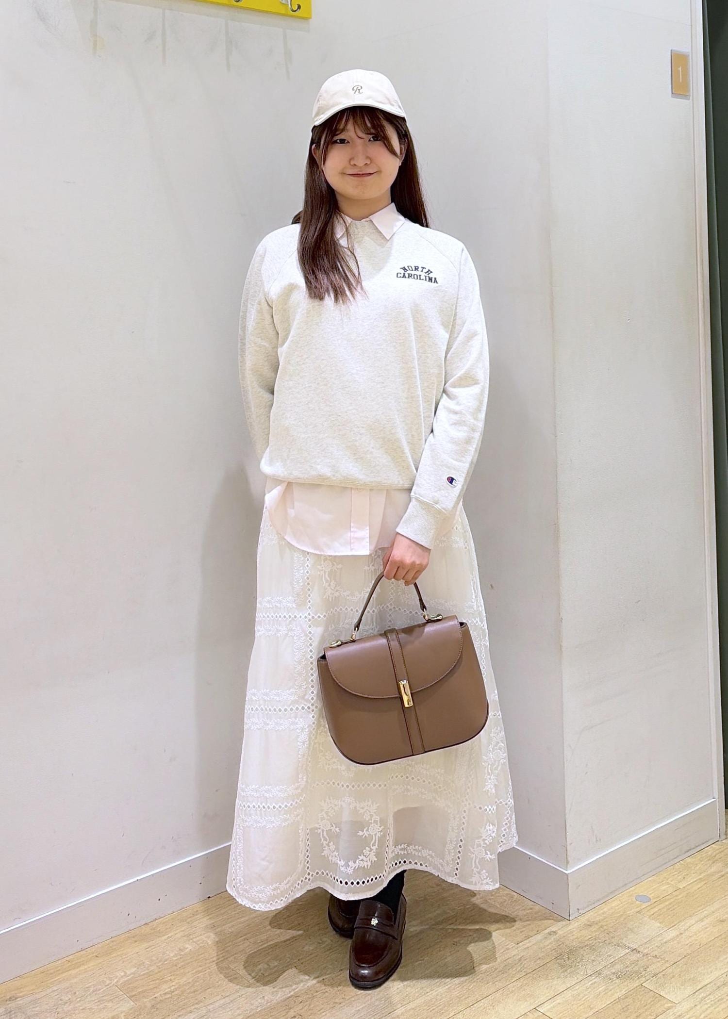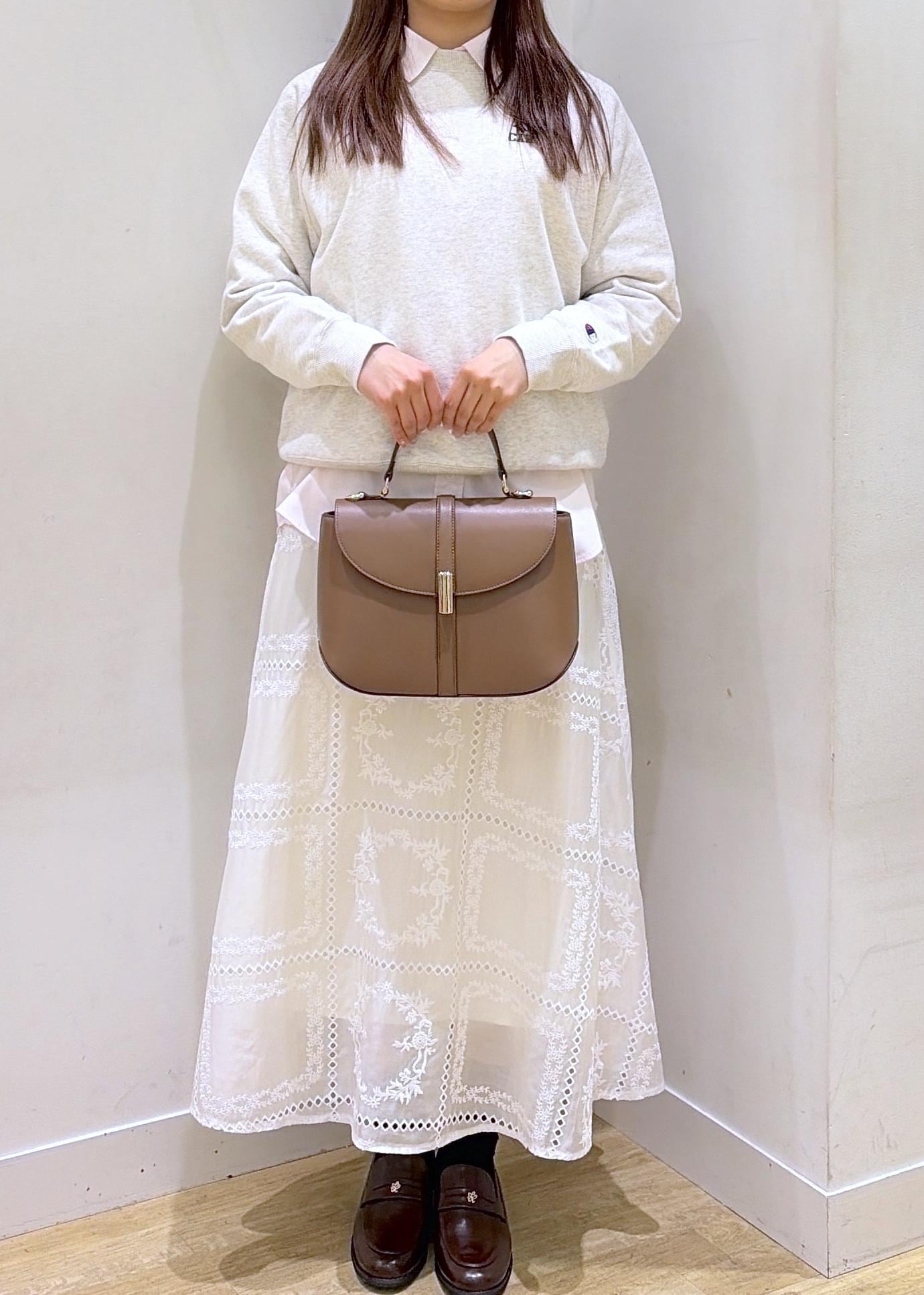 スウェットとスカート合わせは女性らしさとカジュアルさを兼ね備え大人かわいいを演出。