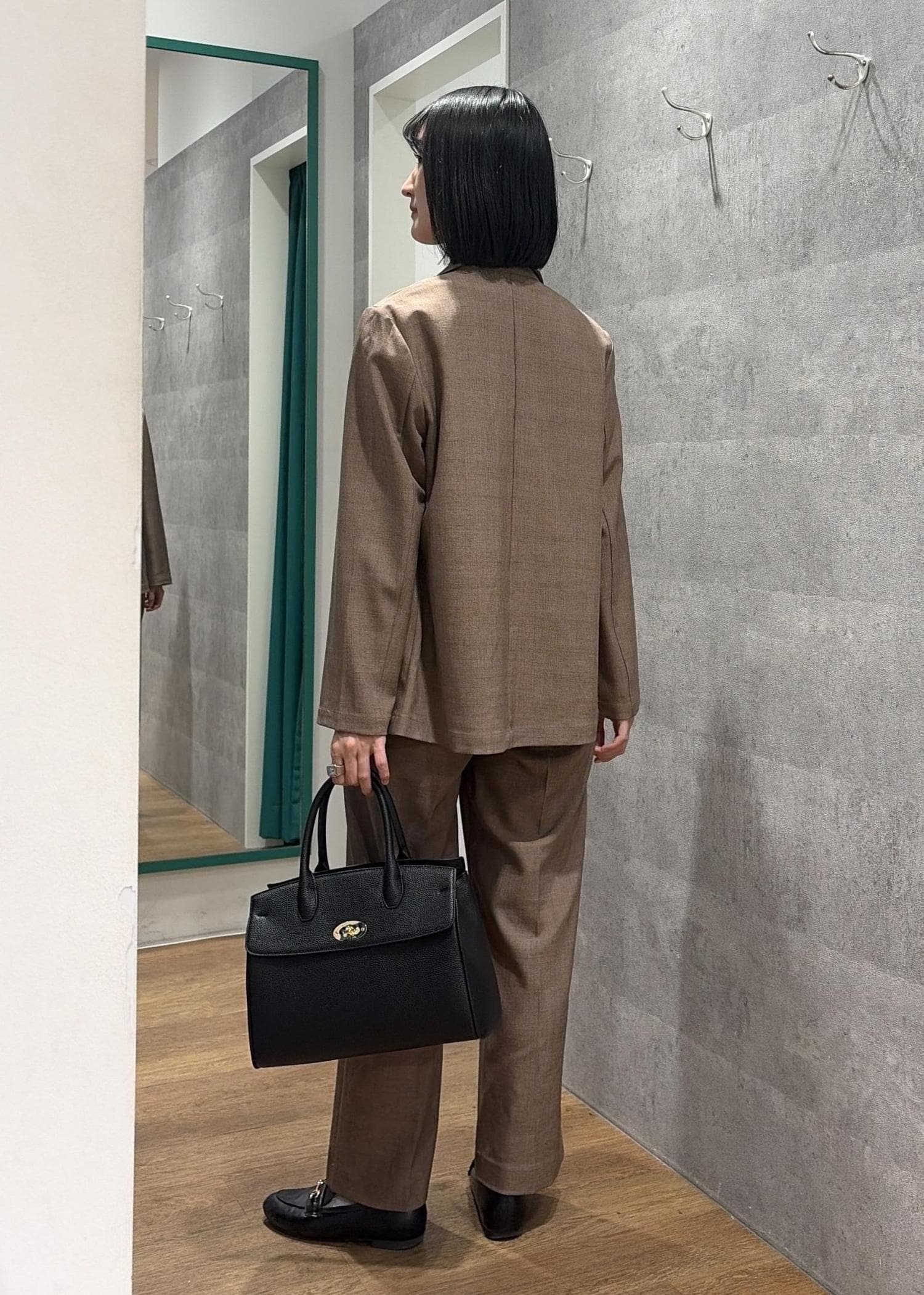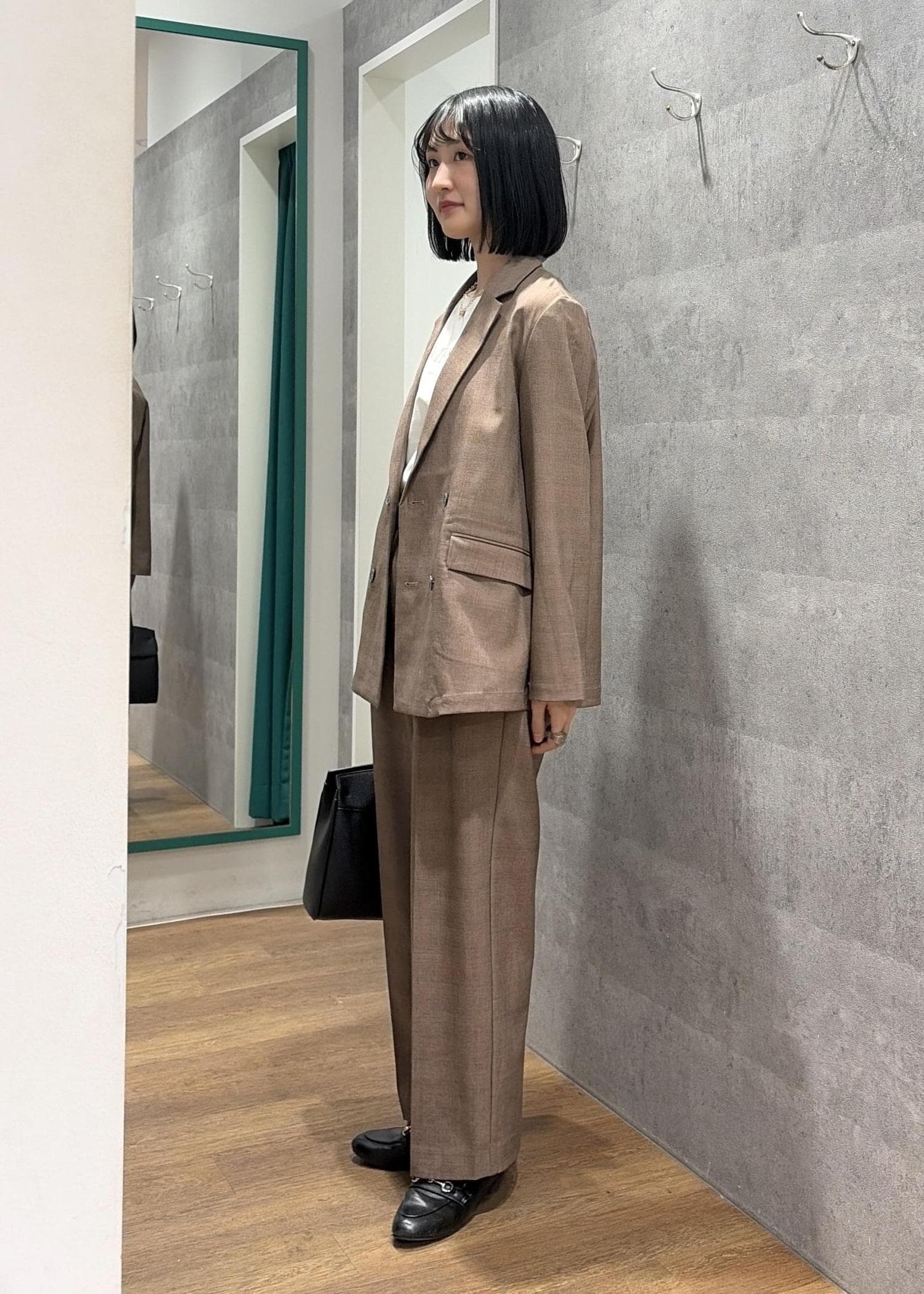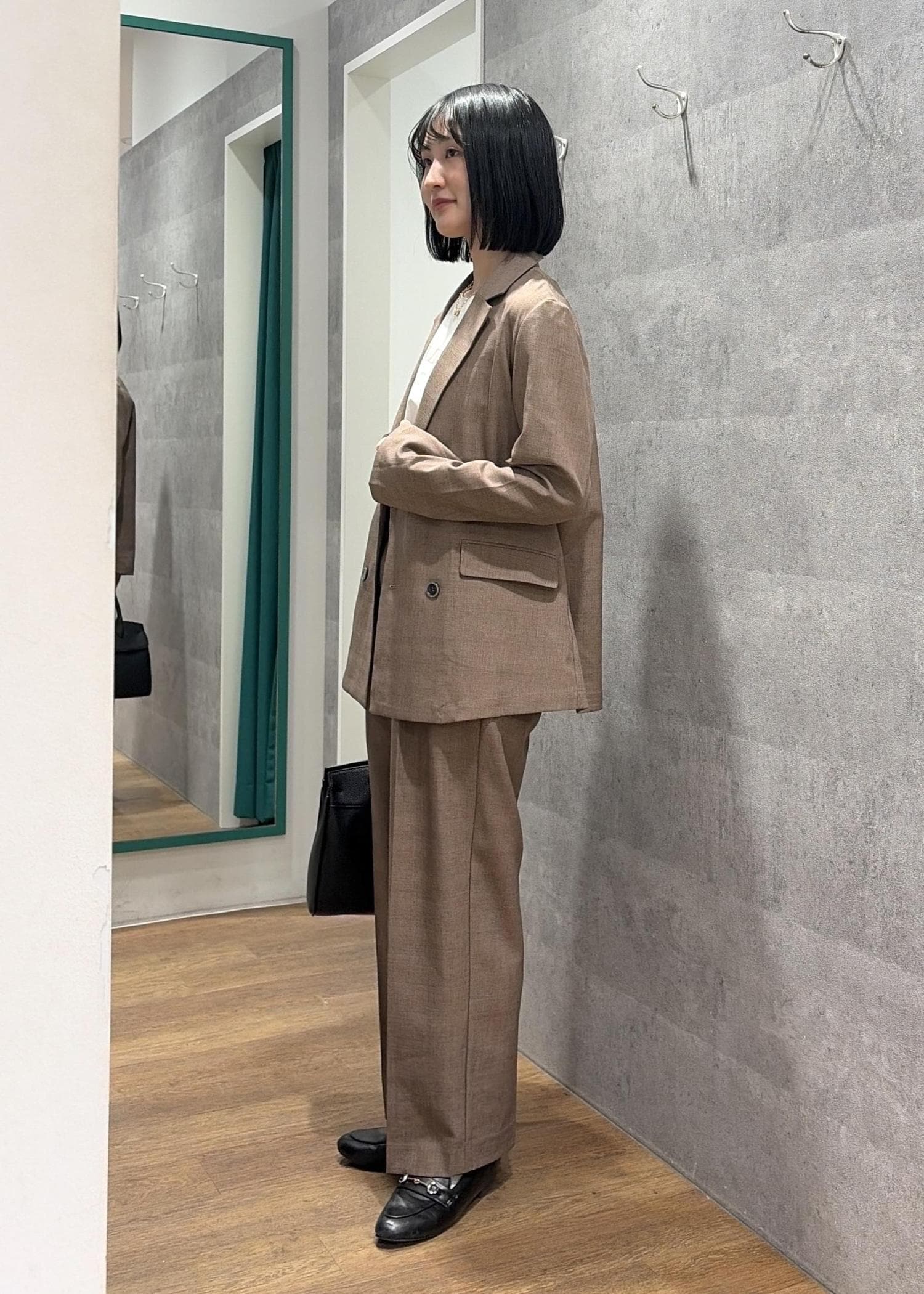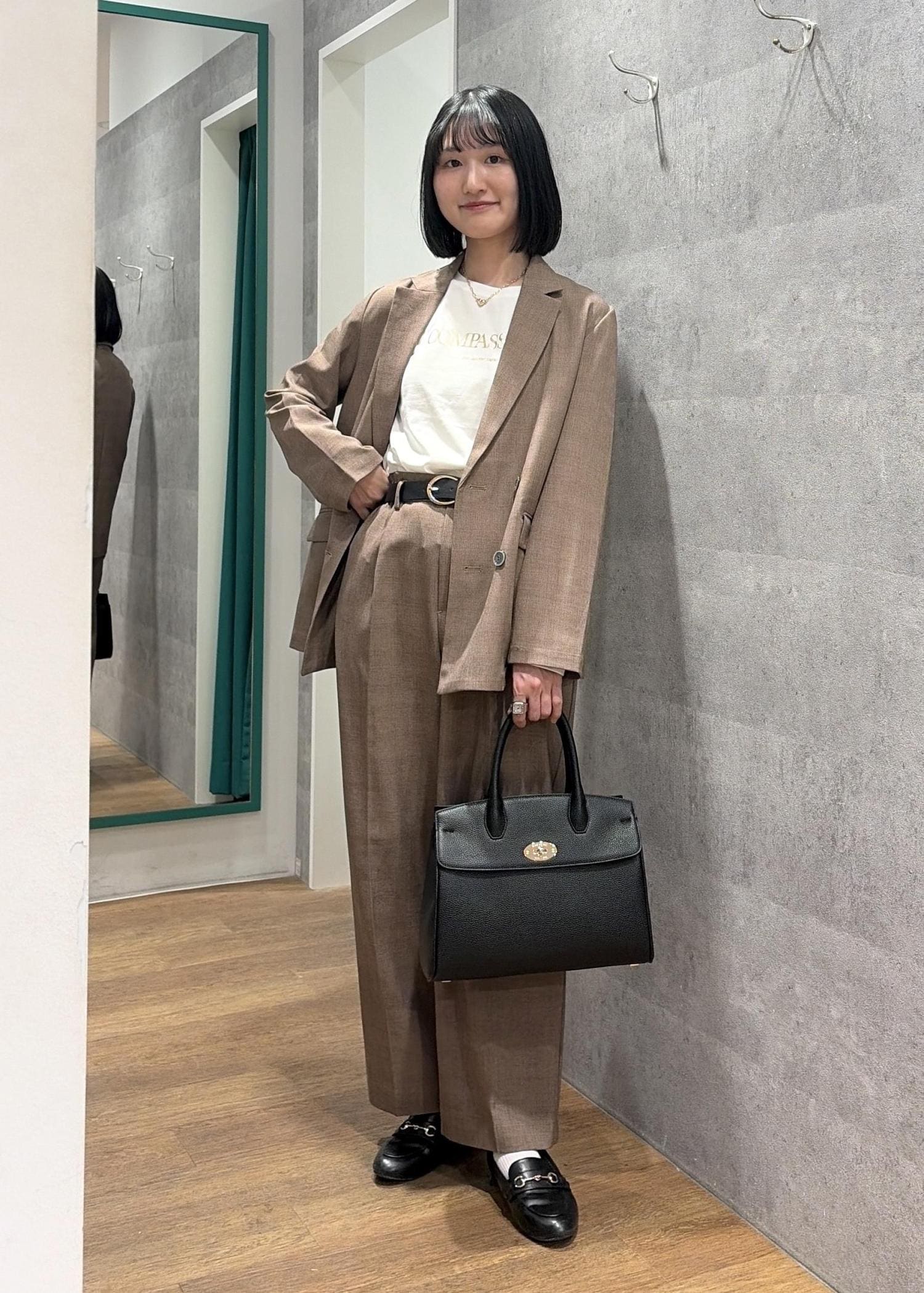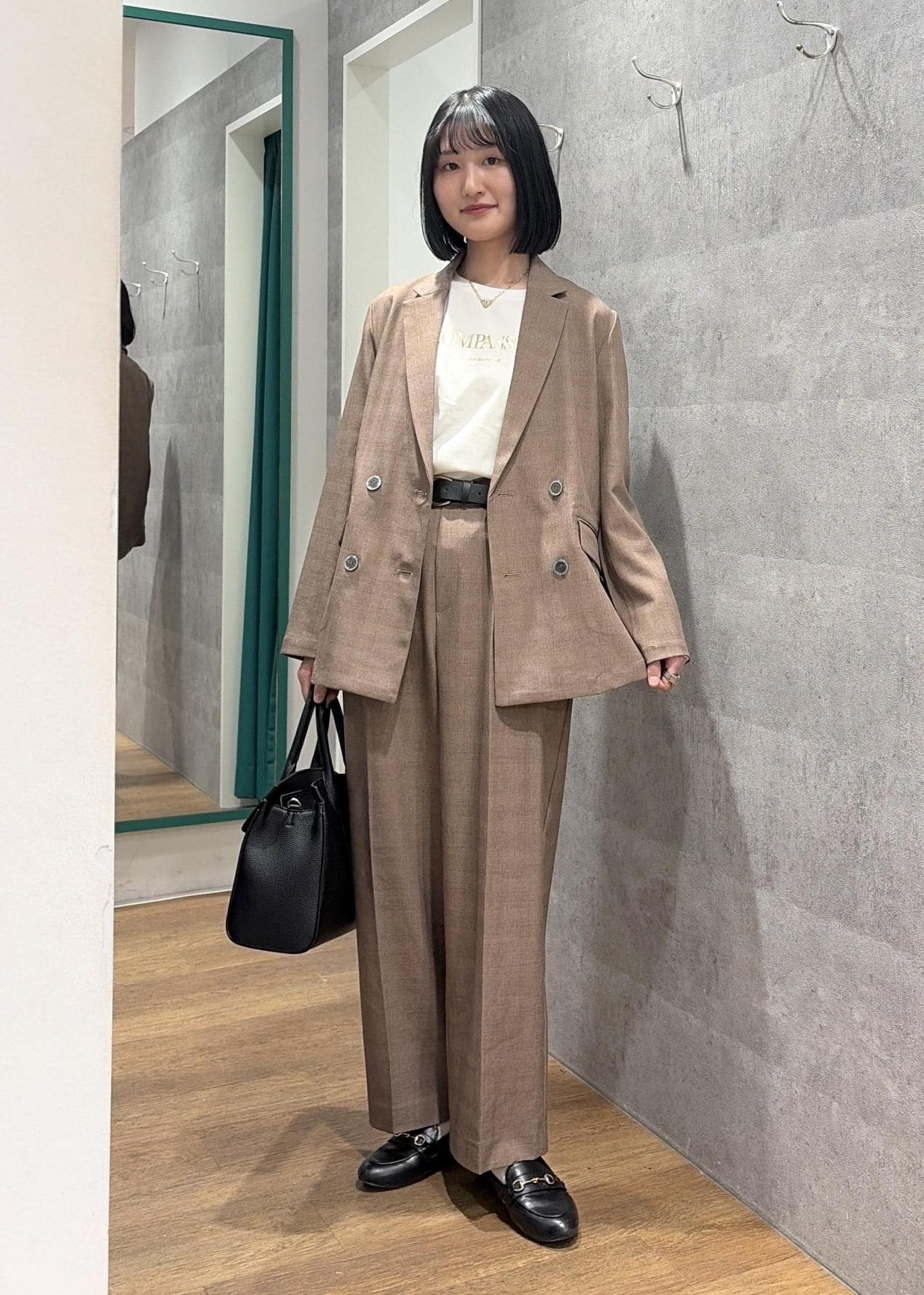 明るいブラウンが春らしい印象のオフィスカジュアルコーデ。