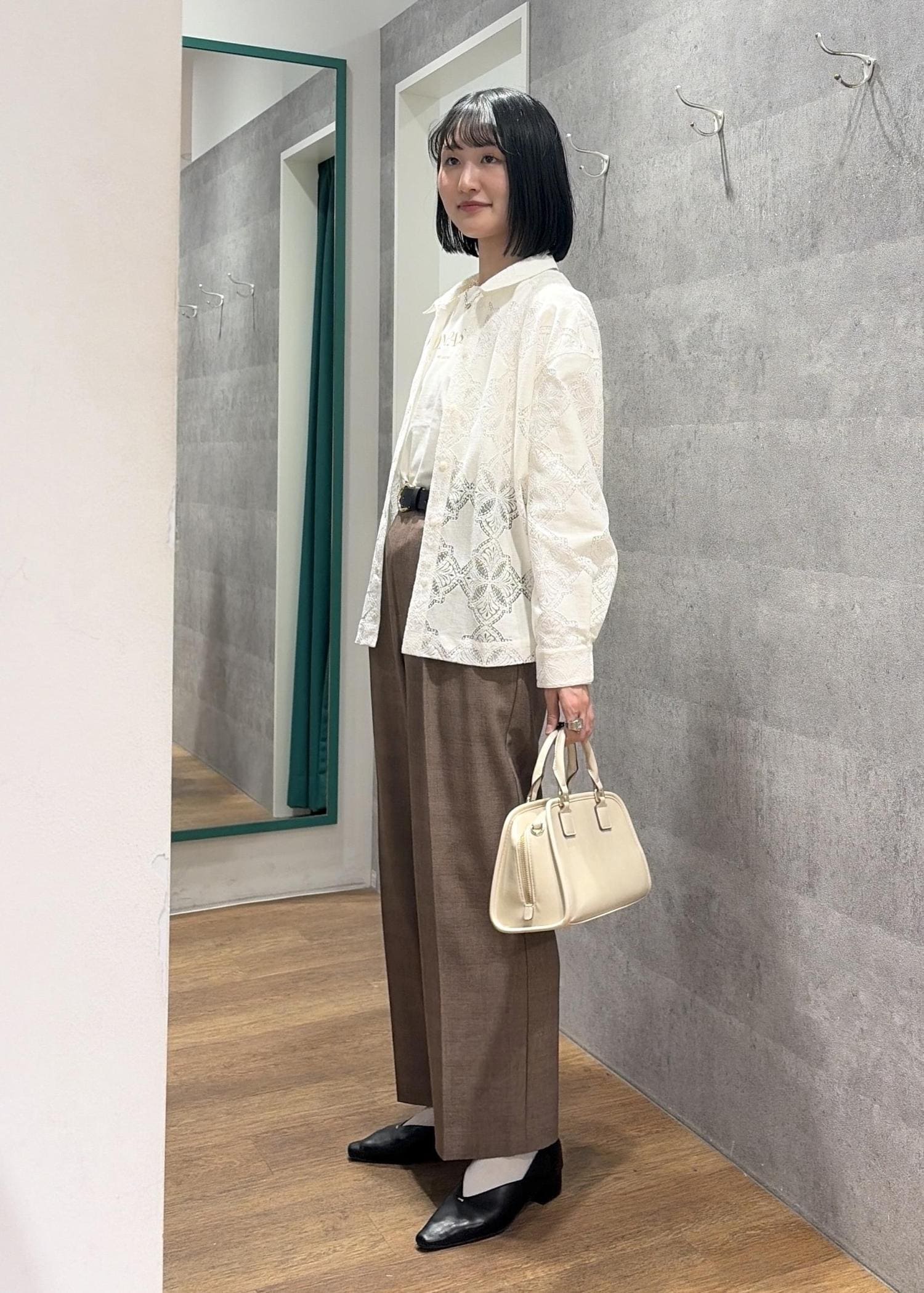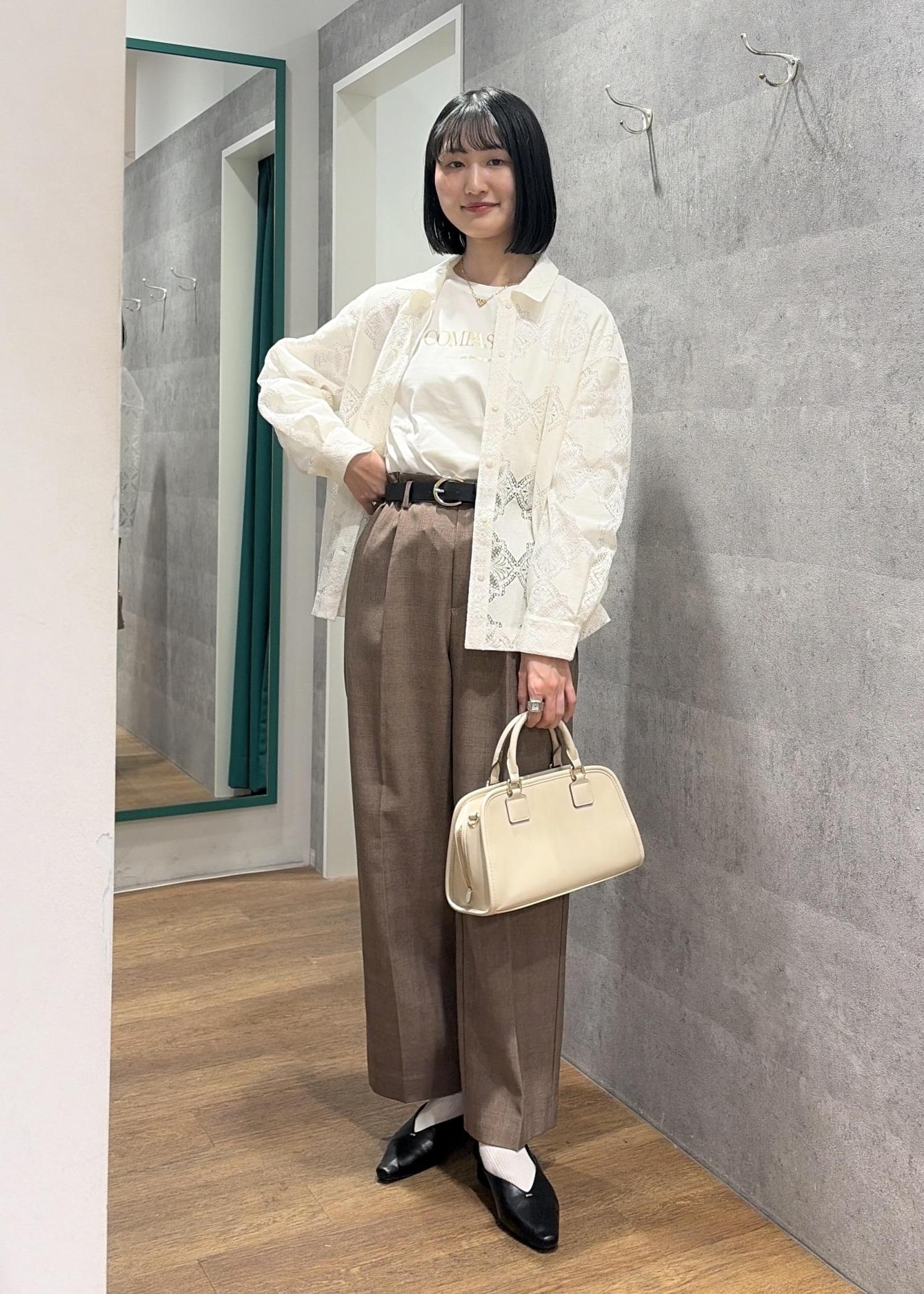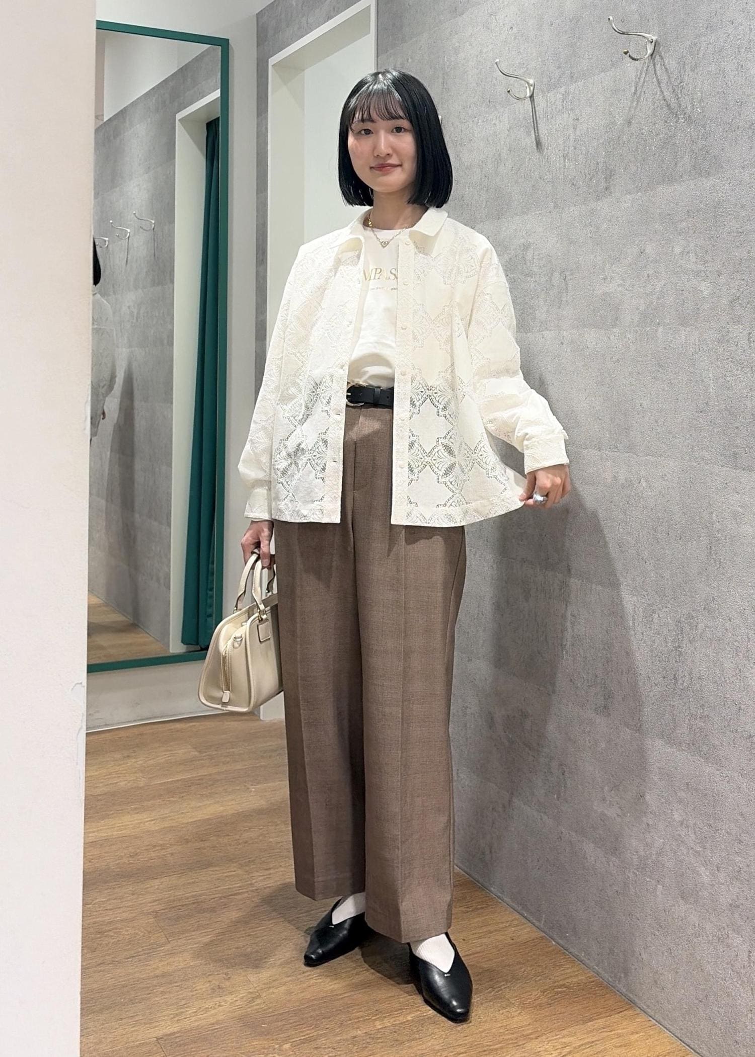 レースシャツとロゴTシャツでカジュアルダウンさせたきれいめコーデです。