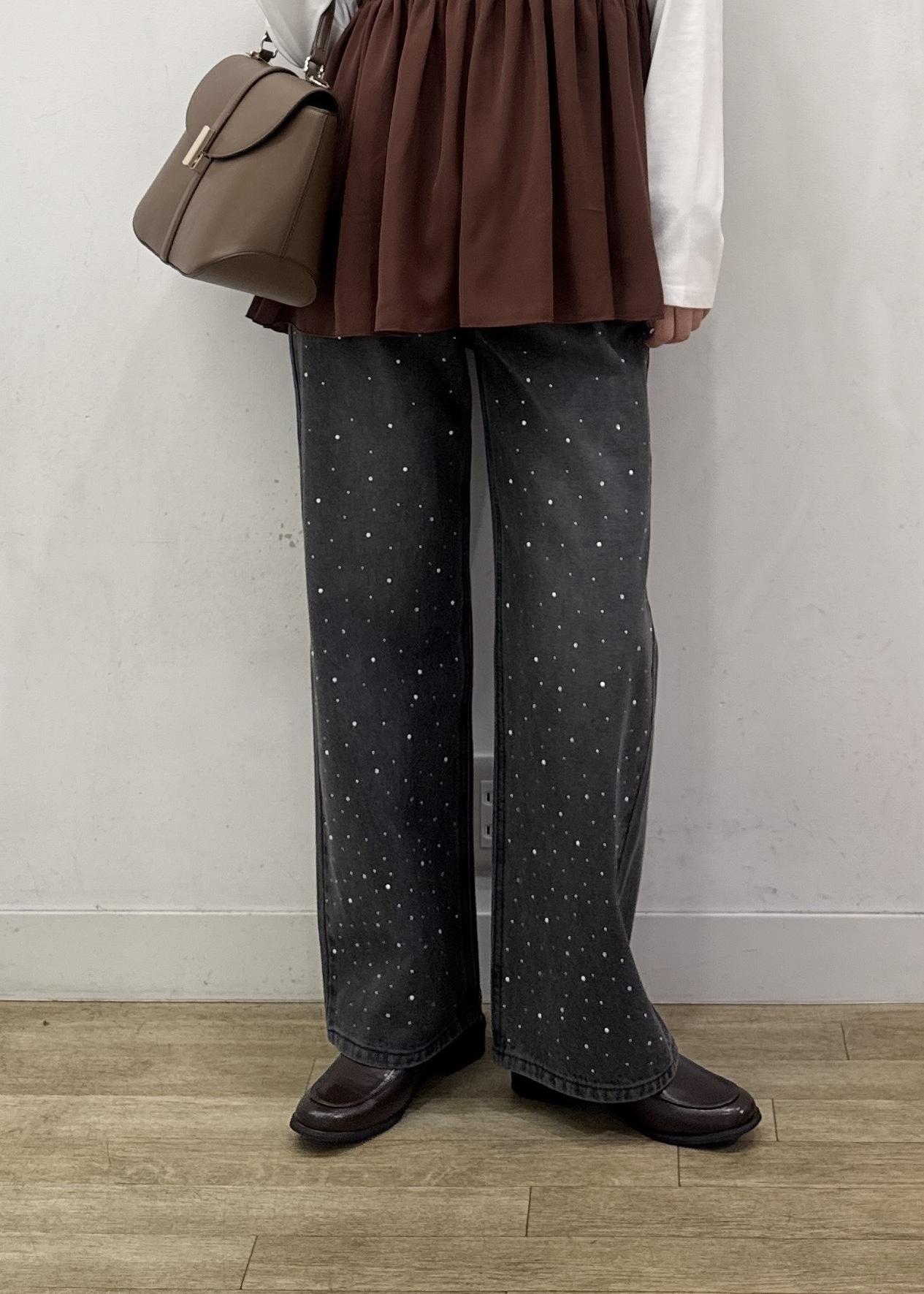脚のラインは拾わないワイドシルエットで、カジュアルになりがちなデニムもビジューとパールデザインで華やかに着ていただけます。 -