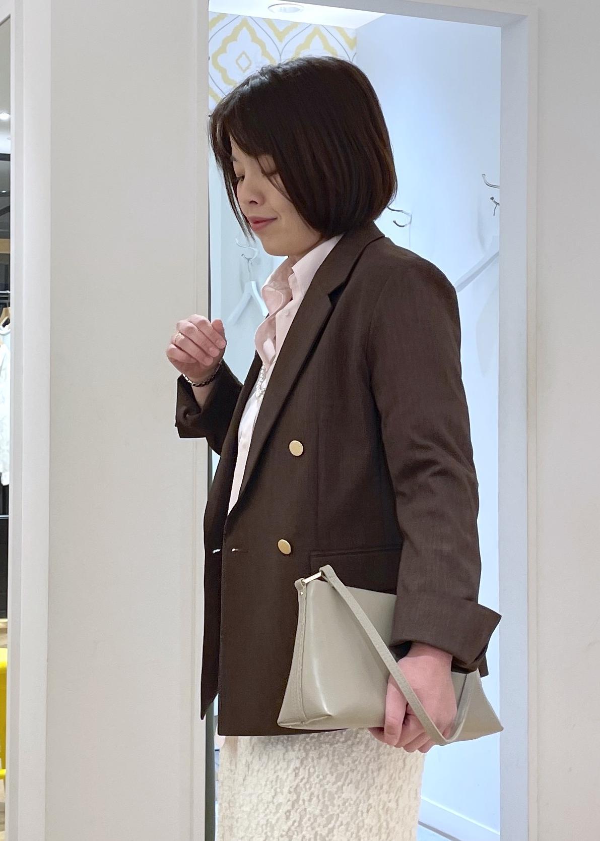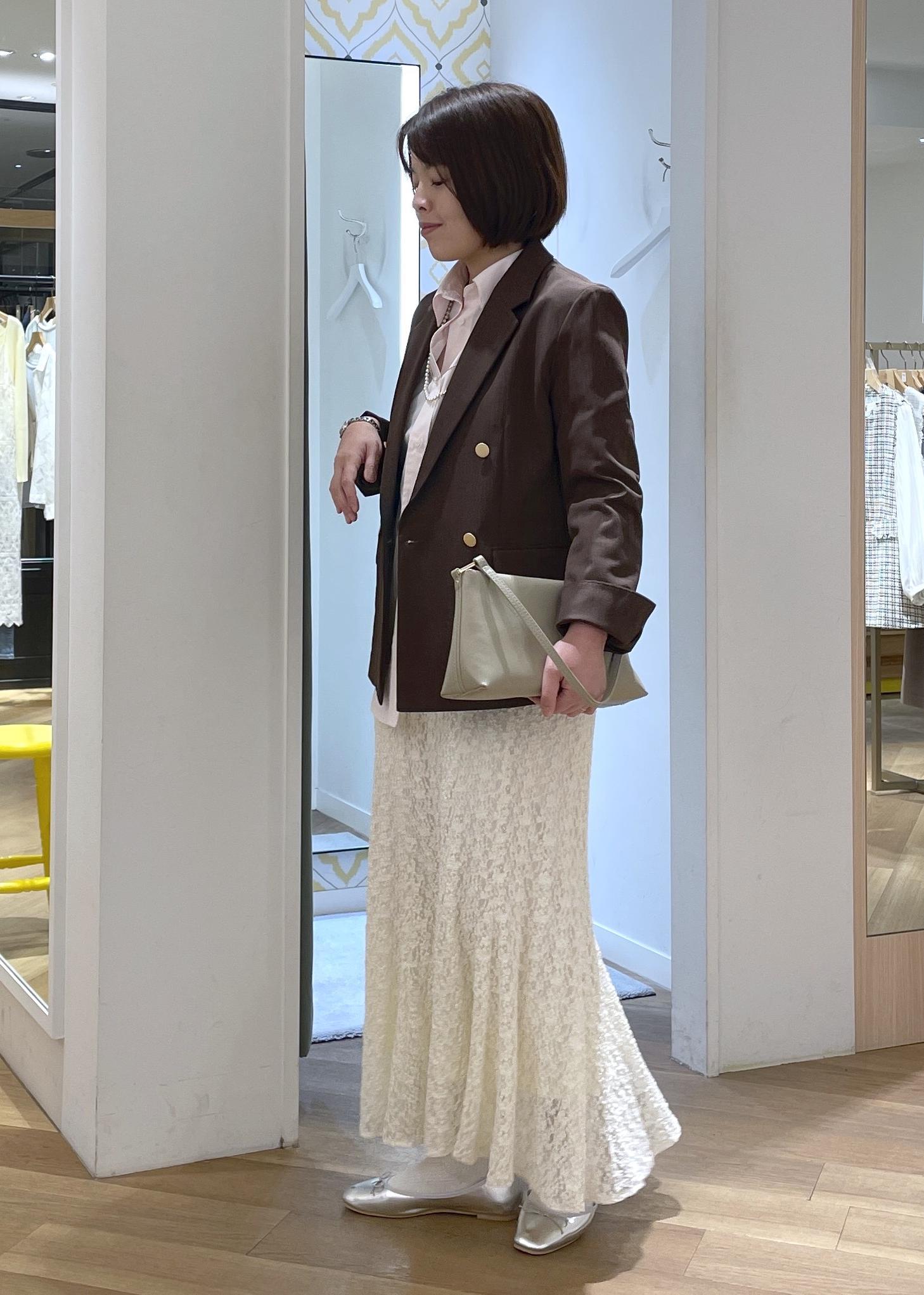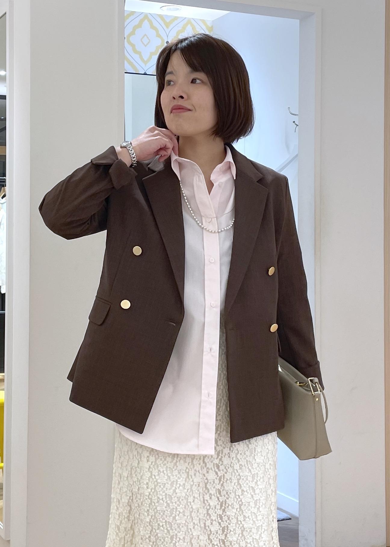 シャツとスカートは淡いカラーで合わせて、ブラウンのジャケットでメリハリを付けました!