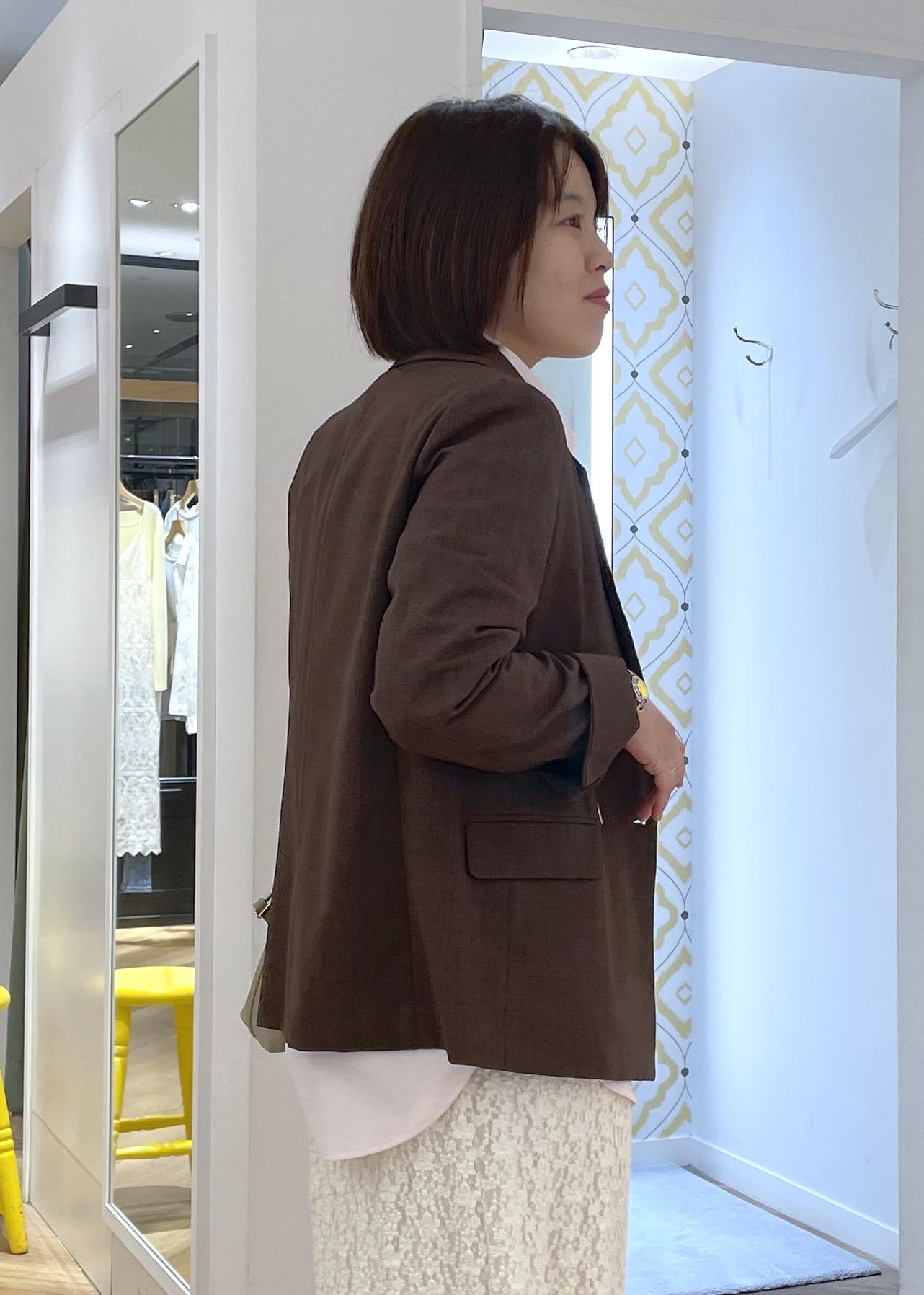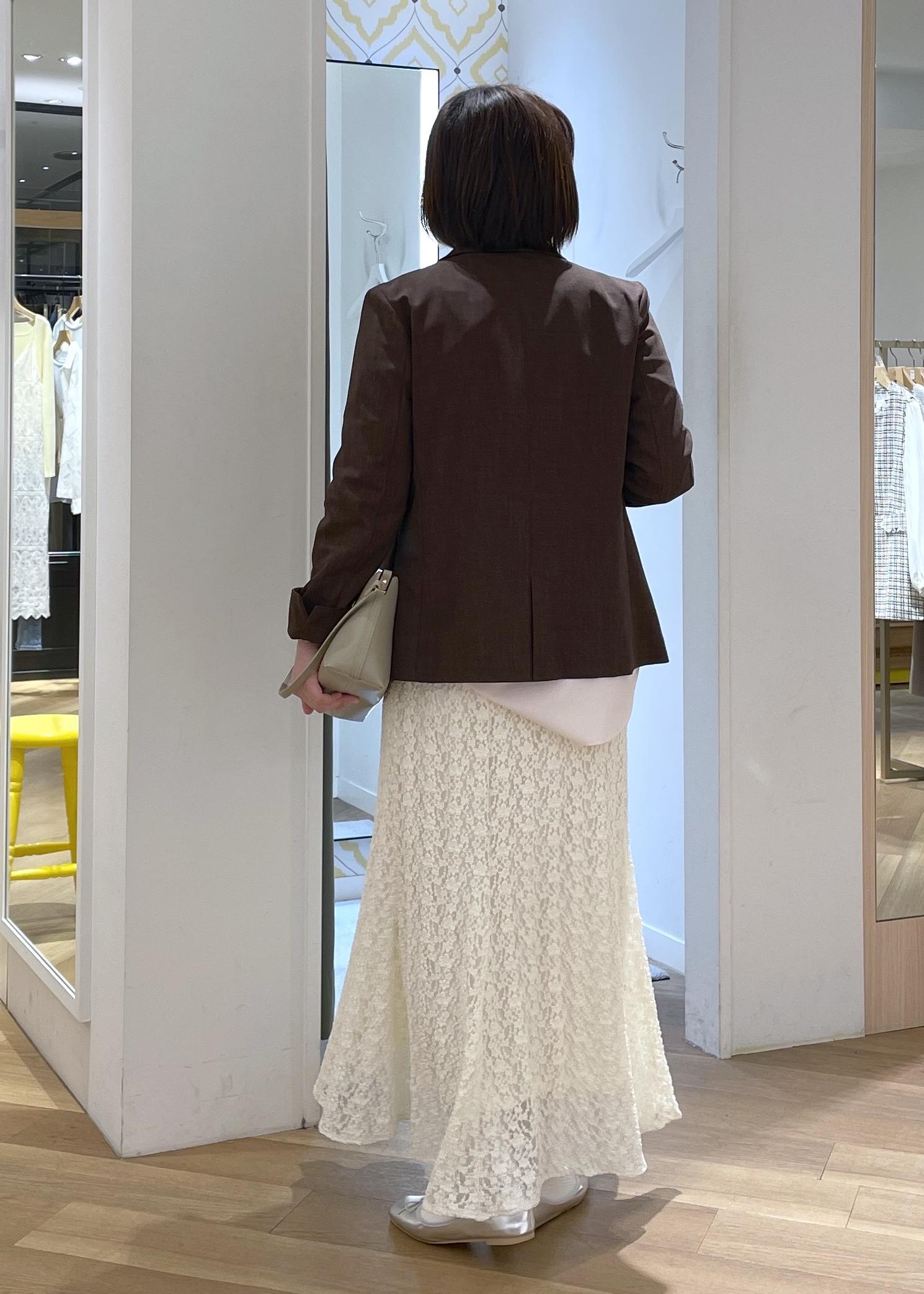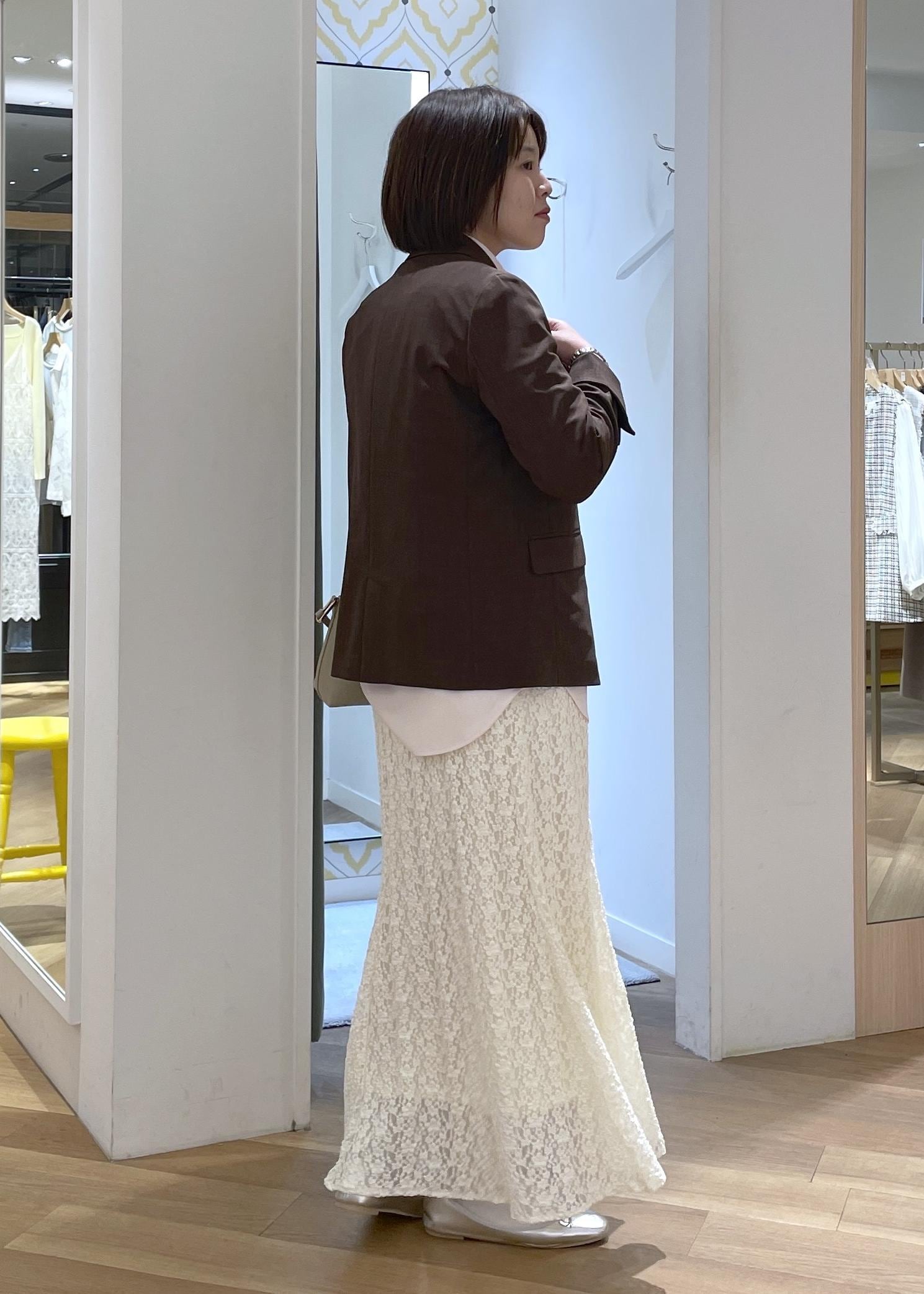 シャツとスカートは淡いカラーで合わせて、ブラウンのジャケットでメリハリを付けました!