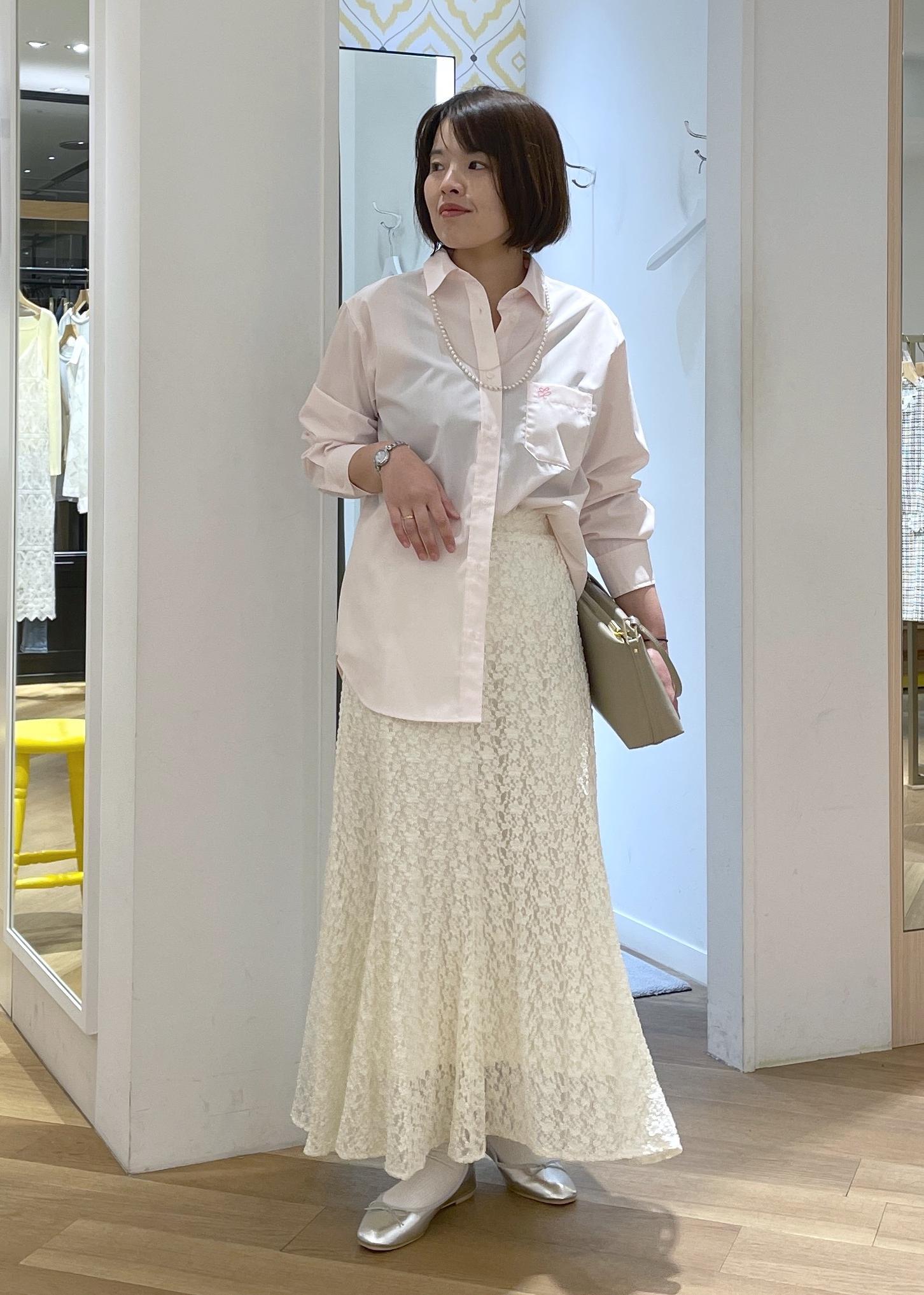 スカートは白のレーススカートを合わせて軽やかで女性らしさのあるスタイルに◎