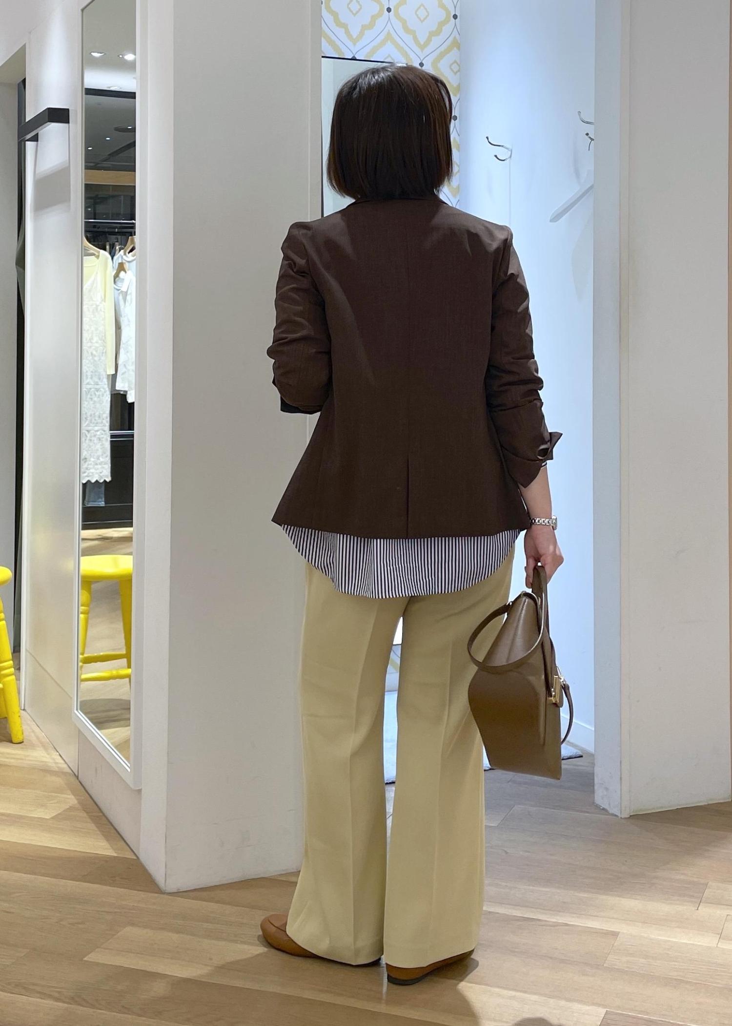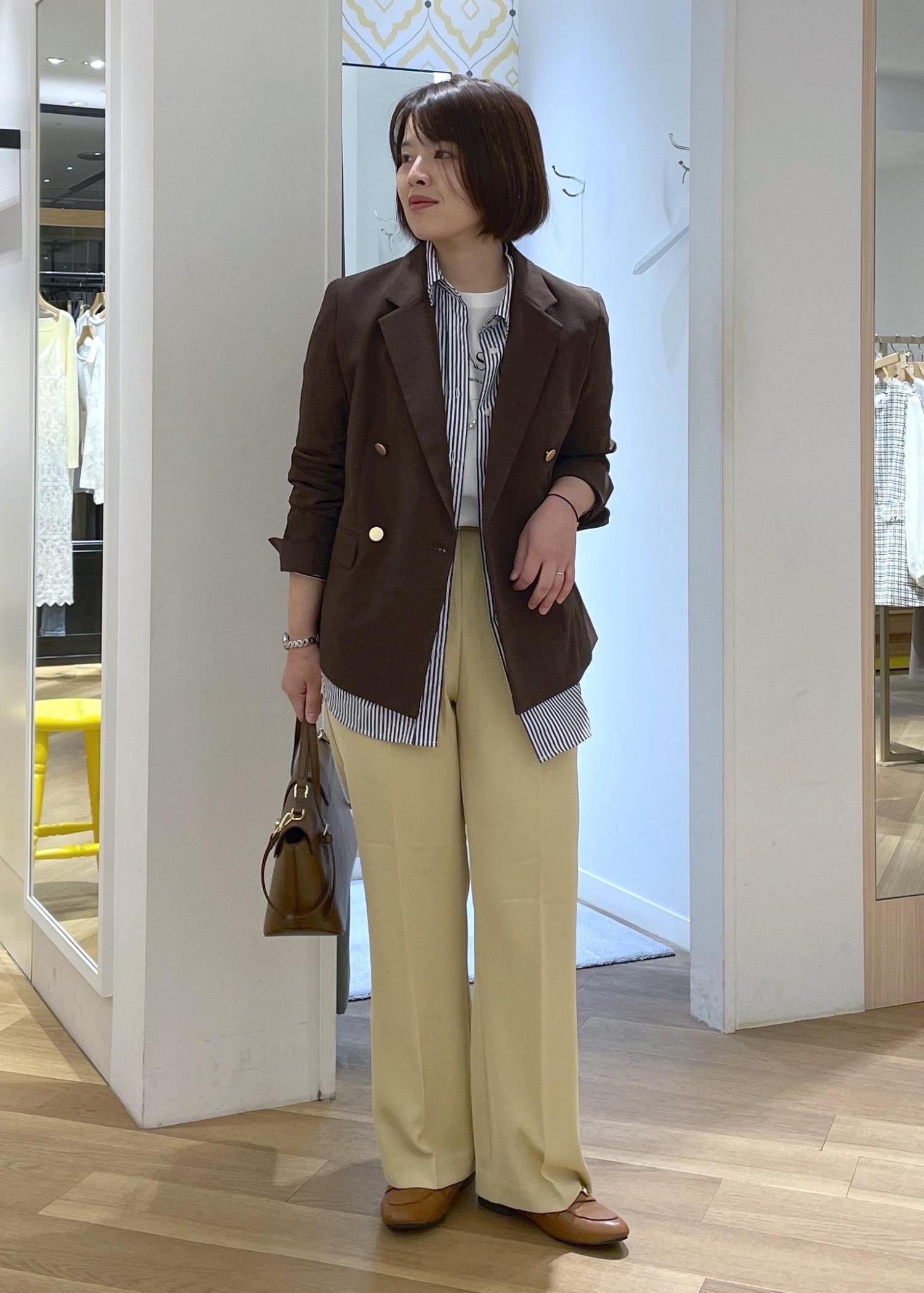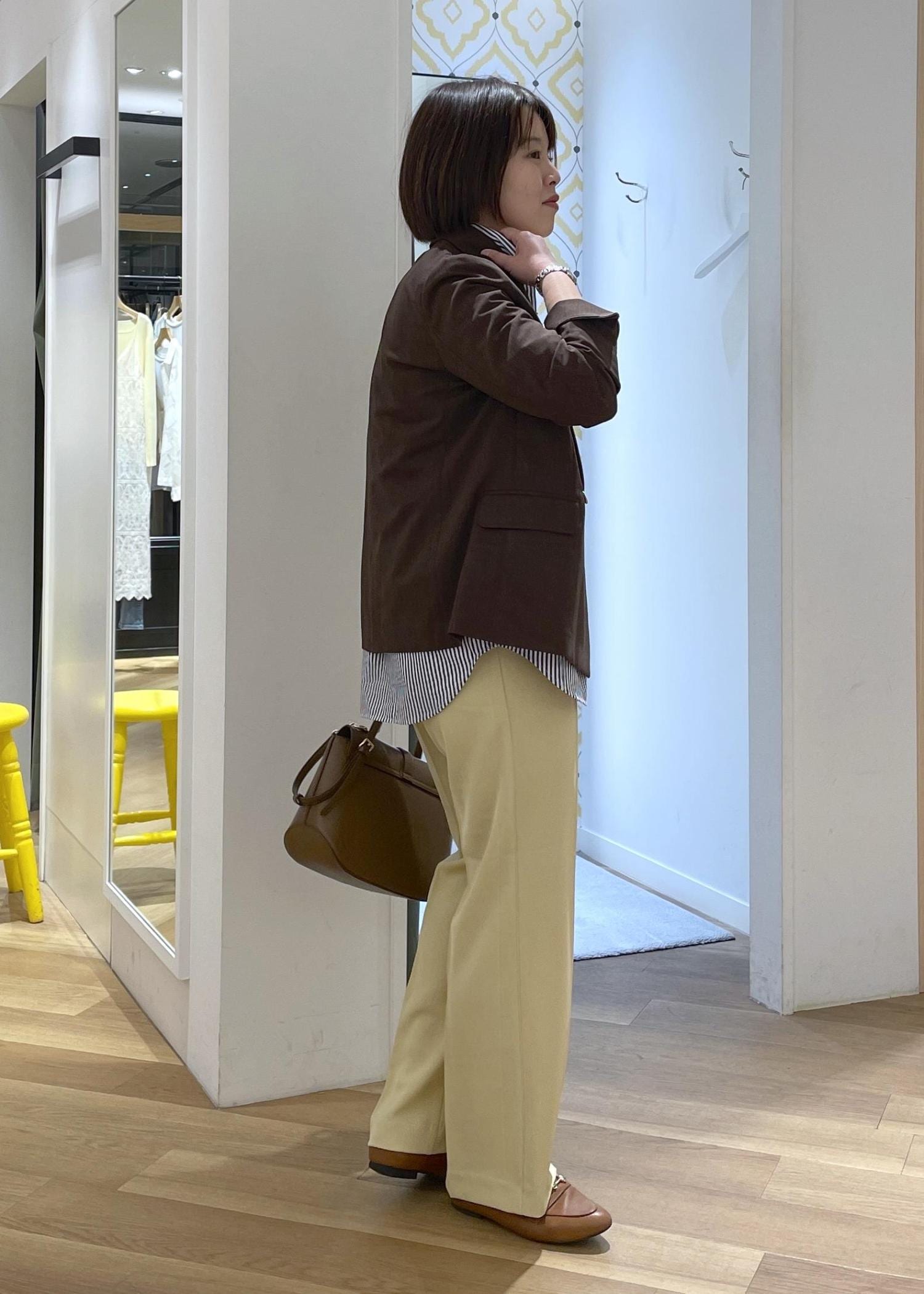 スタイリングのポイントにもあるイエローのパンツにブラウンのジャケットを合わせた、トレンドカジュアルコーデです!