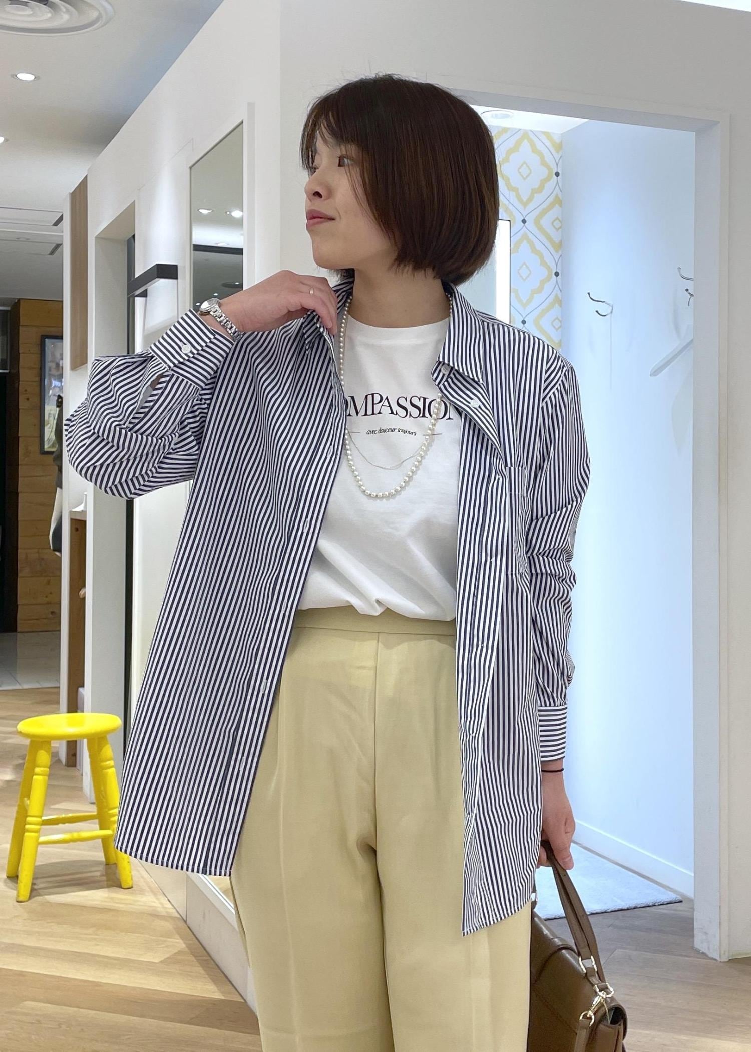 ジャケットのインナーにはロゴTシャツとストライプのシャツを合わせて、リラックス感と爽やかさをプラスしました◎