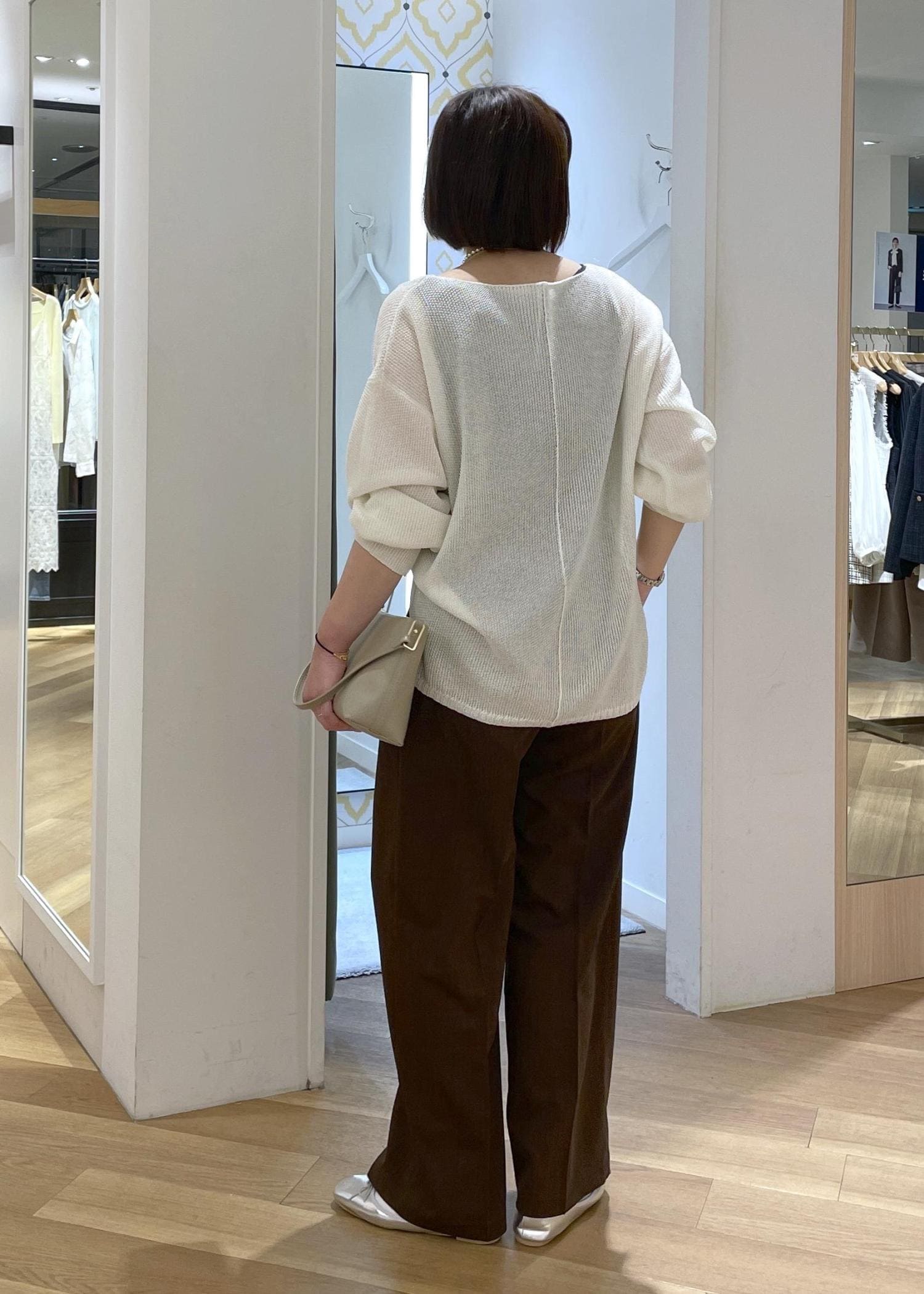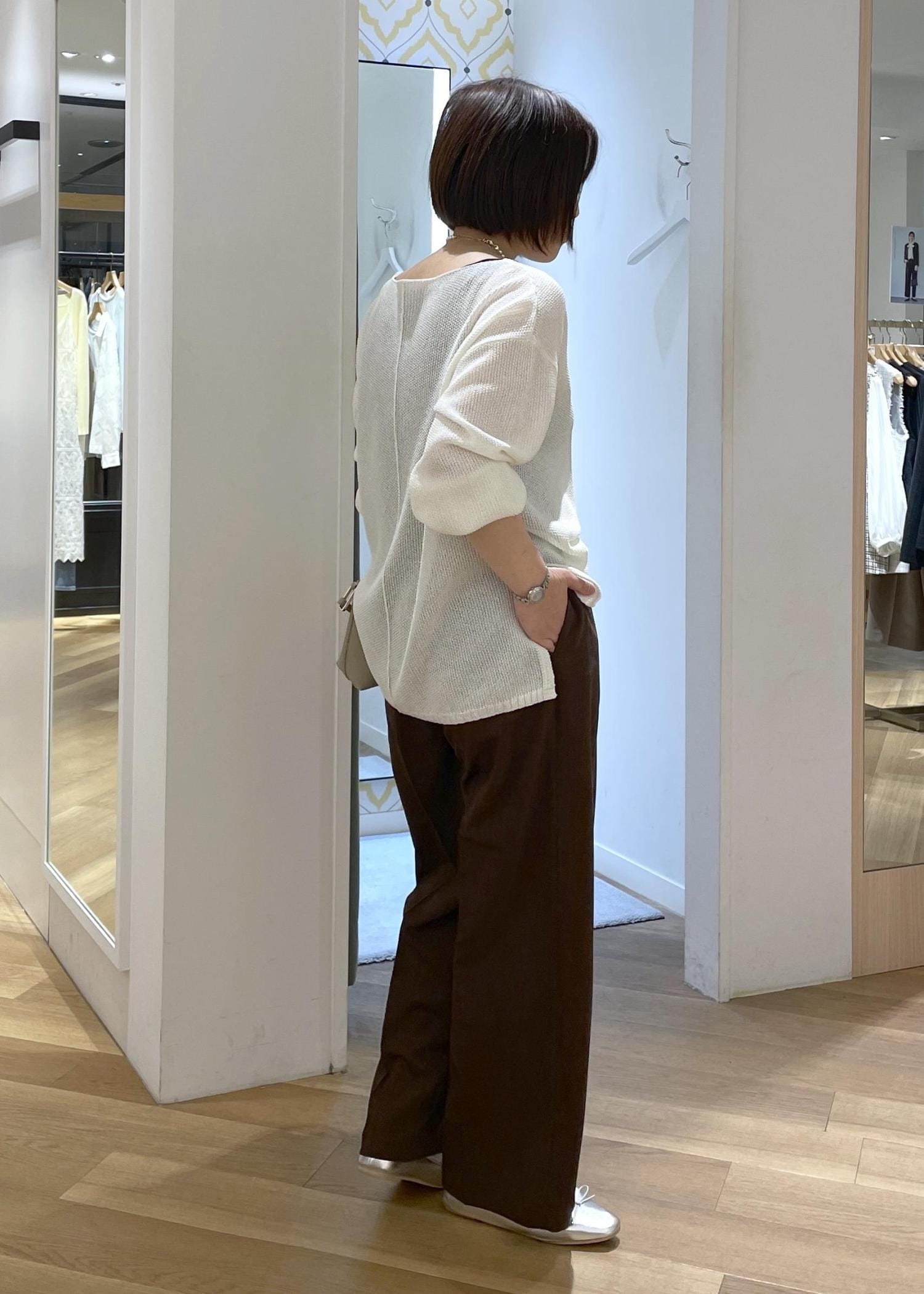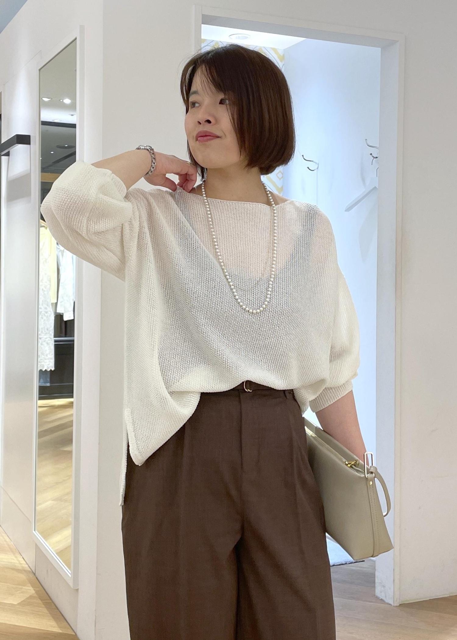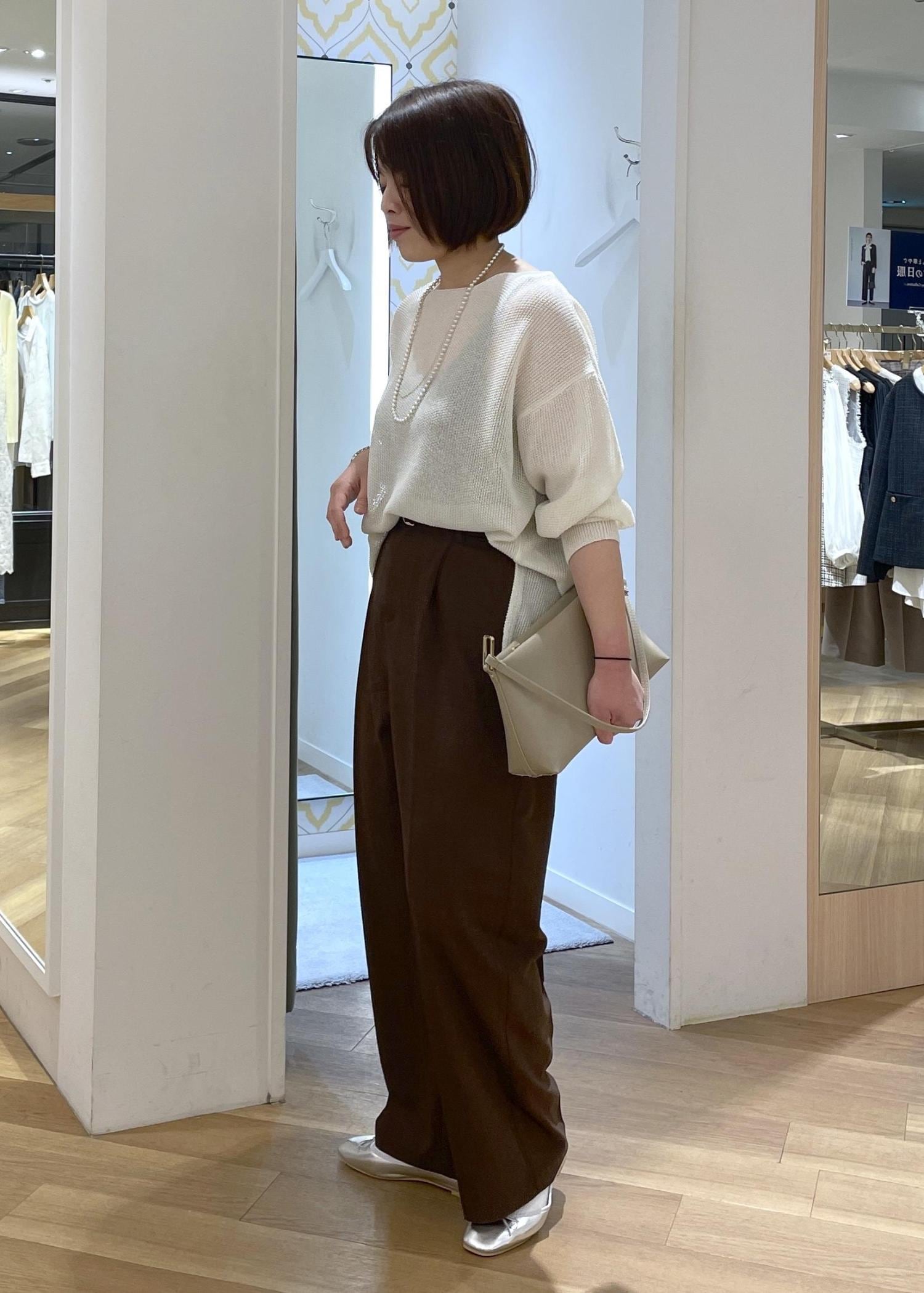 白のメッシュニットにブラウンのワイドパンツを合わせた、シンプルにリラックス感のあるカジュアルコーデです!