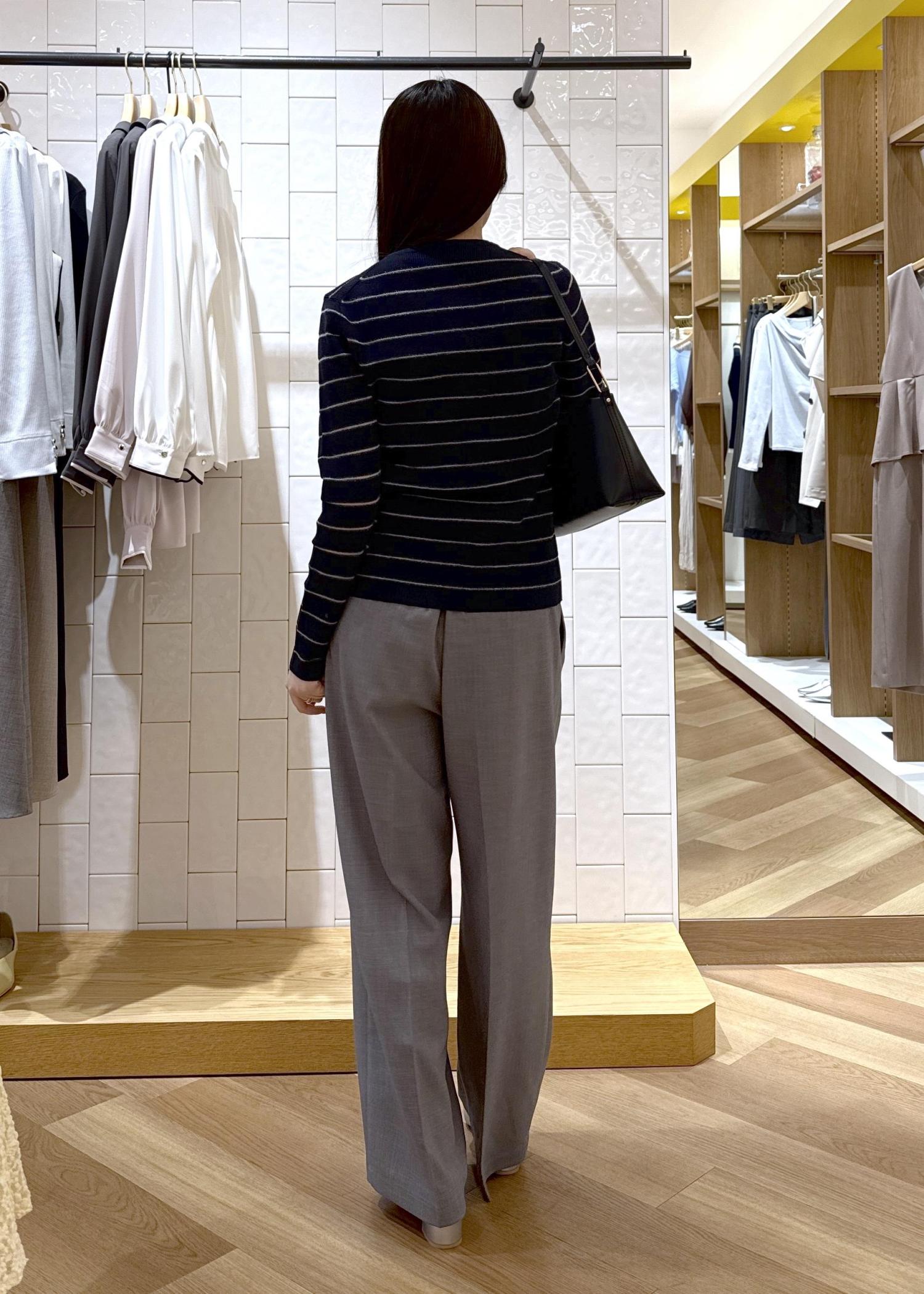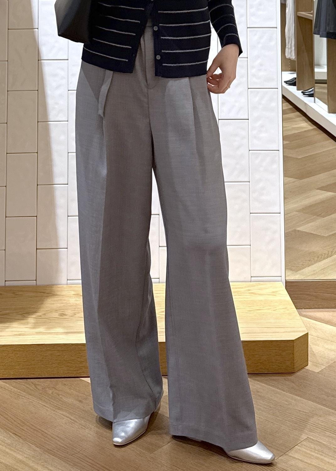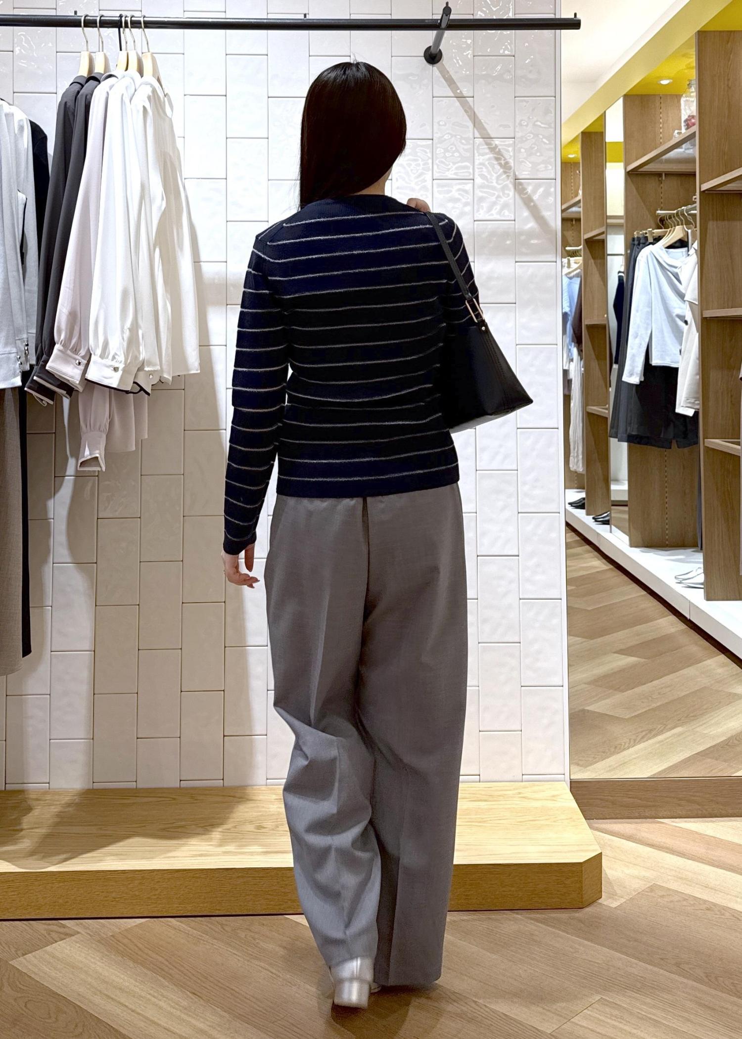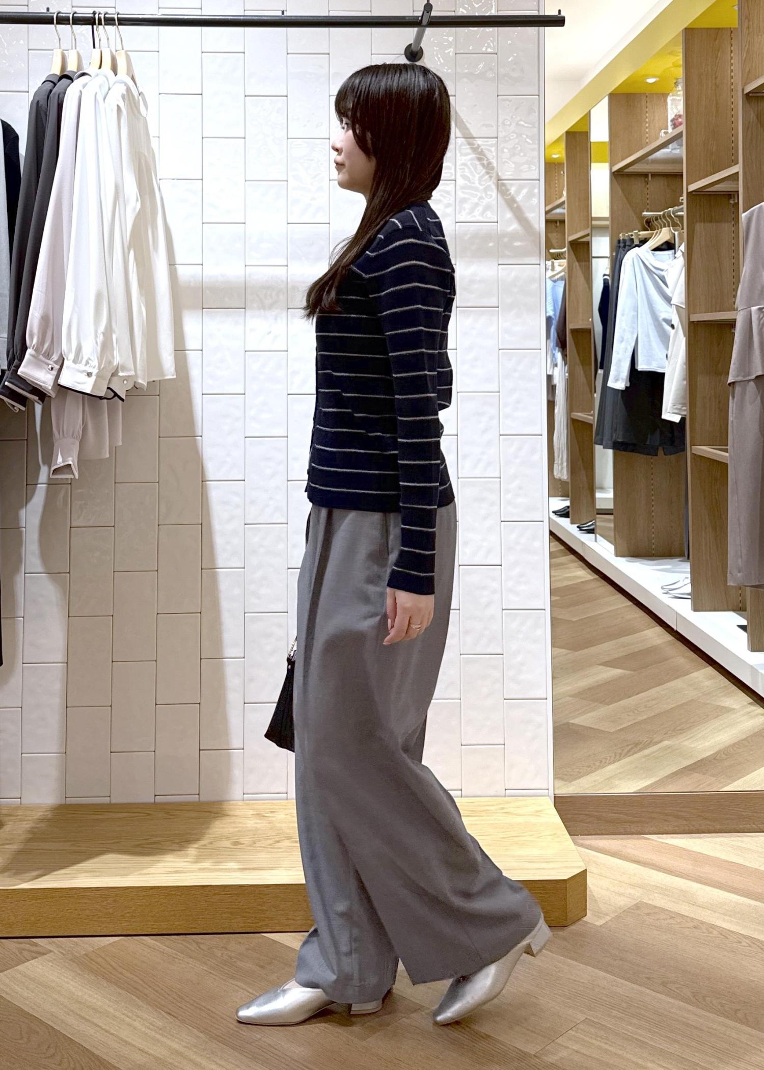 上はタイトなトップスを合わせ、ボトムスはワイドパンツ合わせでバランスをとりました。