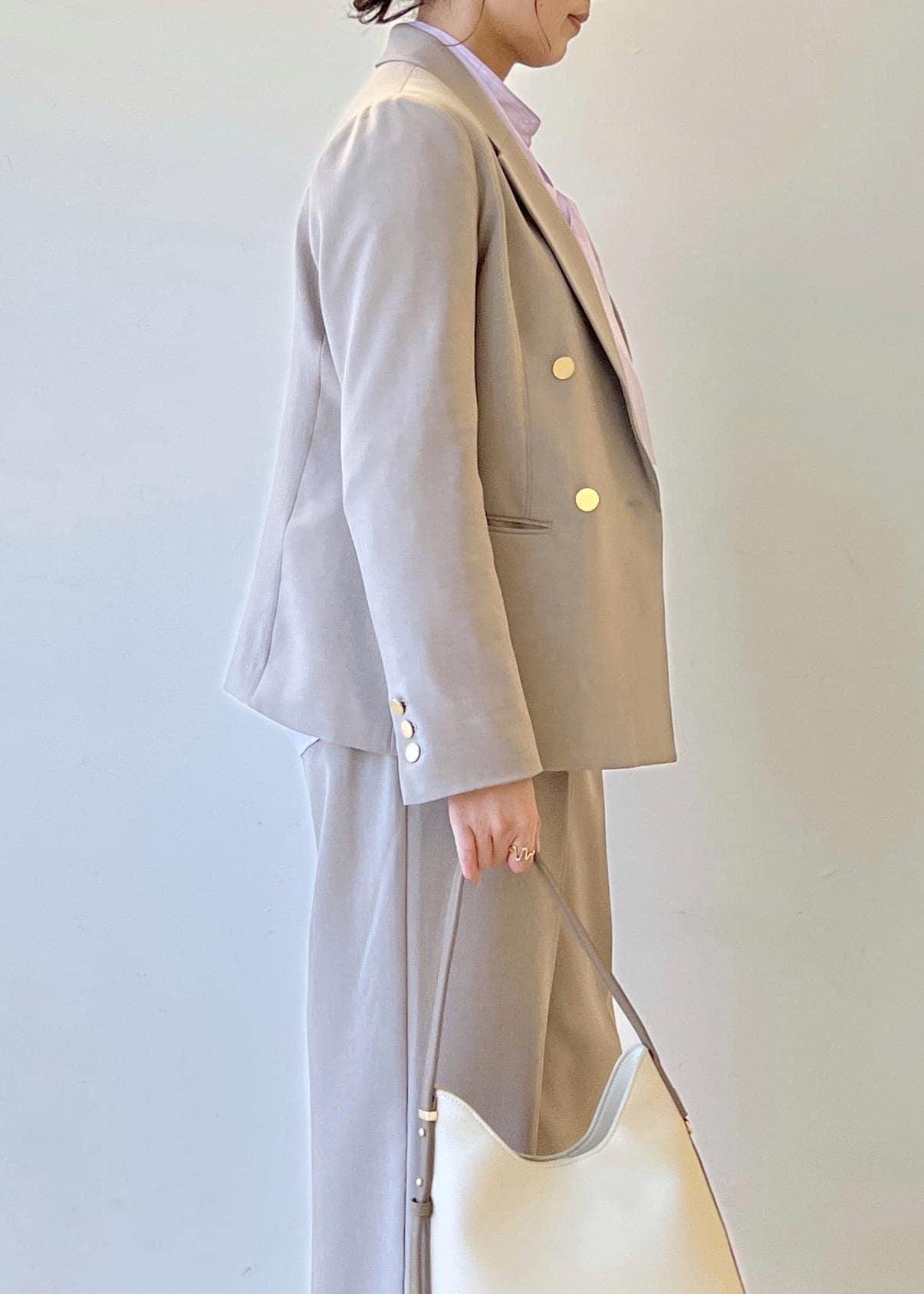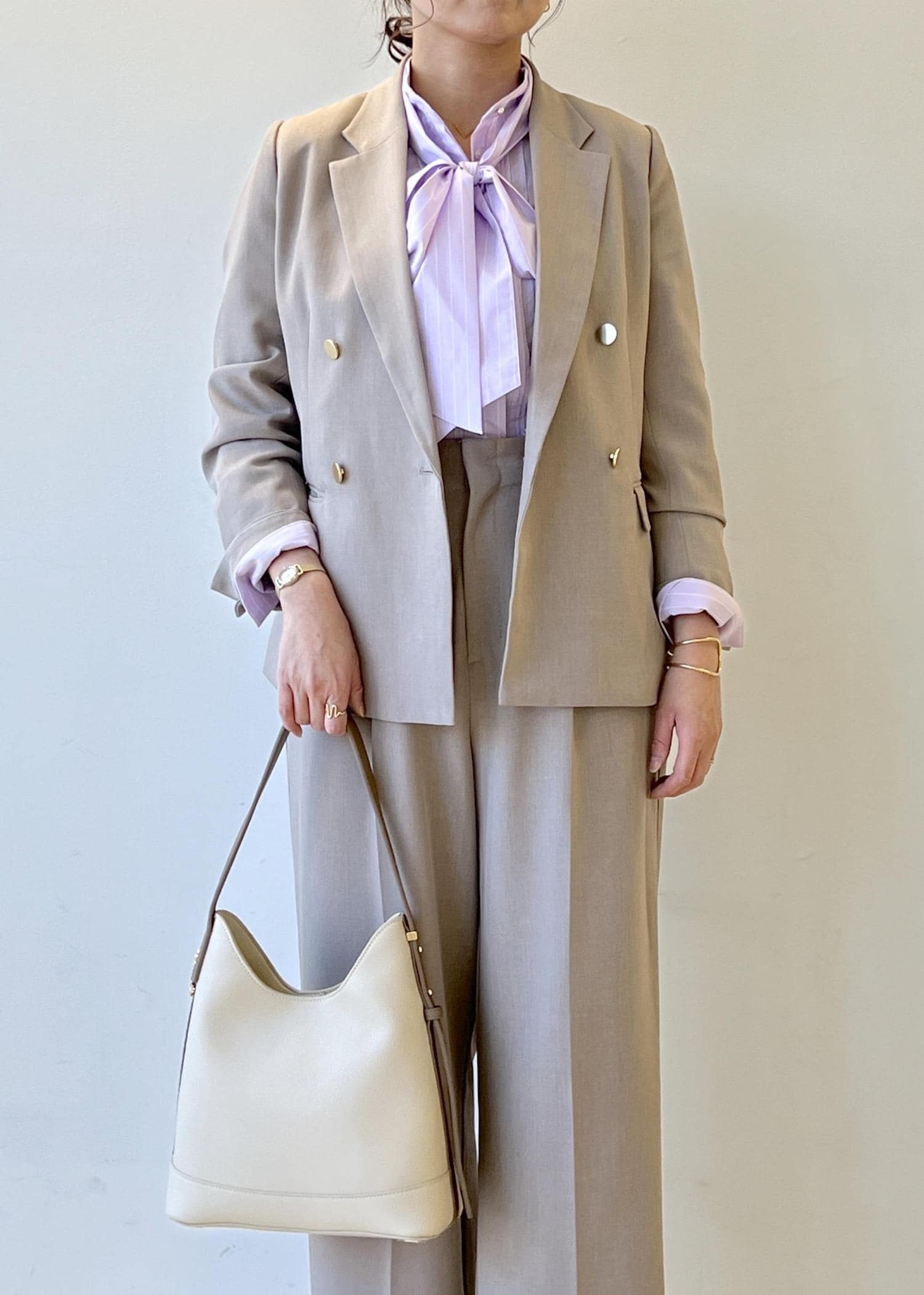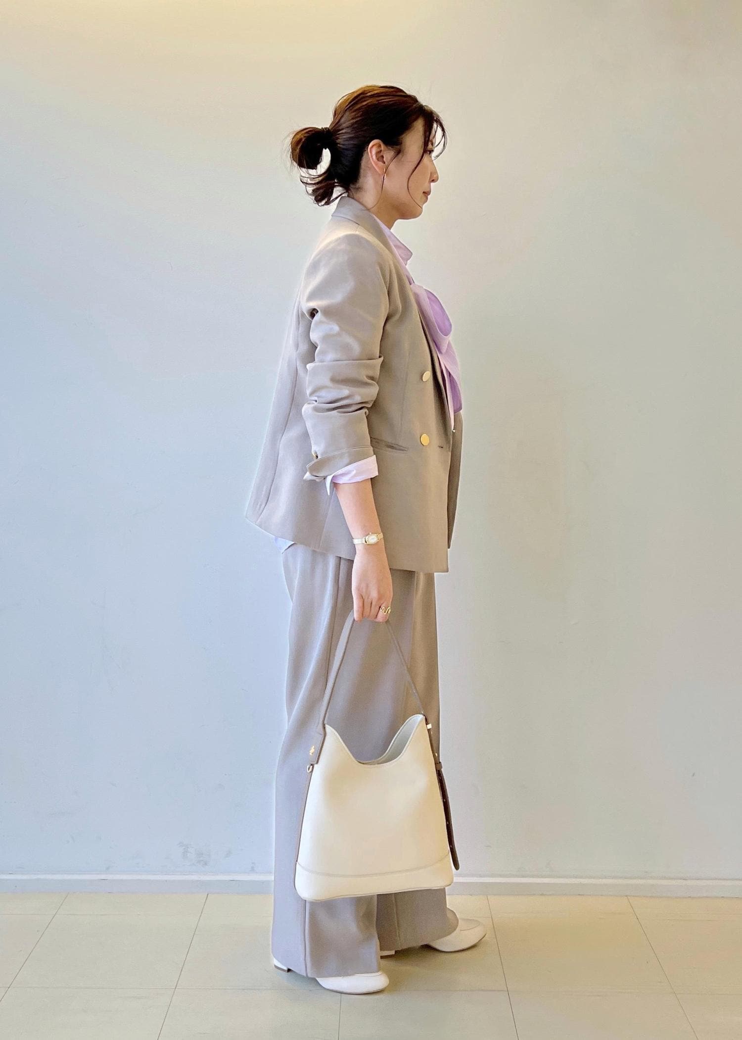 かしこまり過ぎずカジュアルダウンしたセットアップです。セレモニーでもご利用いただけ、その後もプライベートで着回しできるのでオススメです。