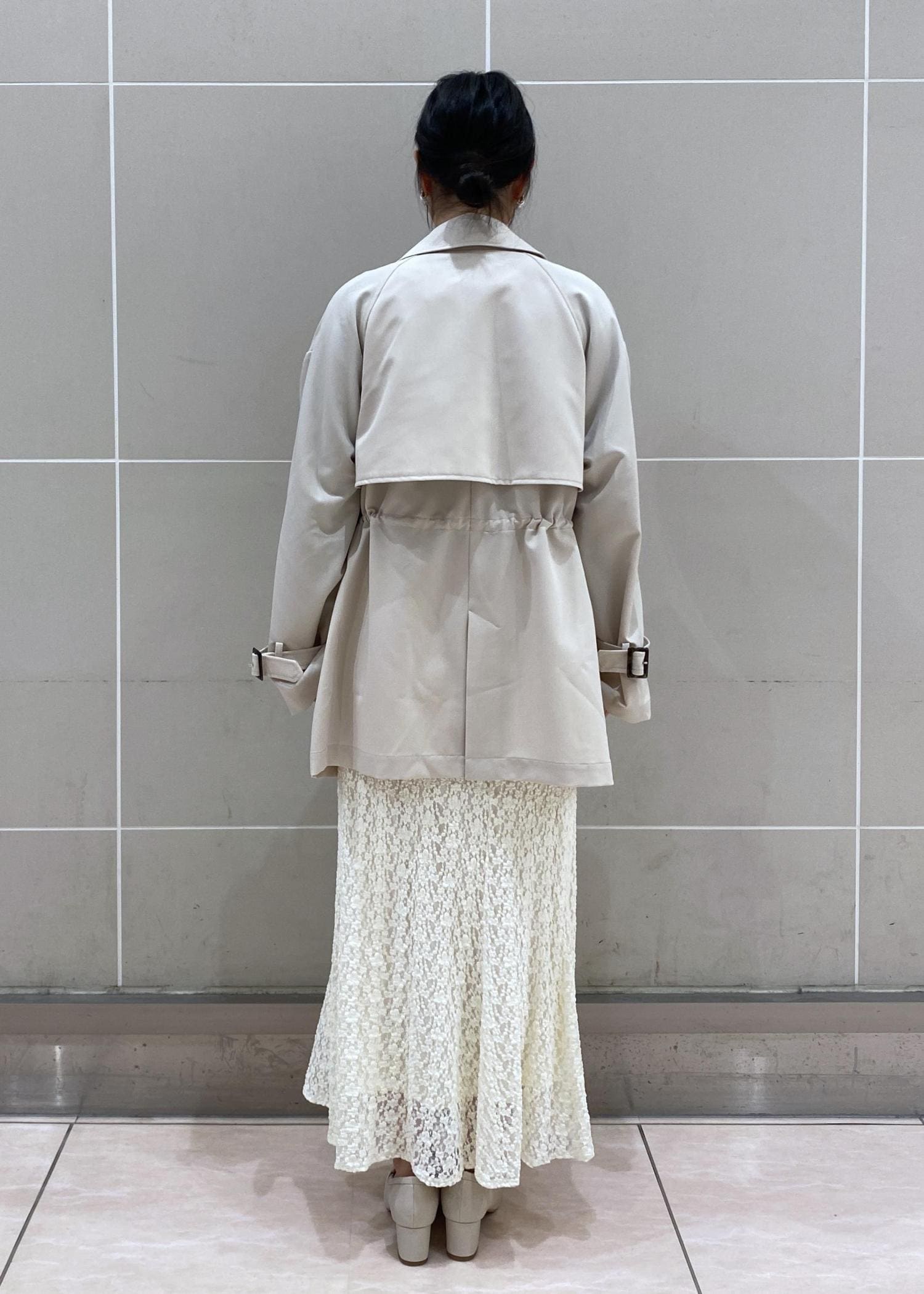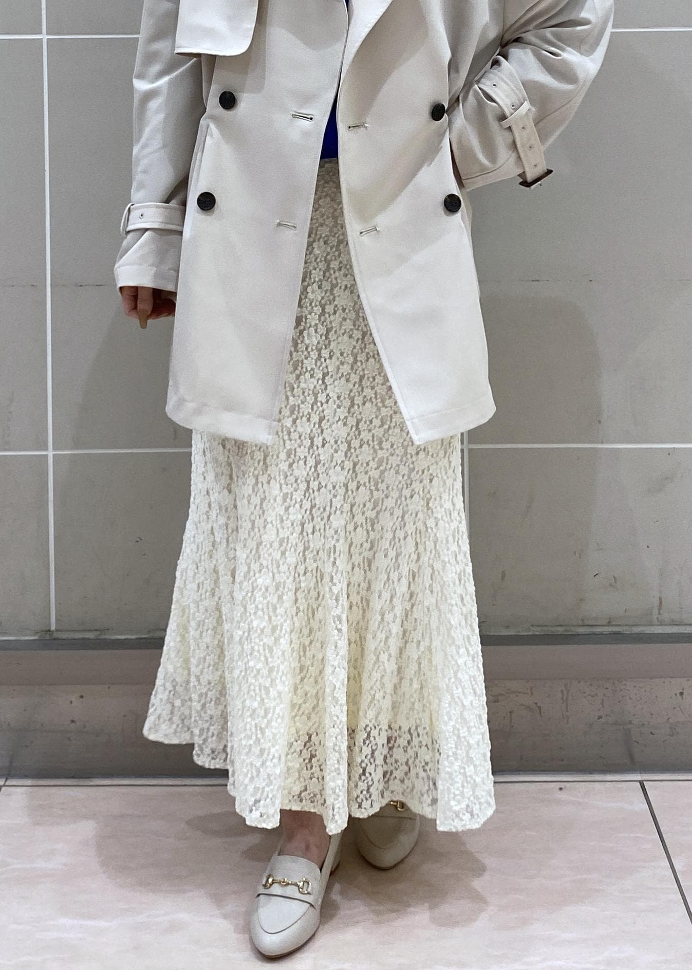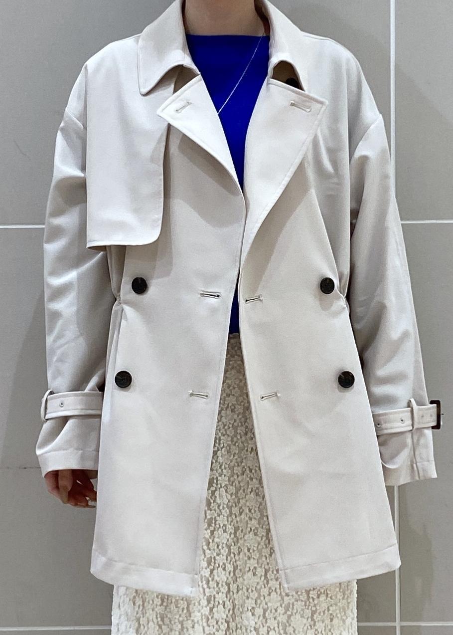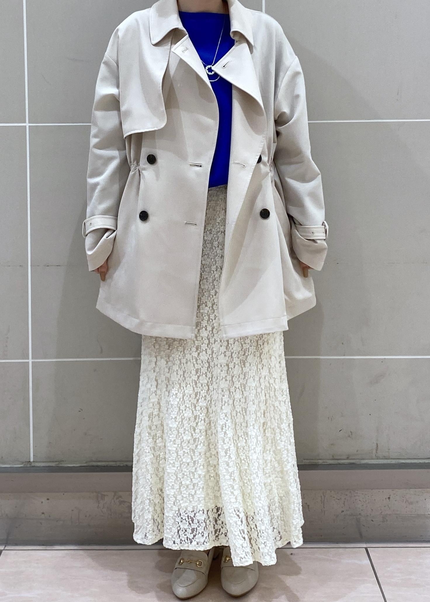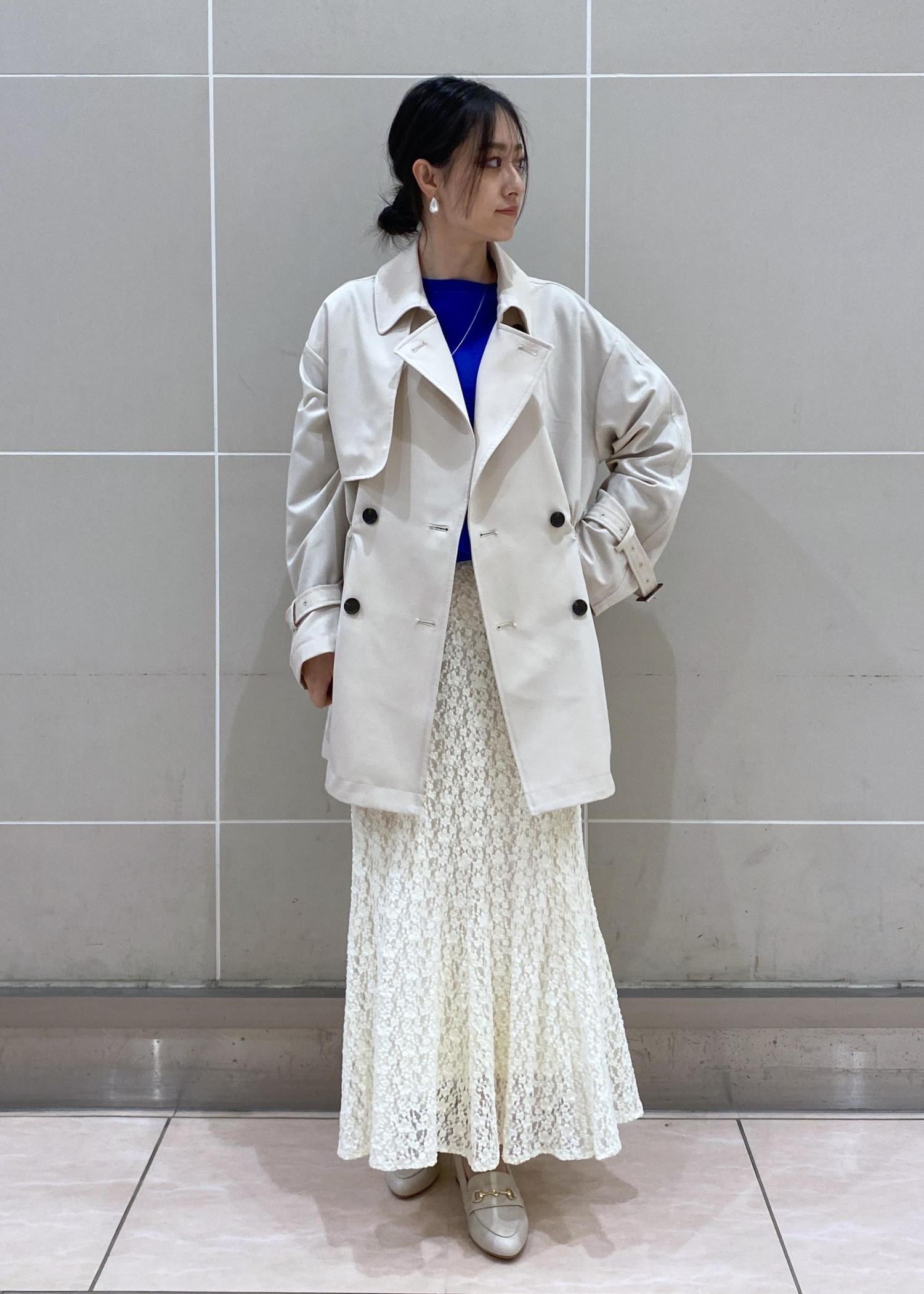 軽やかな着心地で、季節の変わり目にもさっと羽織りやすいトレンチコートに大人のレースマーメイドスカートを合わせた春のお出かけにぴったりなコーディネートです。
