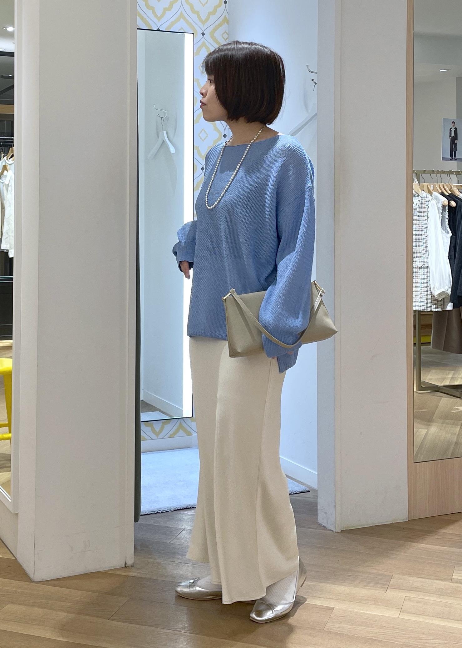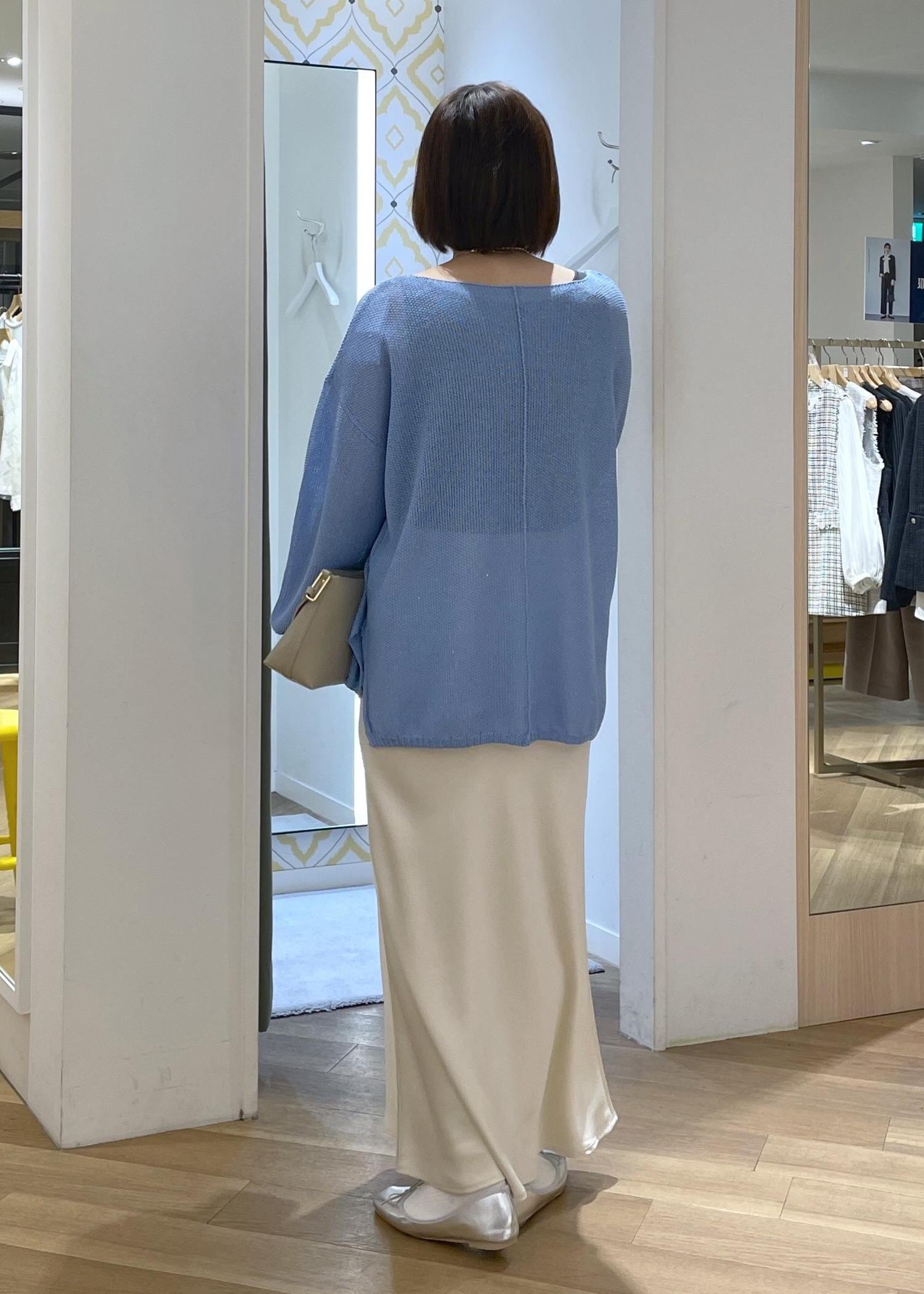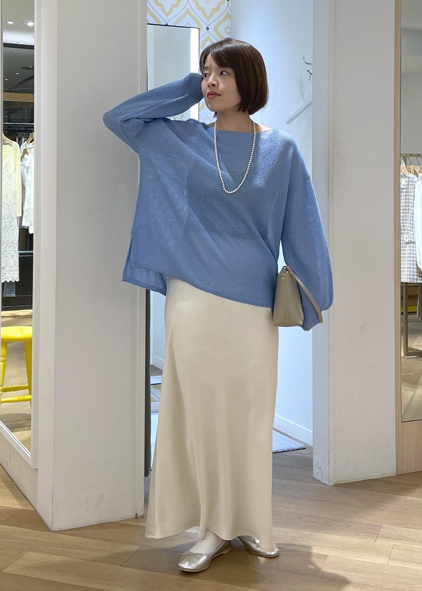 爽やかなブルーのメッシュニットにアイラインのサテンスカートを合わせた、レディなカジュアルコーデです!