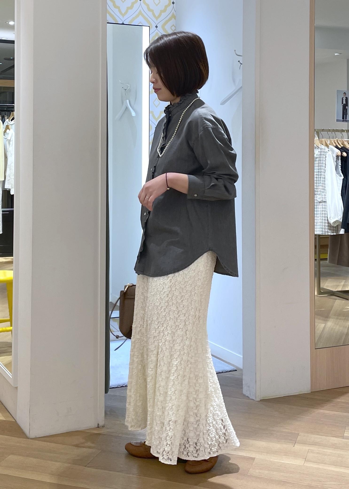 フリルシャツのレーススカートコーデ