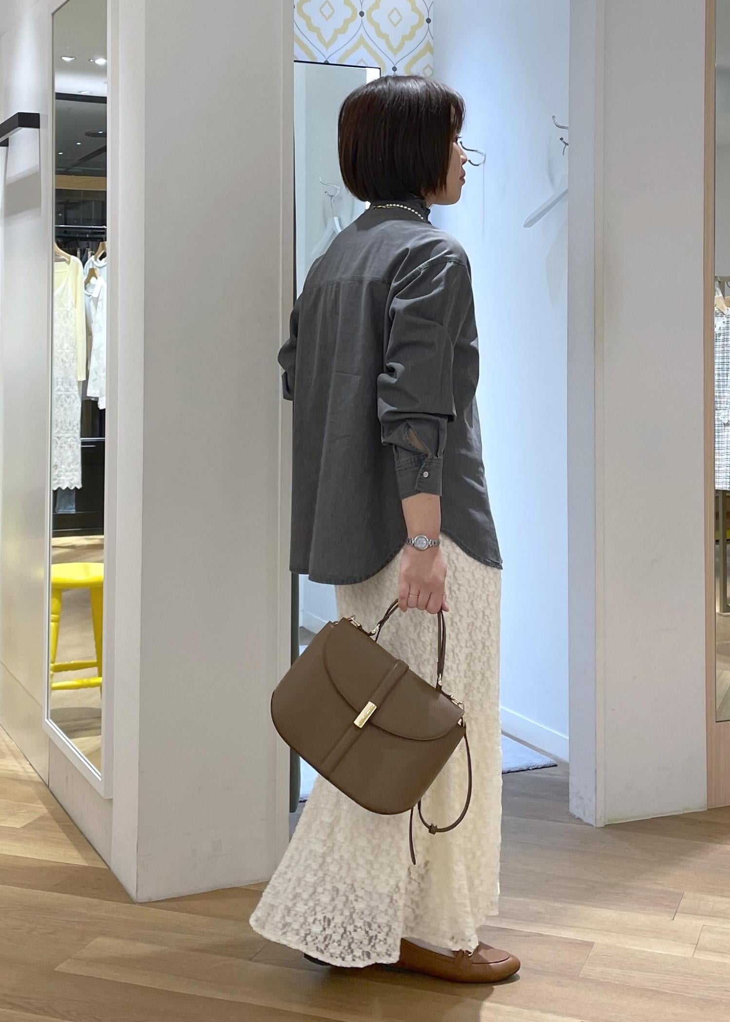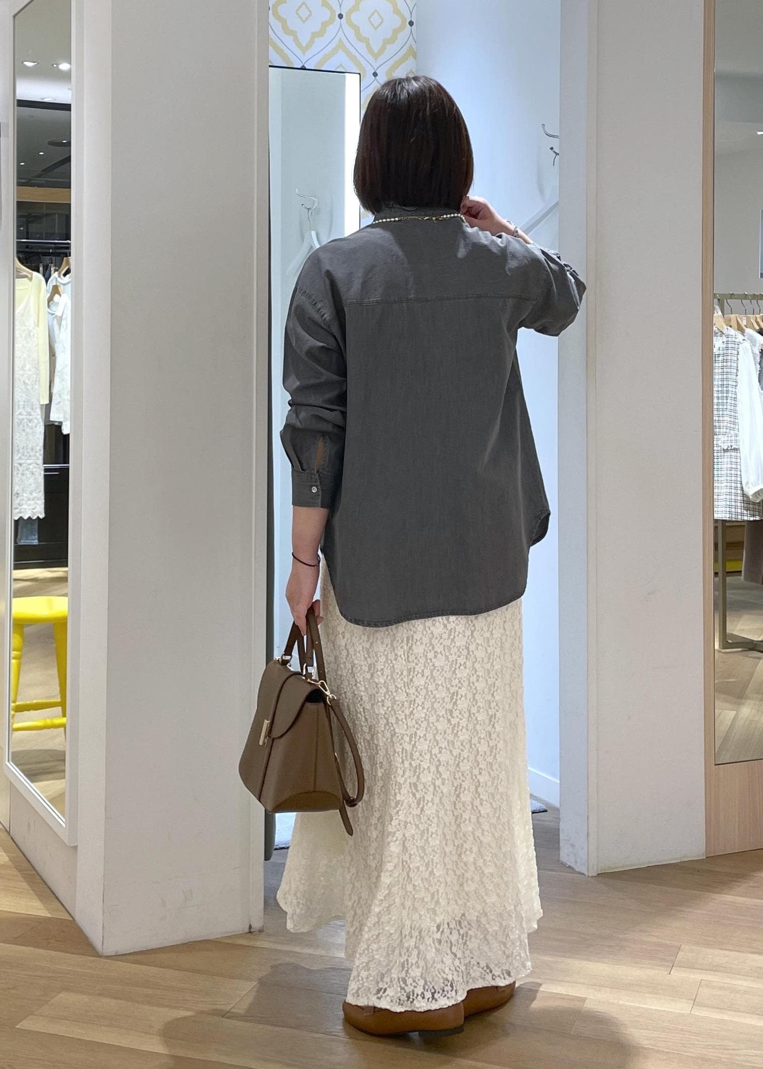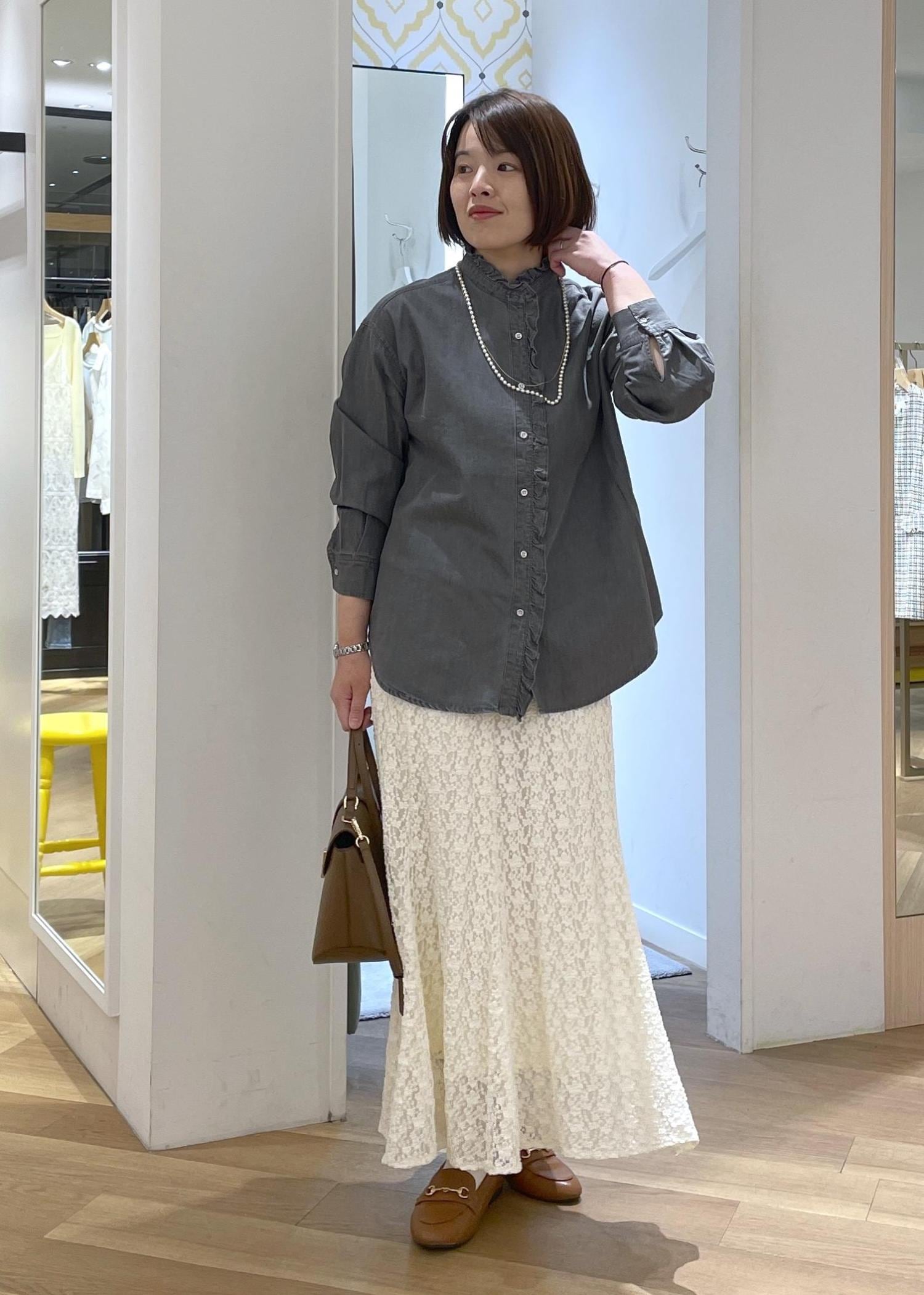 デニム見えするシャンブレーシャツにレースのスカートを合わせた大人カジュアルコーデです!