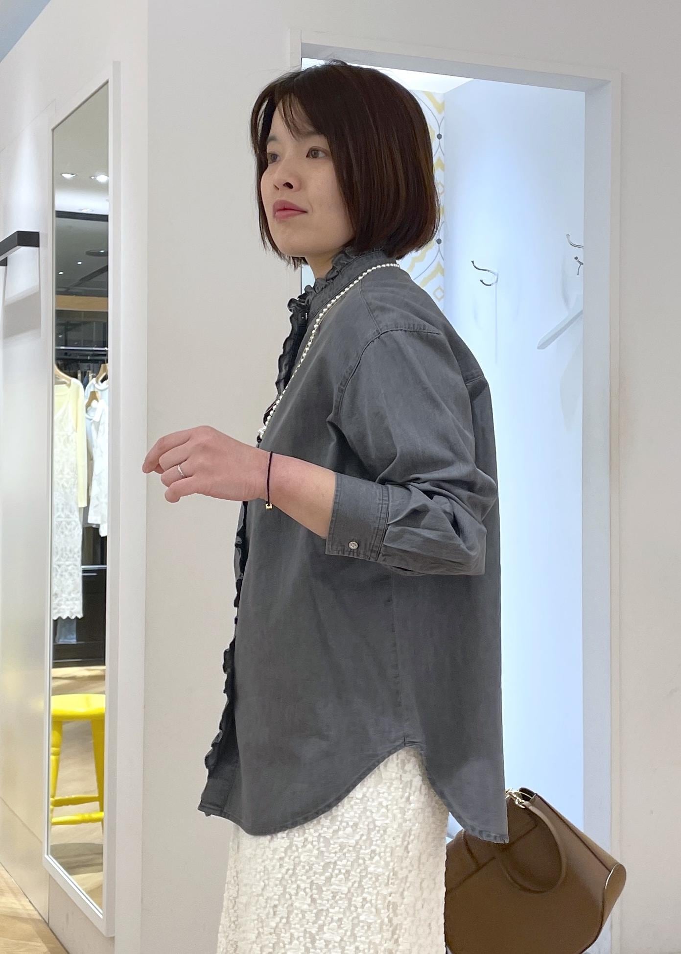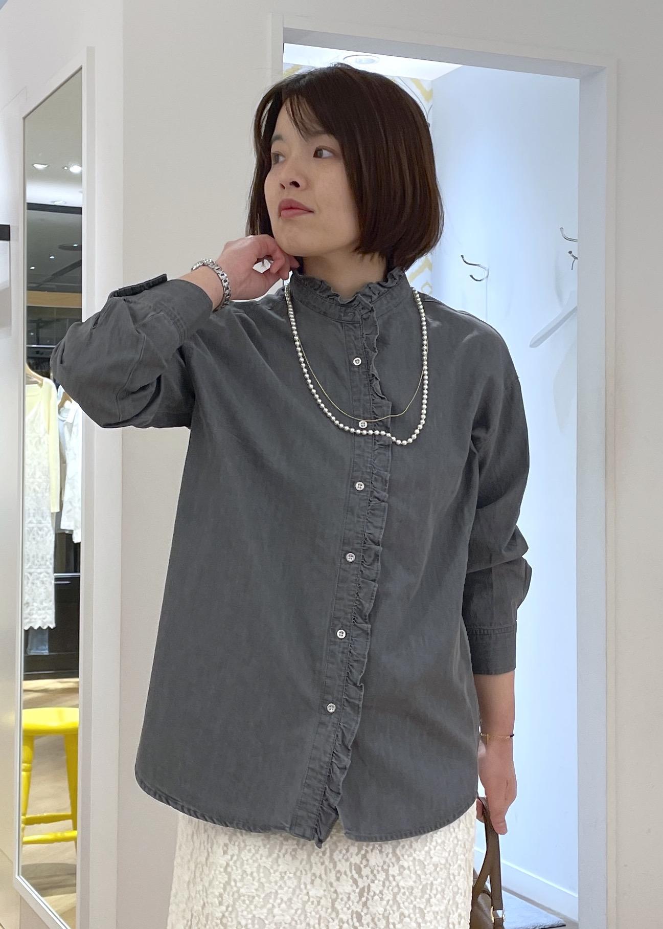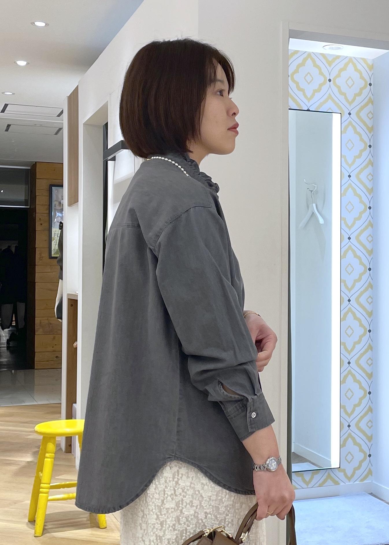 フリルデザインのシャツですが、素材感とグレーのカラーで甘過ぎない印象に◎