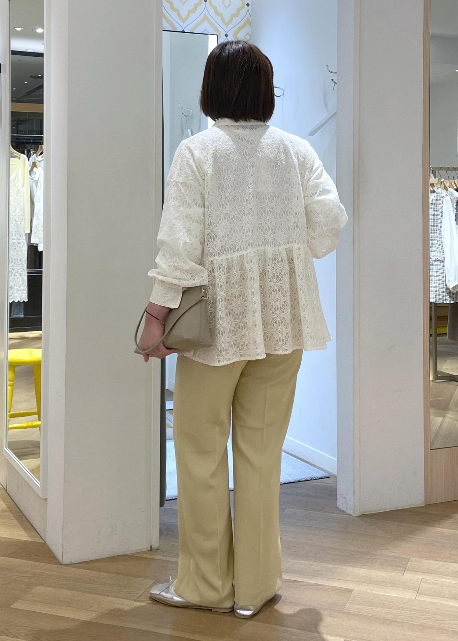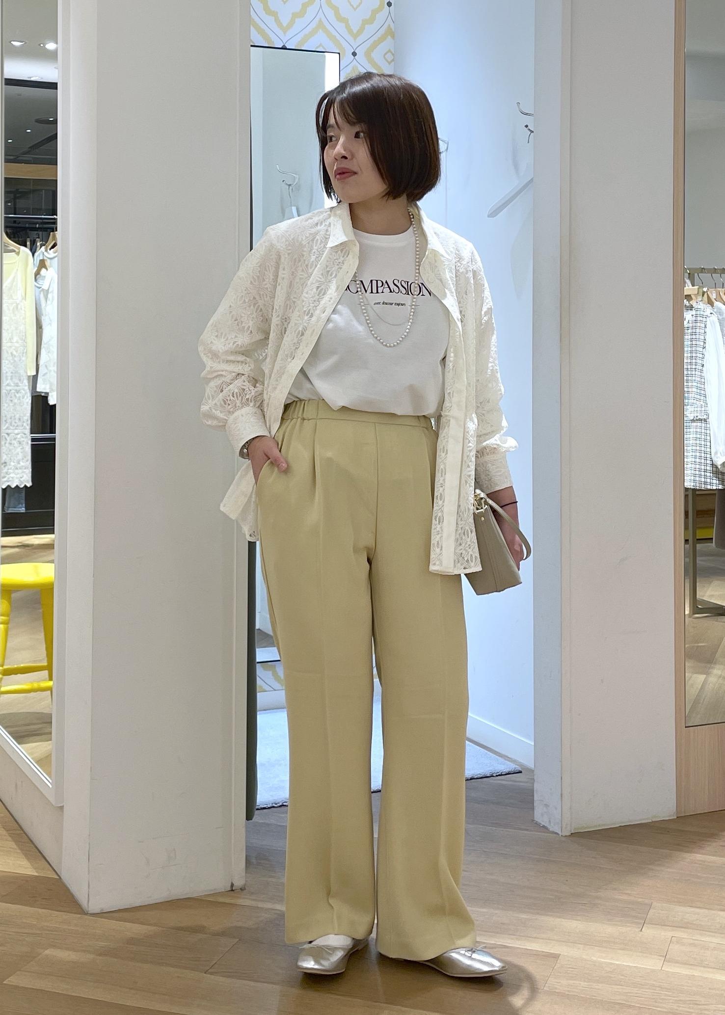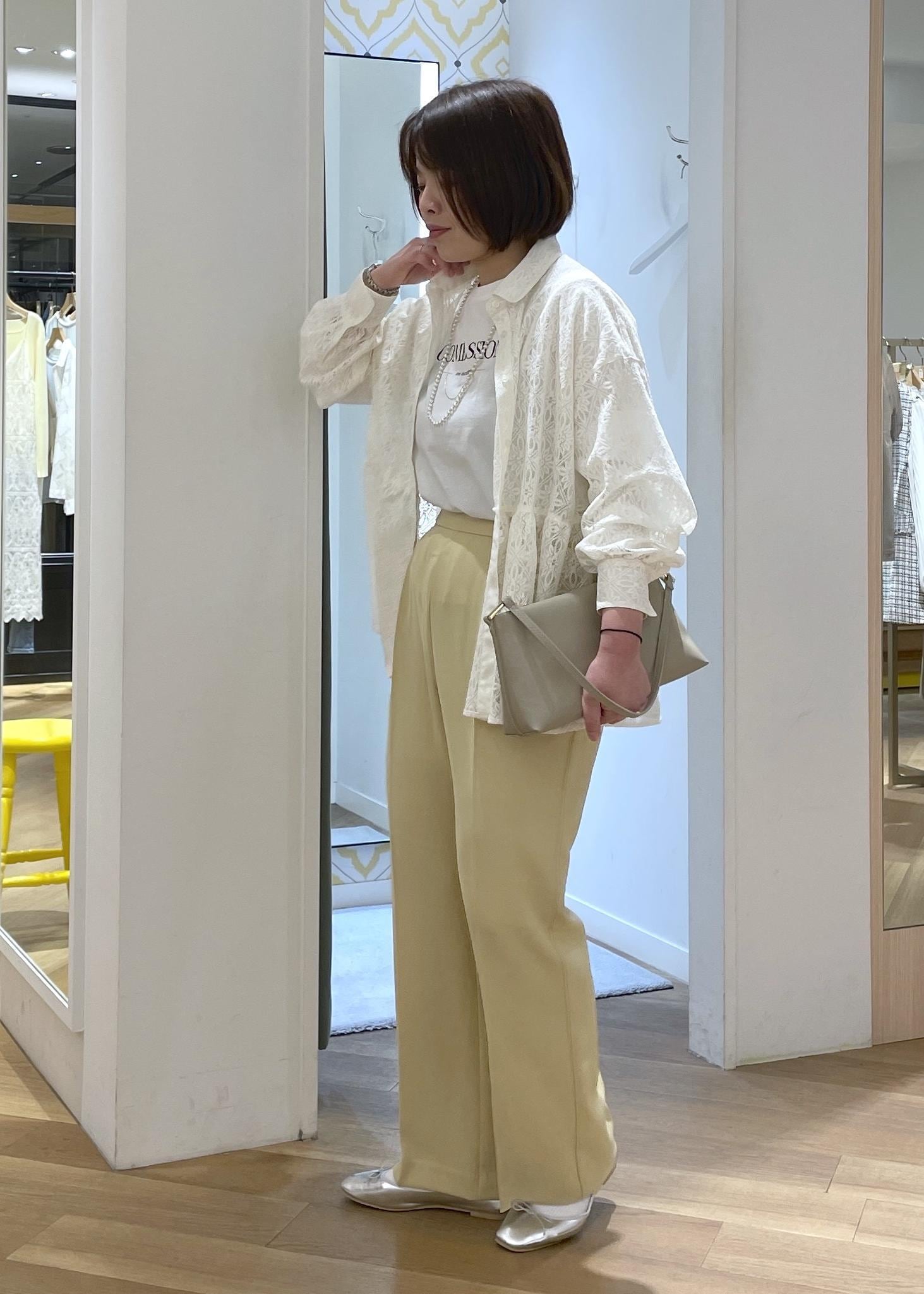 トレンド感のあるレース素材のペプラムシャツに、爽やかなイエローのパンツを合わせた春のカジュアルコーデです!