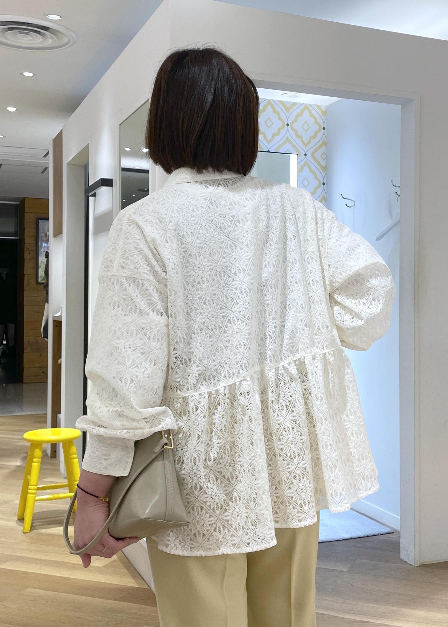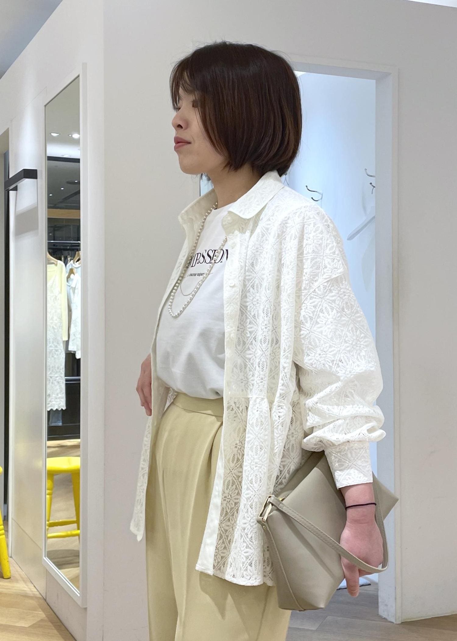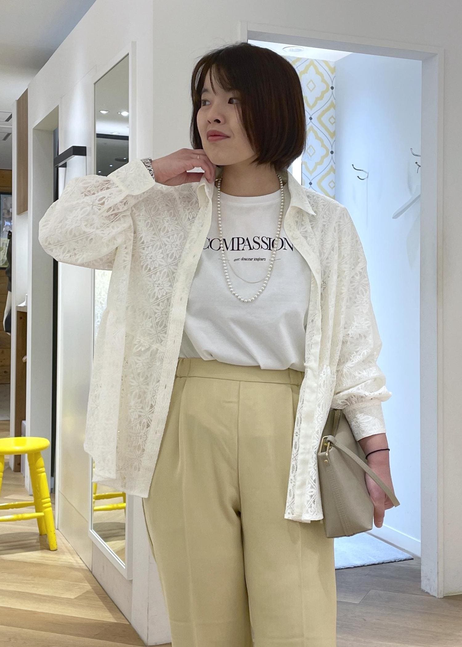 トレンド感のあるレース素材のペプラムシャツに、爽やかなイエローのパンツを合わせた春のカジュアルコーデです!