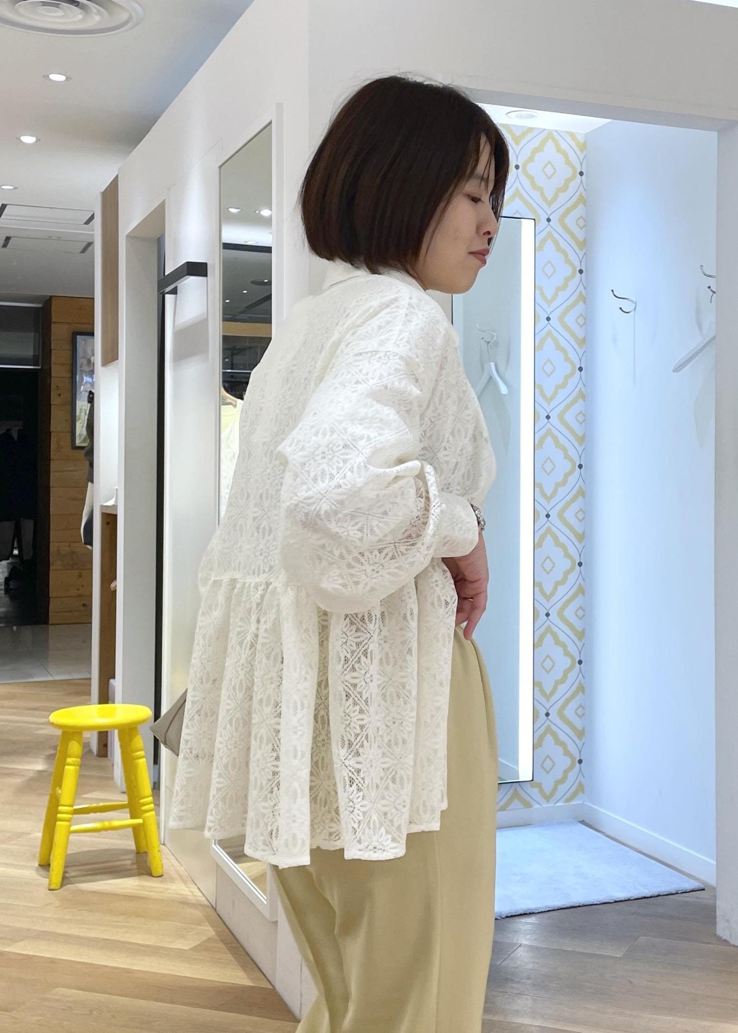 柔らかめな質感のレース素材のシャツです。裾がふわっと広がるペプラムデザインで、可愛く体型カバーも叶えてくれます。ゆったりとしたサイズ感なのでボディラインも拾わず着用できます。着丈はヒップに掛かる長さです。透け感のあるシャツなので、タンクトップを合わせたり、羽織り代わりに使うのがおすすめです。