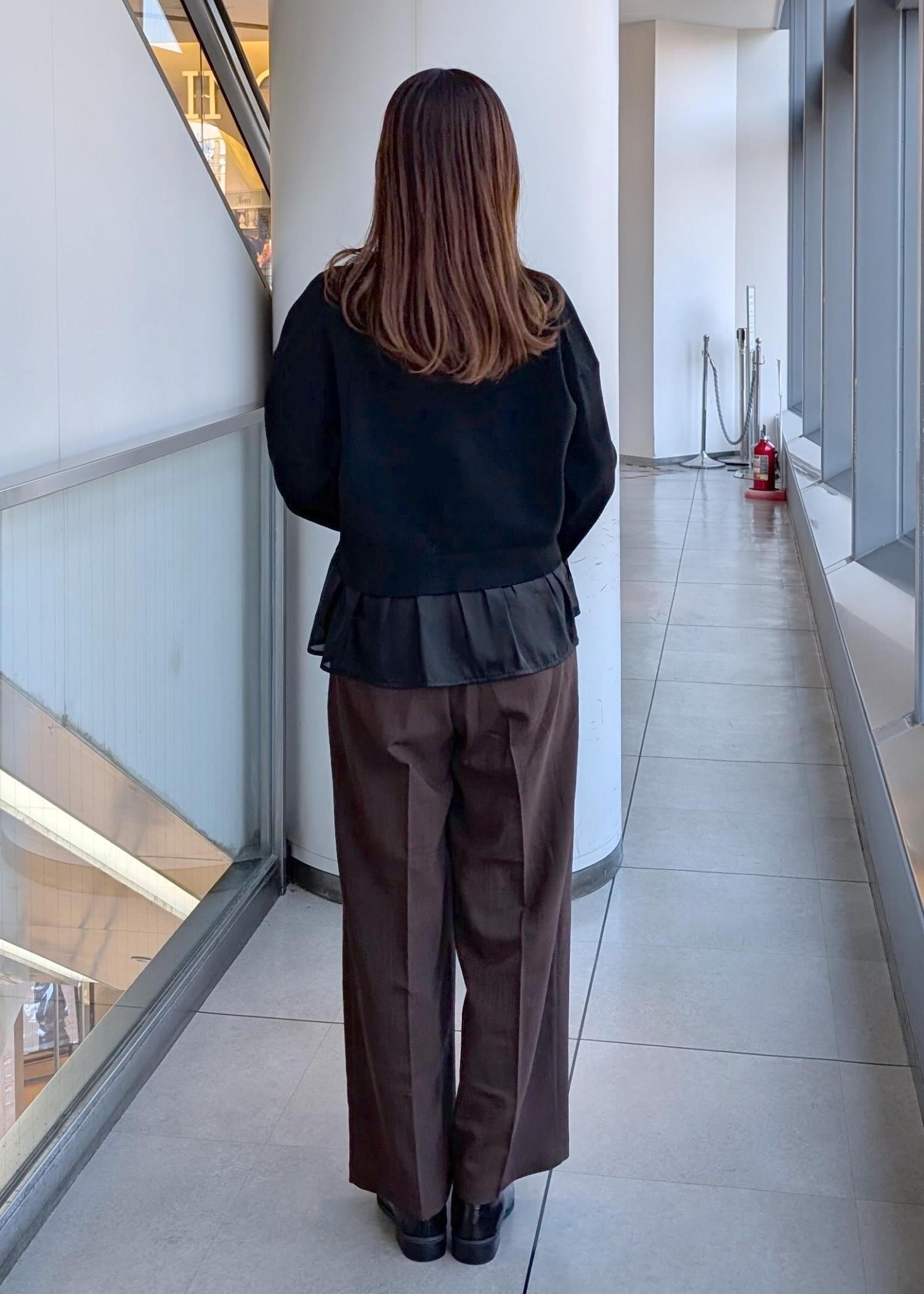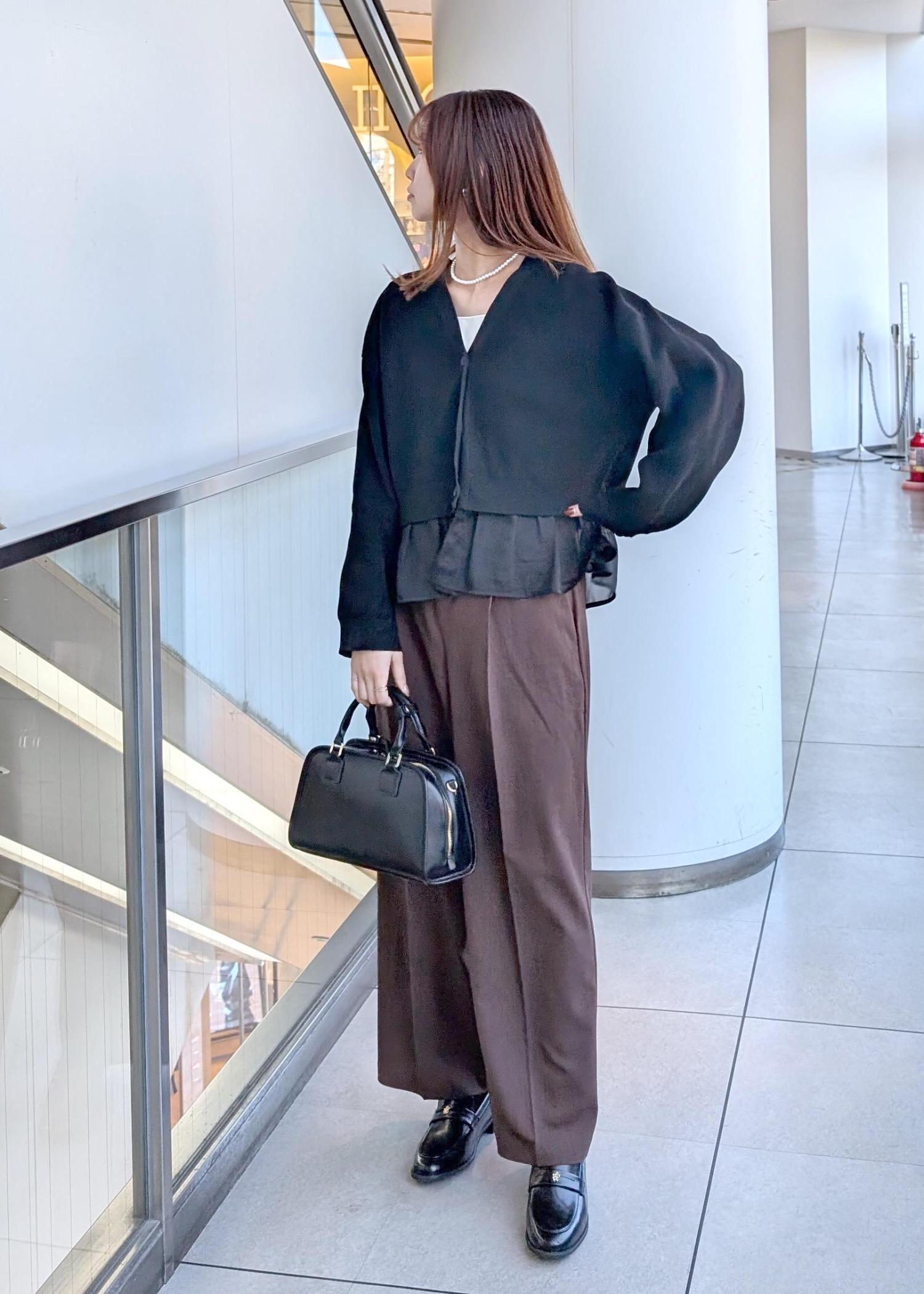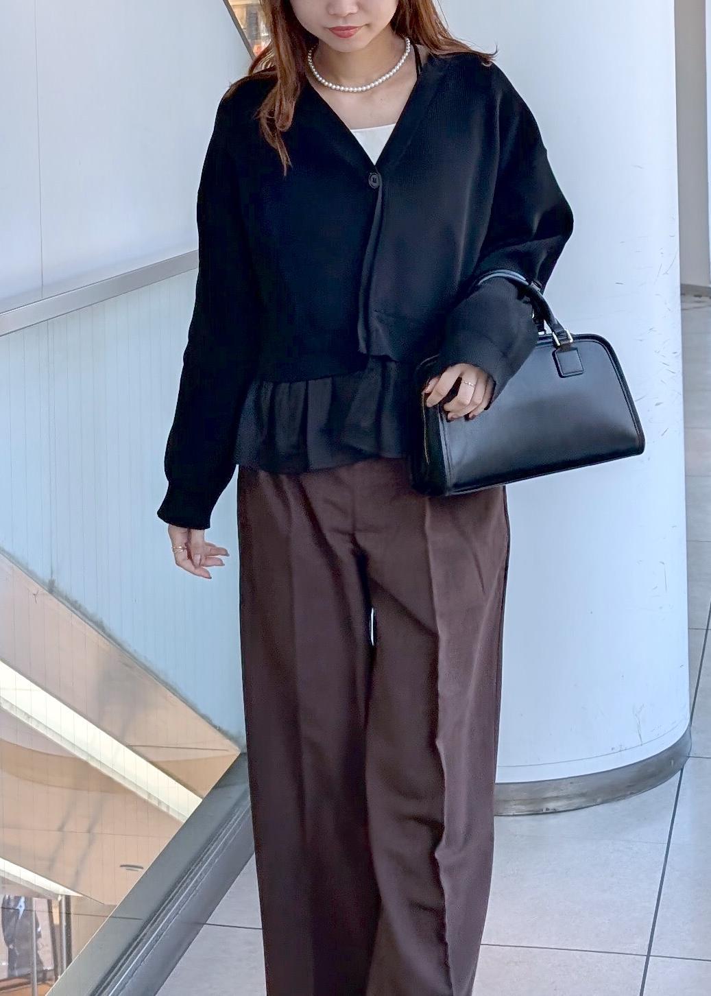 カーディガンは裾のフリルがワンポイント、着丈短めでワイドパンツとの相性◎