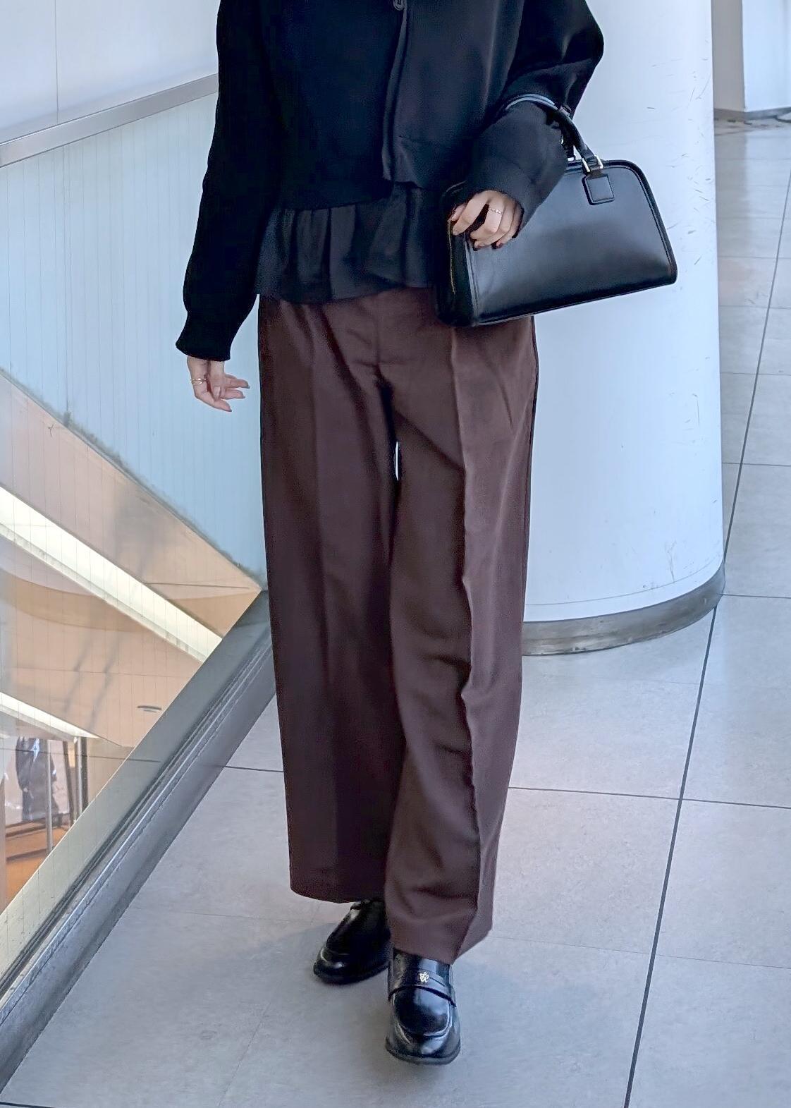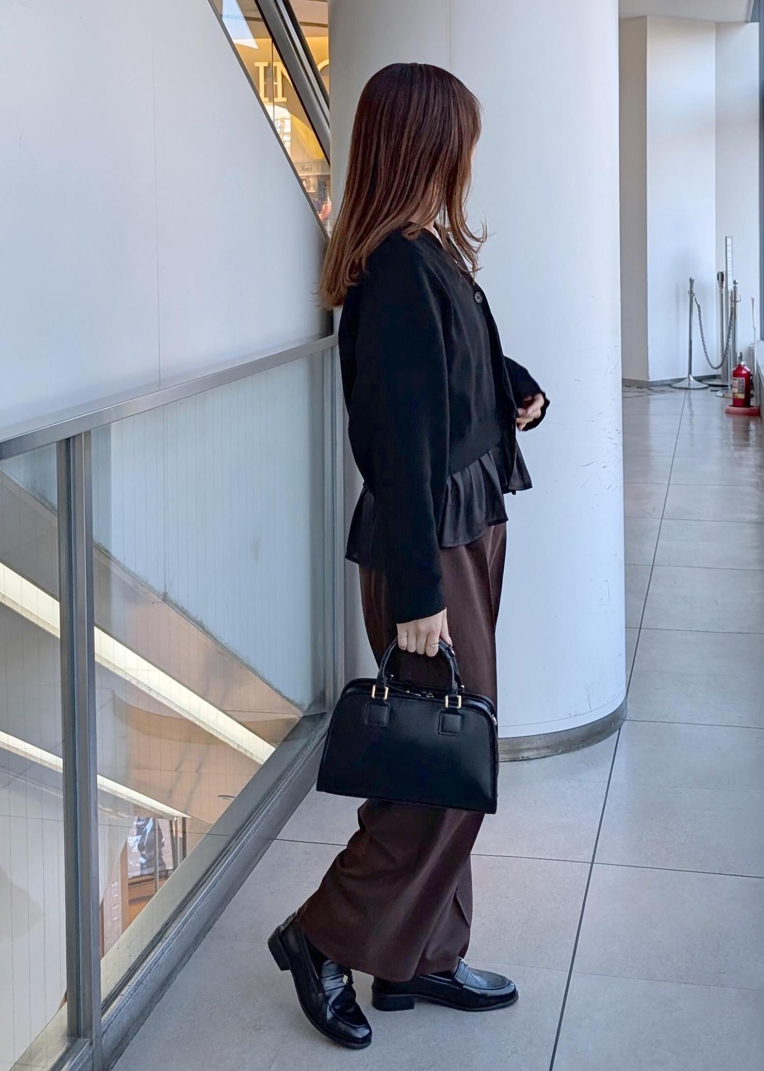 ブラック×ブラウンのカジュアルすぎないスタイル。