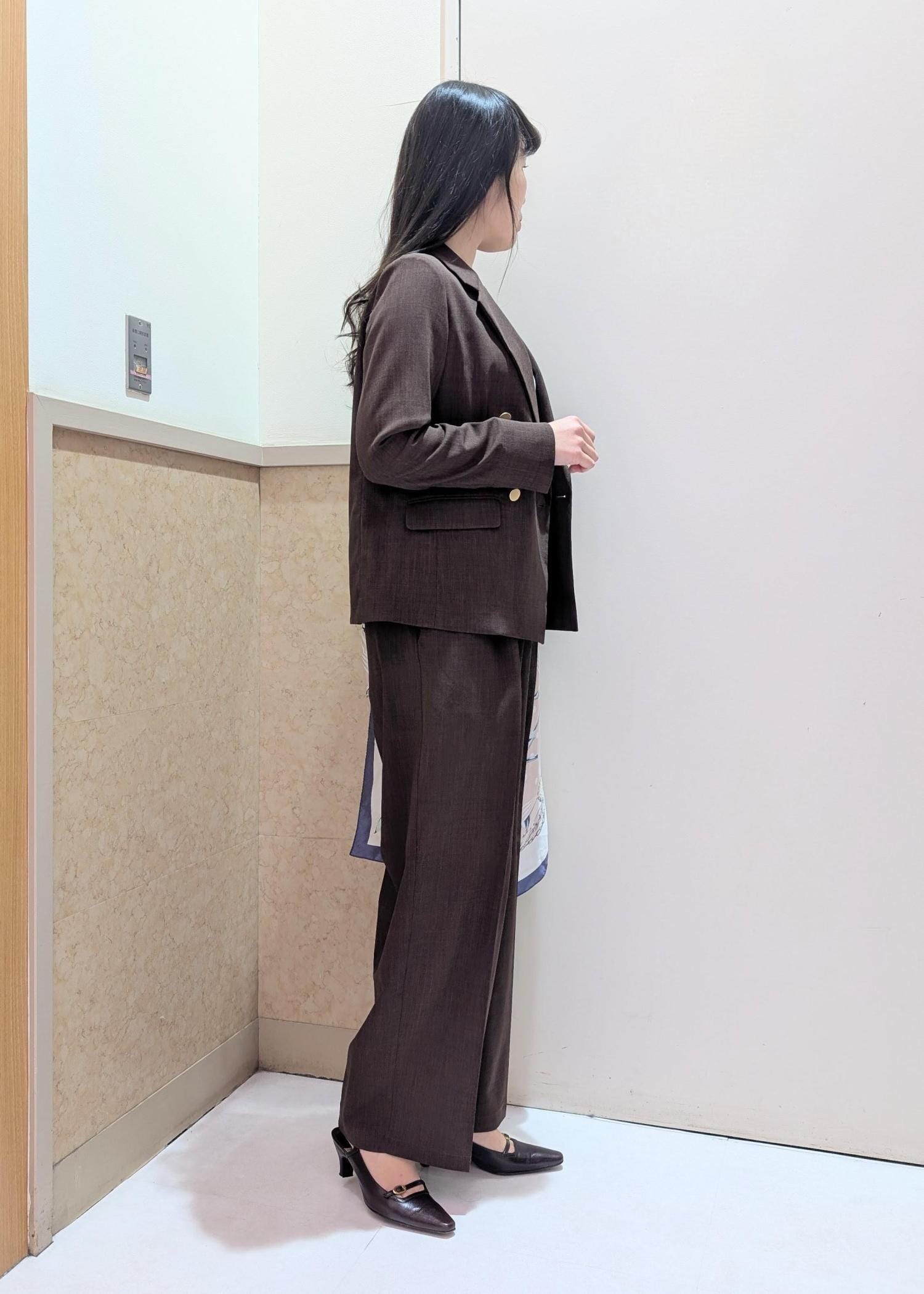 ブラウンのセットアップを春らしくコーディネートしたかったので、インナーは白ニット、アクセントにピンクのスカーフを腰に巻きました(^^)