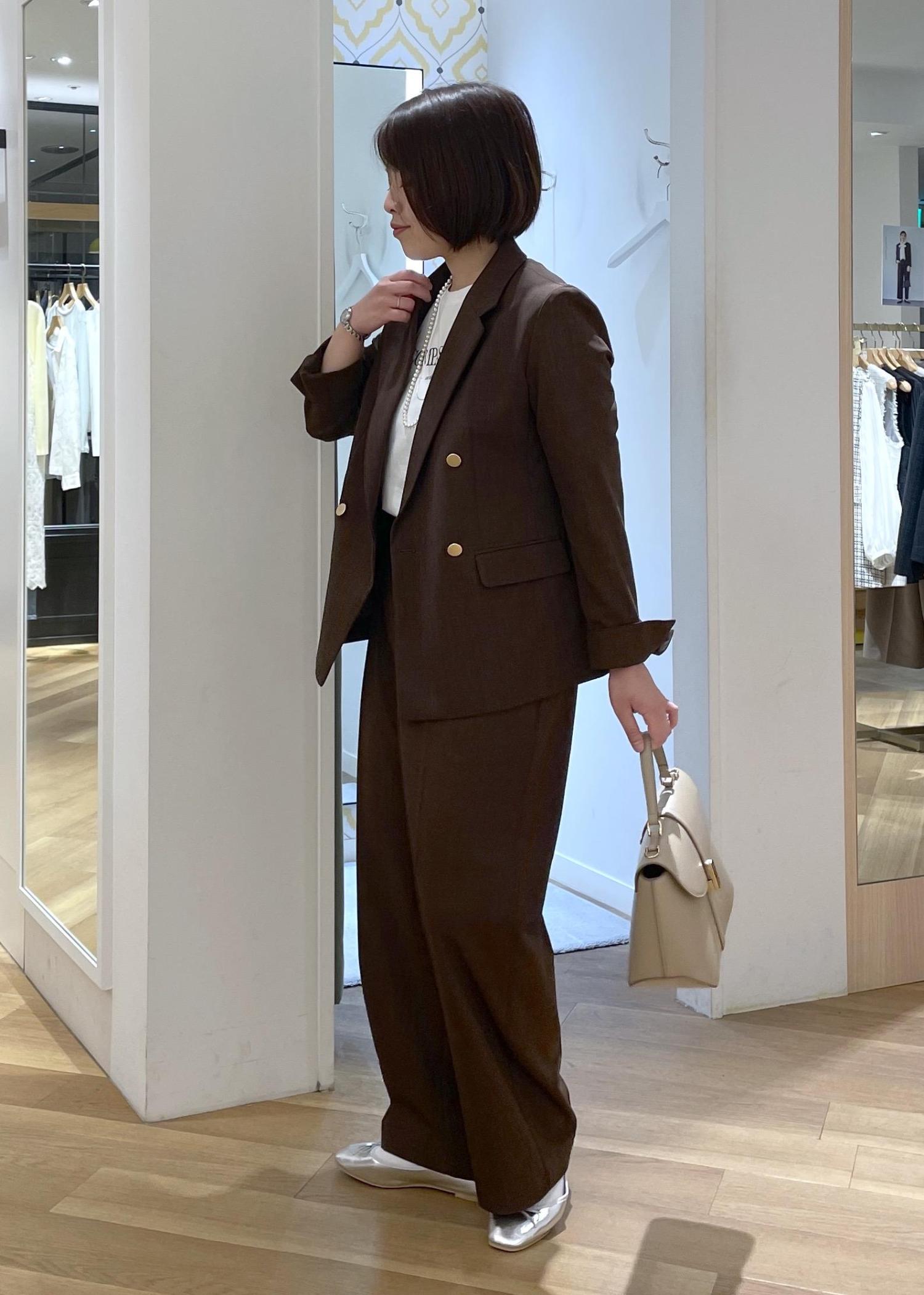 トレンド感のあるブラウンのカラーのセットアップを使った休日スタイルにもおすすめの大人カジュアルコーデです!