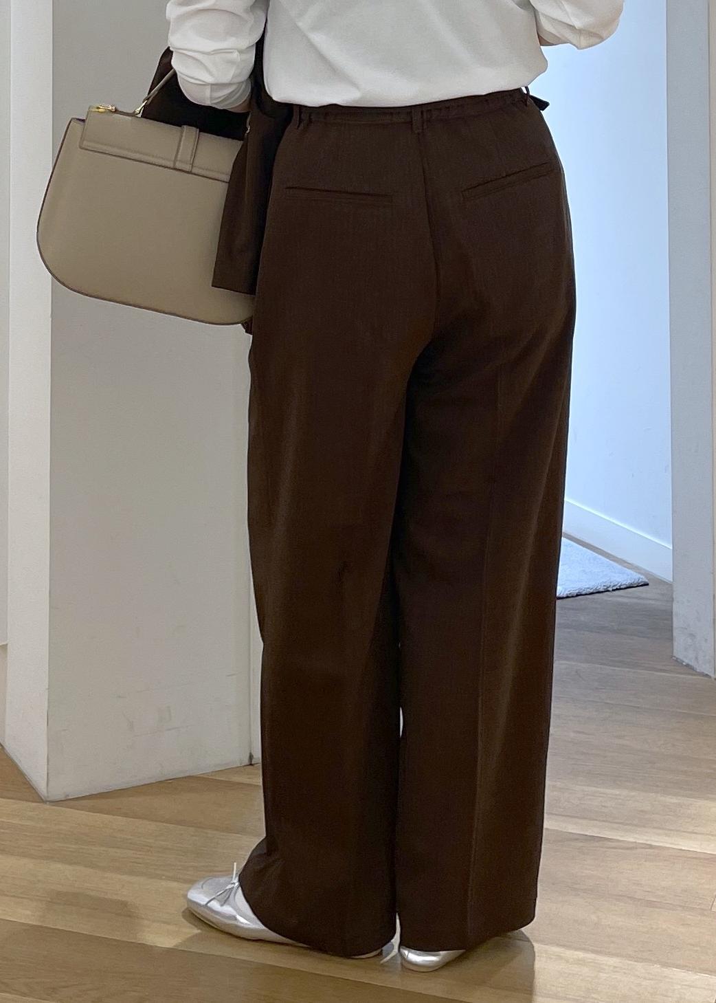 少しシャリ感のある薄めの生地で夏までの長い期間でお召し頂けるパンツです。ワイドシルエットなので、脚のラインは拾わず透け感も気にならなかったです。ウエストはトップスインできるゆとりがあります。着丈は160cm、Mサイズ着用でフラットシューズでも擦らない長さでした。