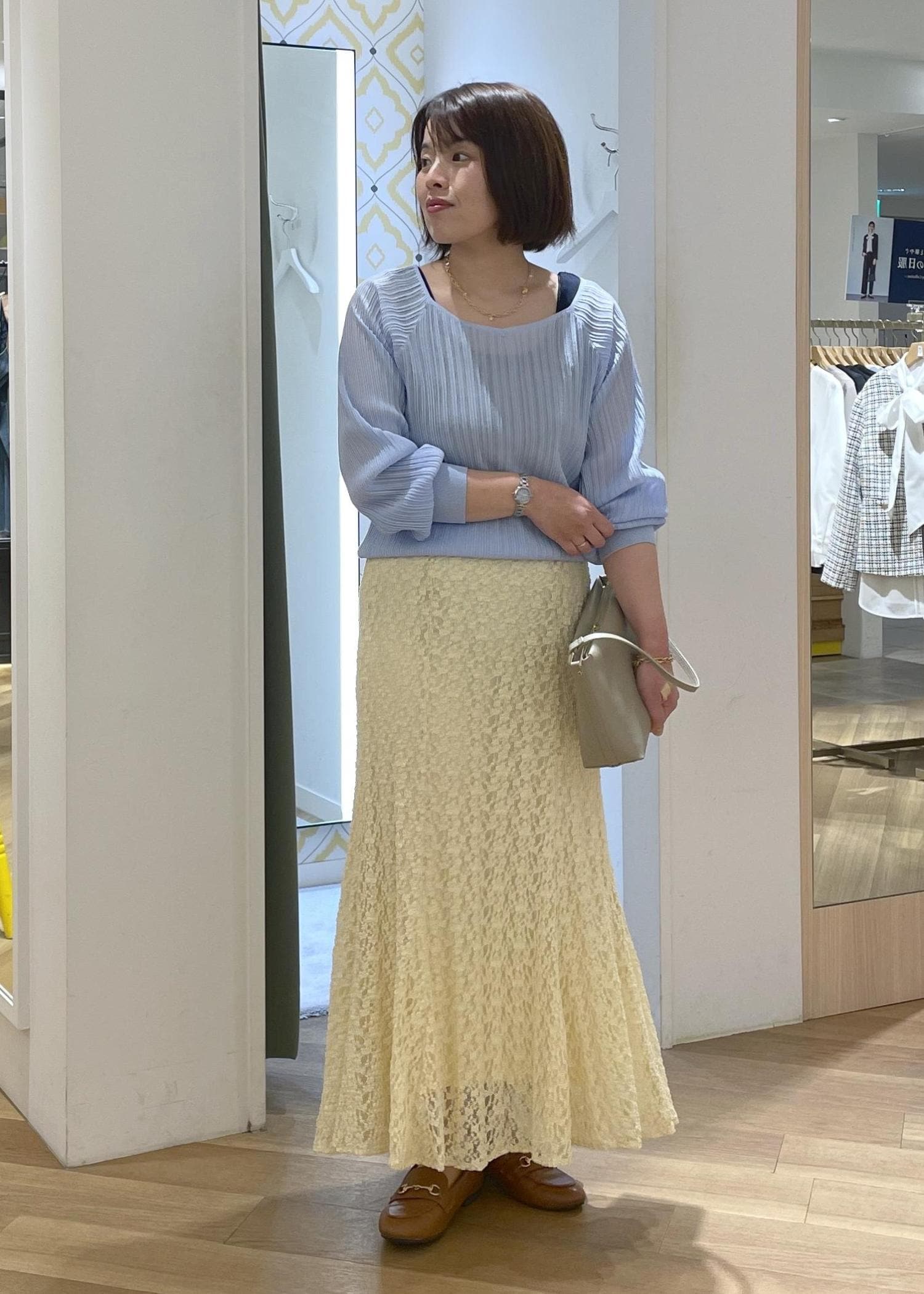 プリーツニットのレーススカートコーデ