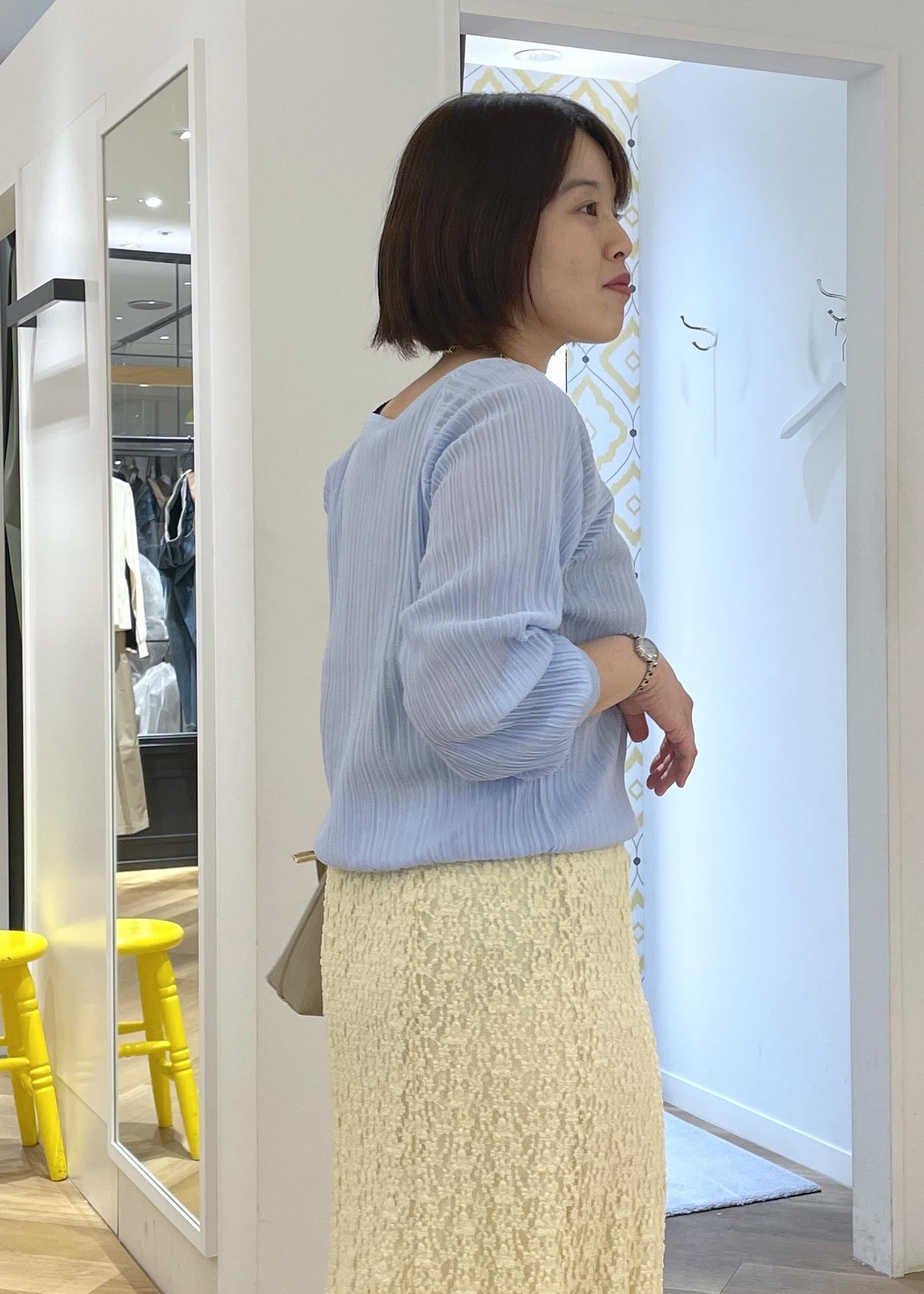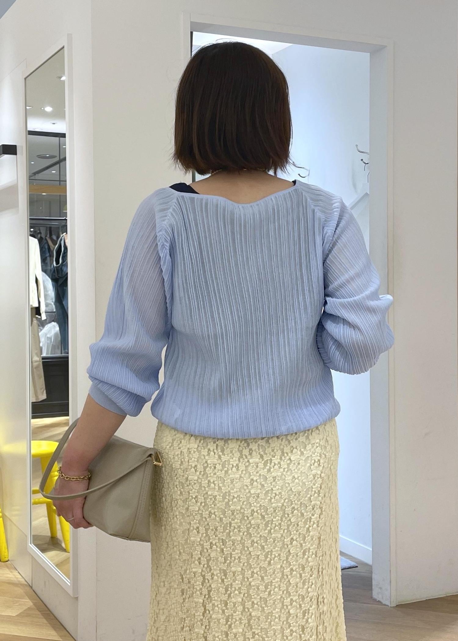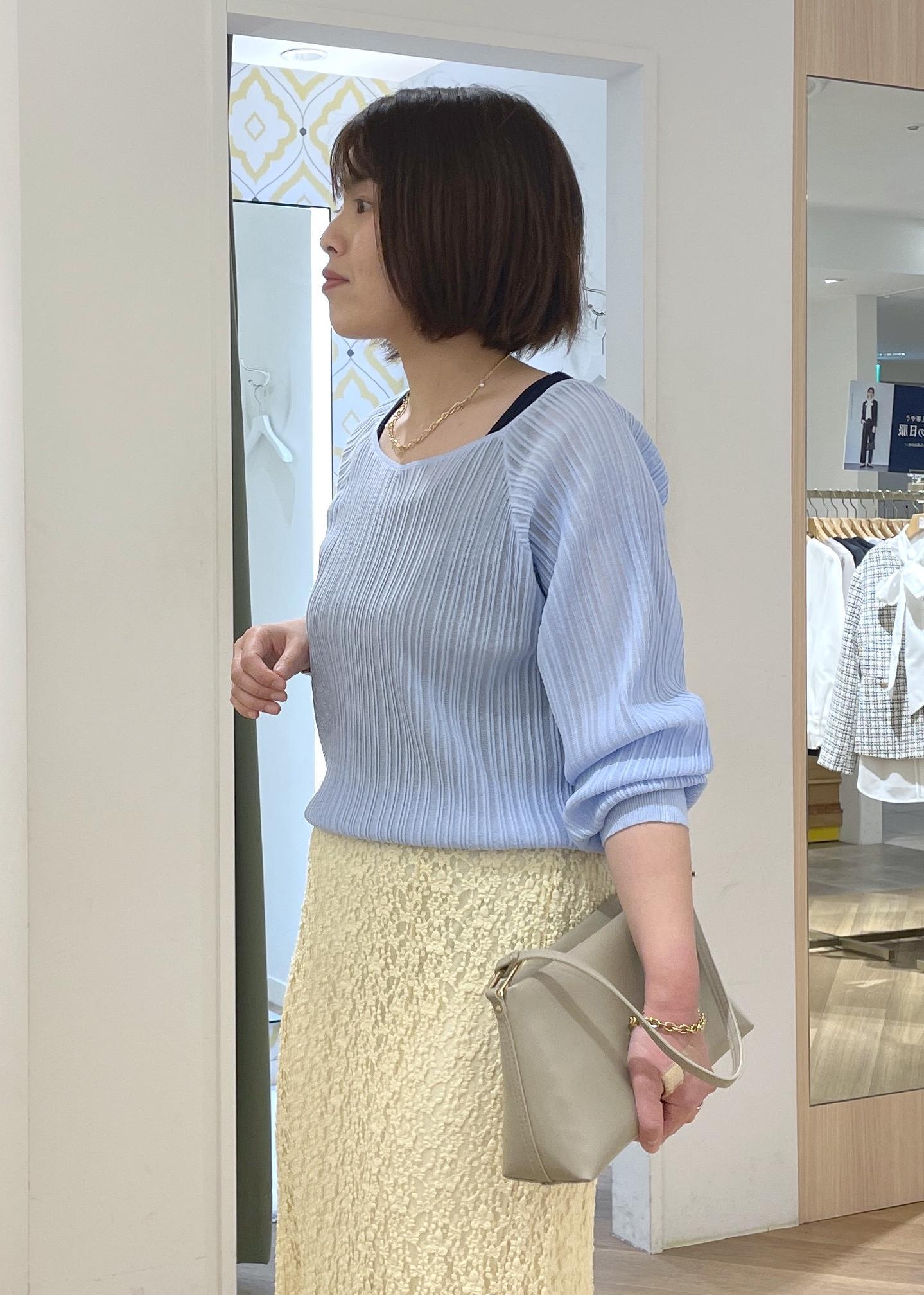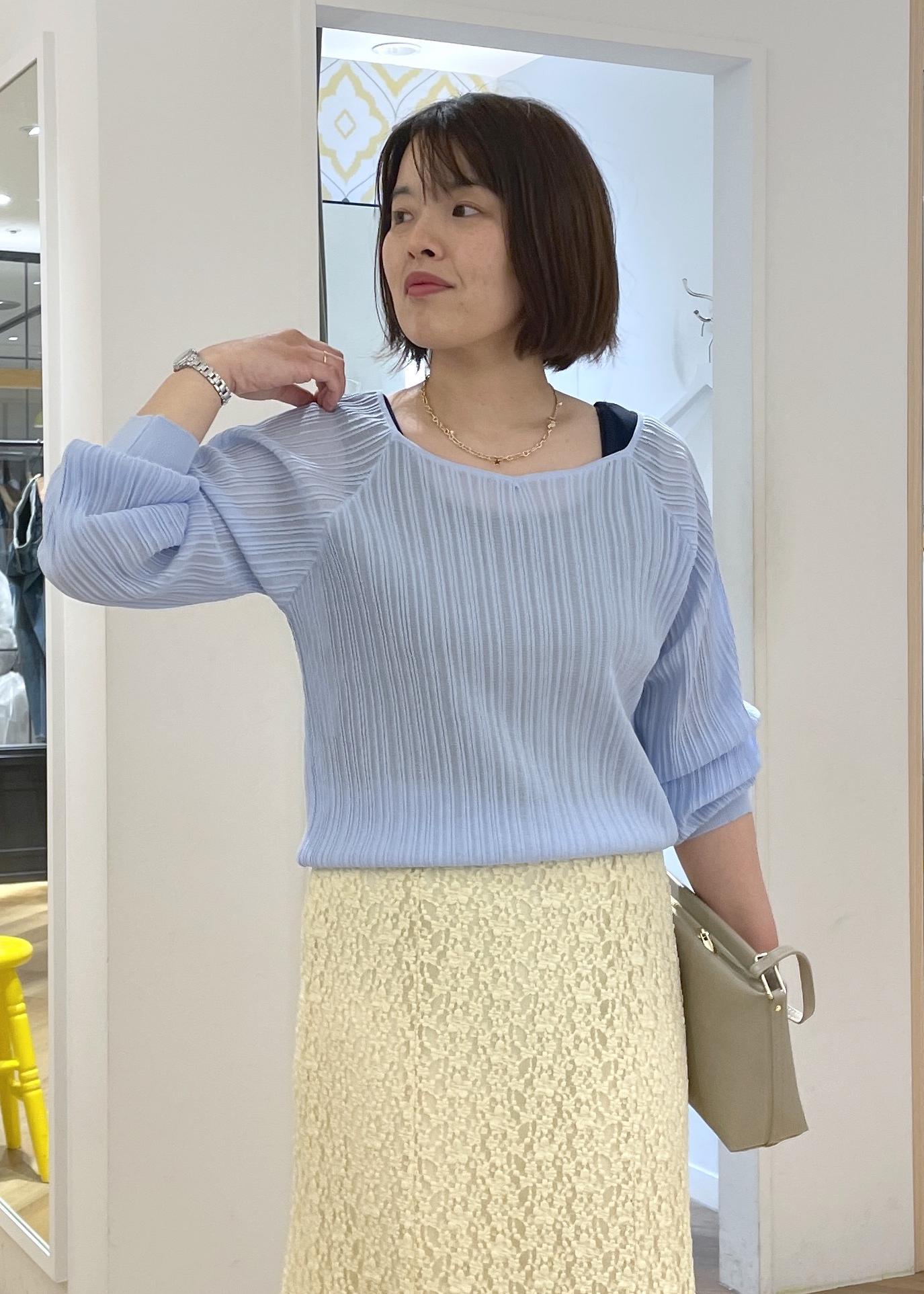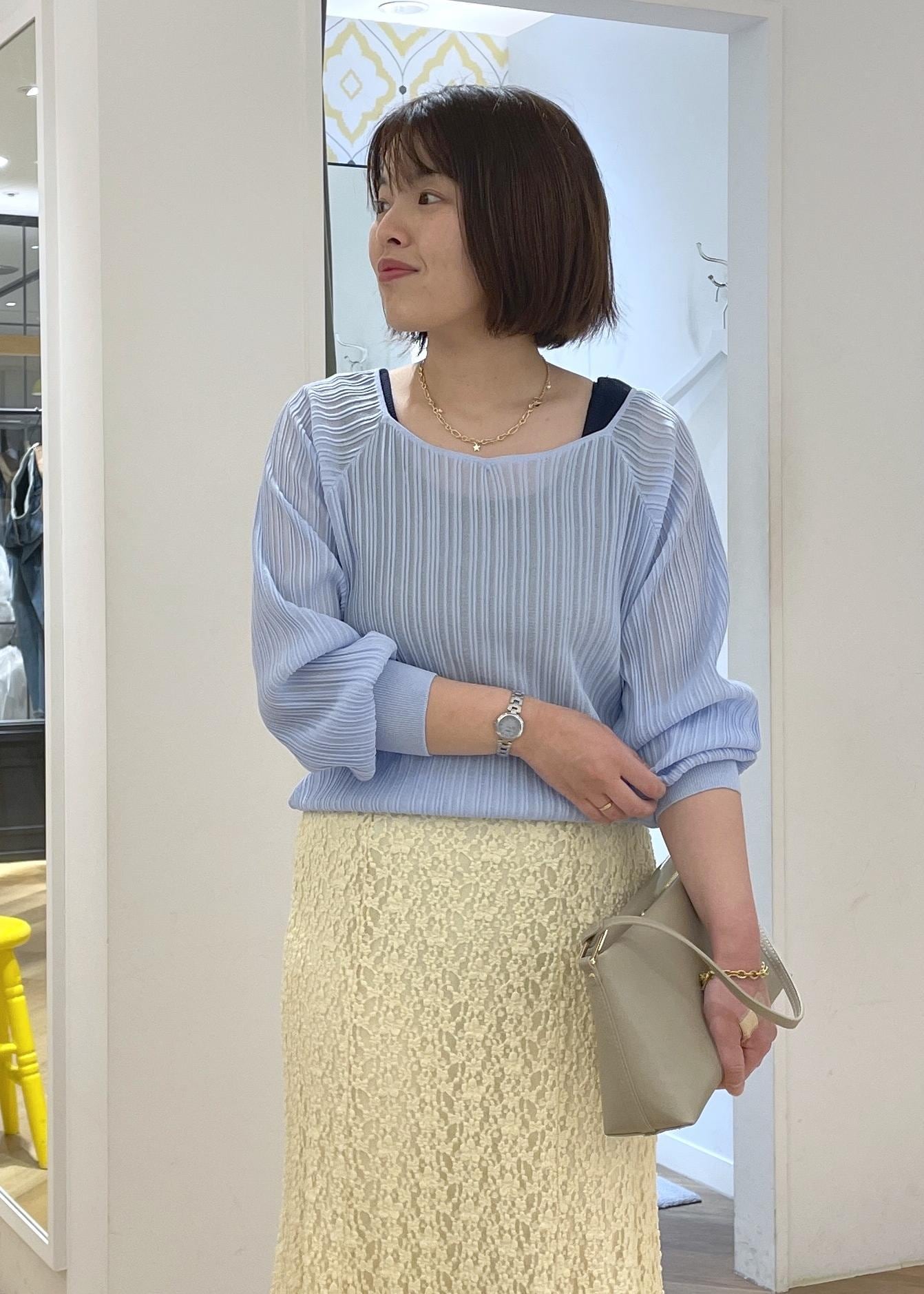 ROPÉ PICNICシャイニープリーツニットサックス / F¥4,994レビュープリーツとさり気ないラメ感で華やかさのあるニットです。シアー感のありニットで清涼感があります。少し透け感のあるニットなので、見えても良いインナーを合わせておくと安心です。身頃はゆったりとしており、着丈はインしなくてもすっきりと着用できる長さです。