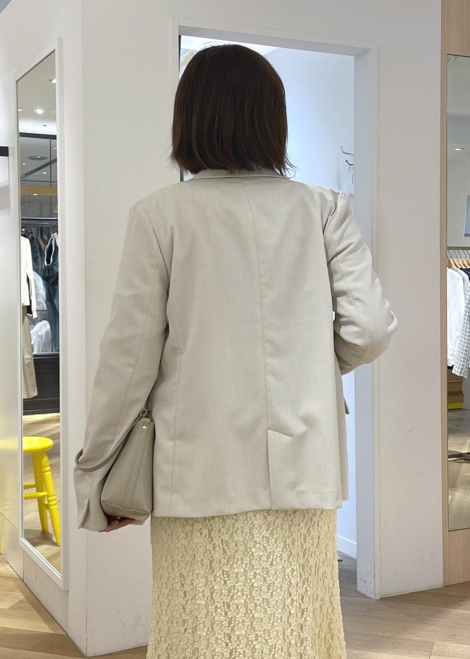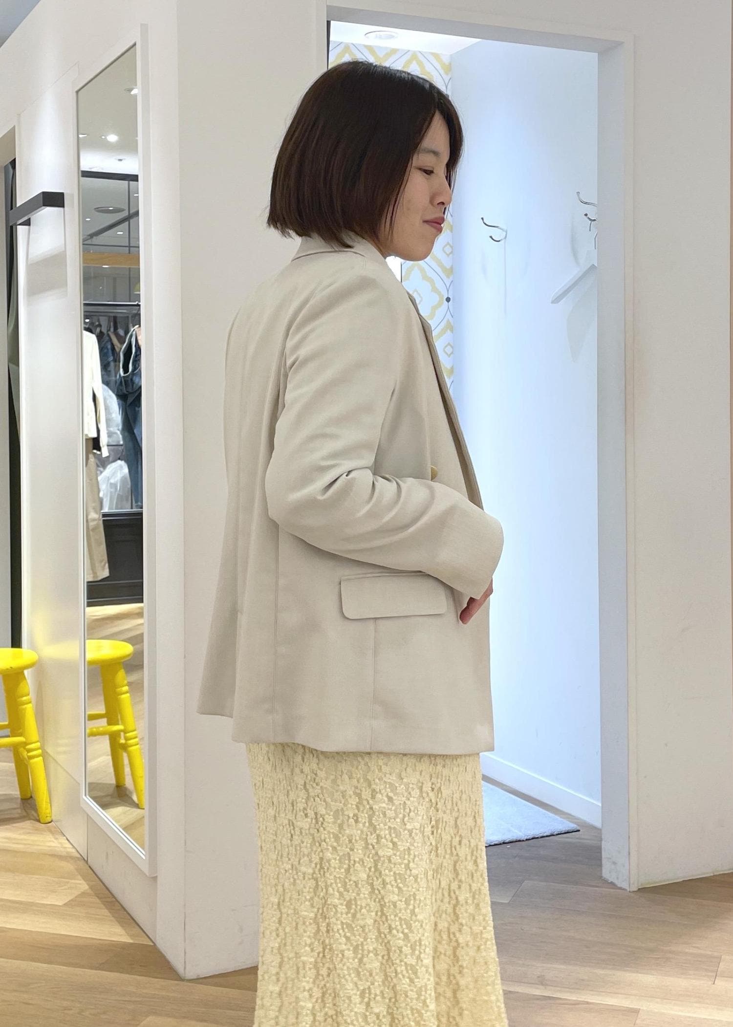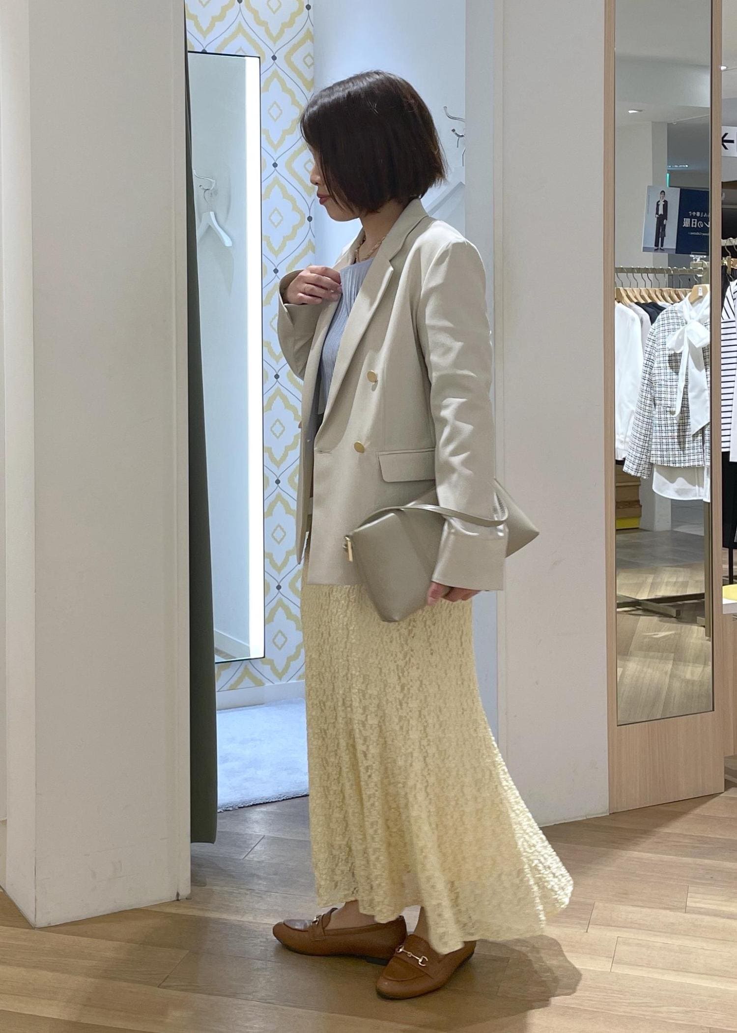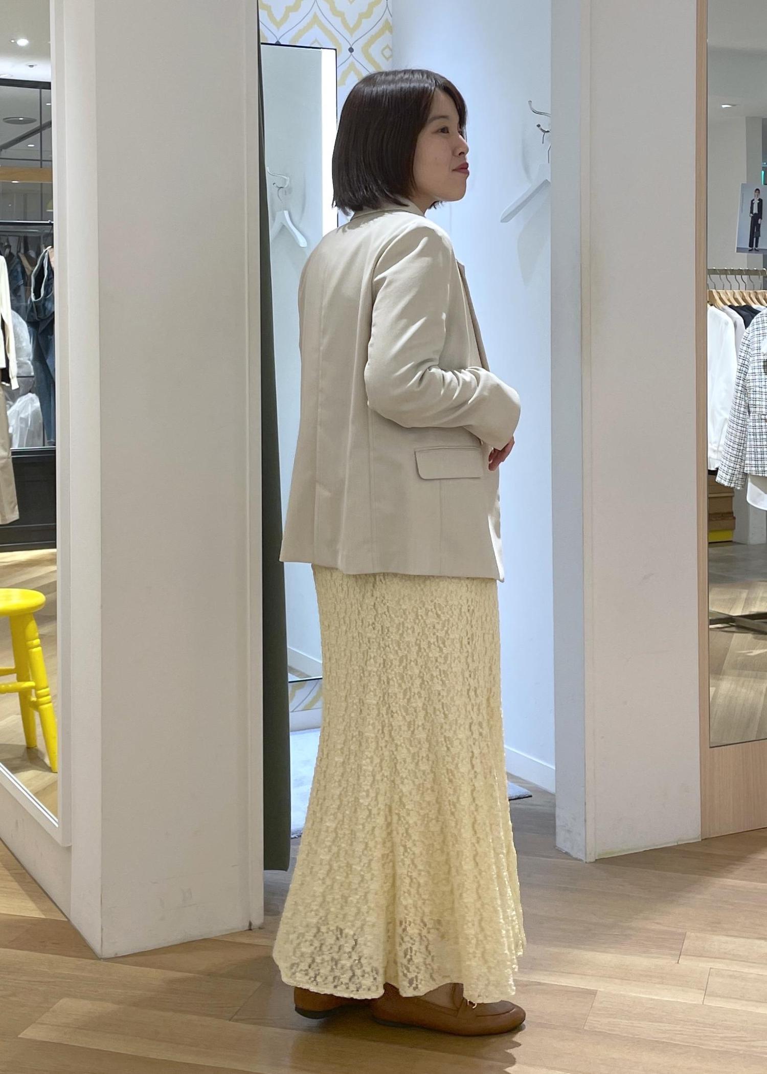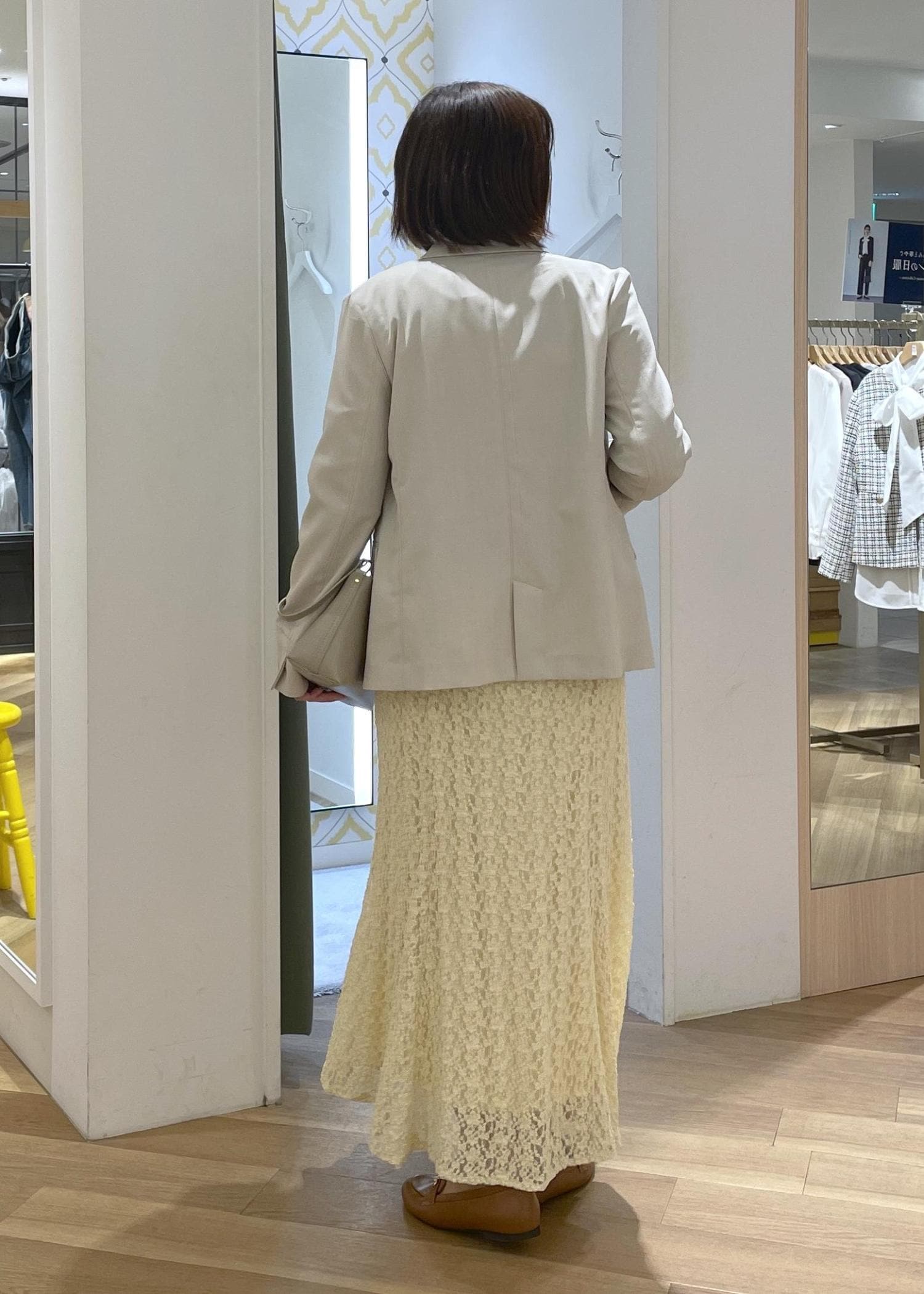 柔らかいベージュの麻調ジャケットにクリームイエローのレーススカートを合わせた、春カラーコーデです!