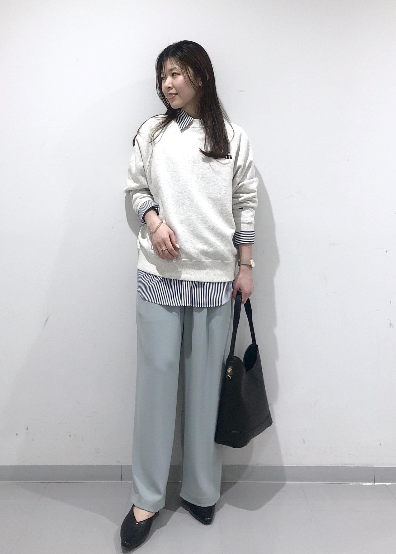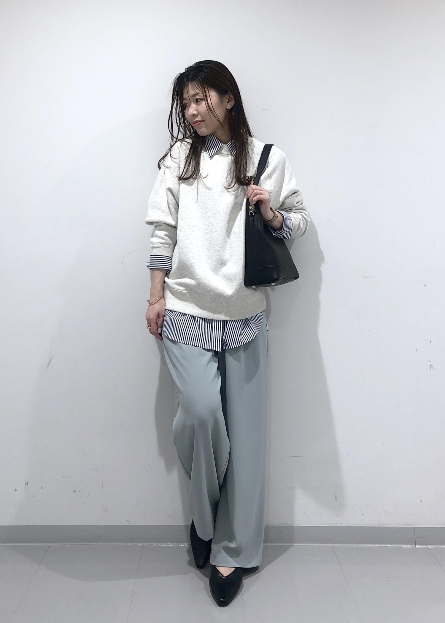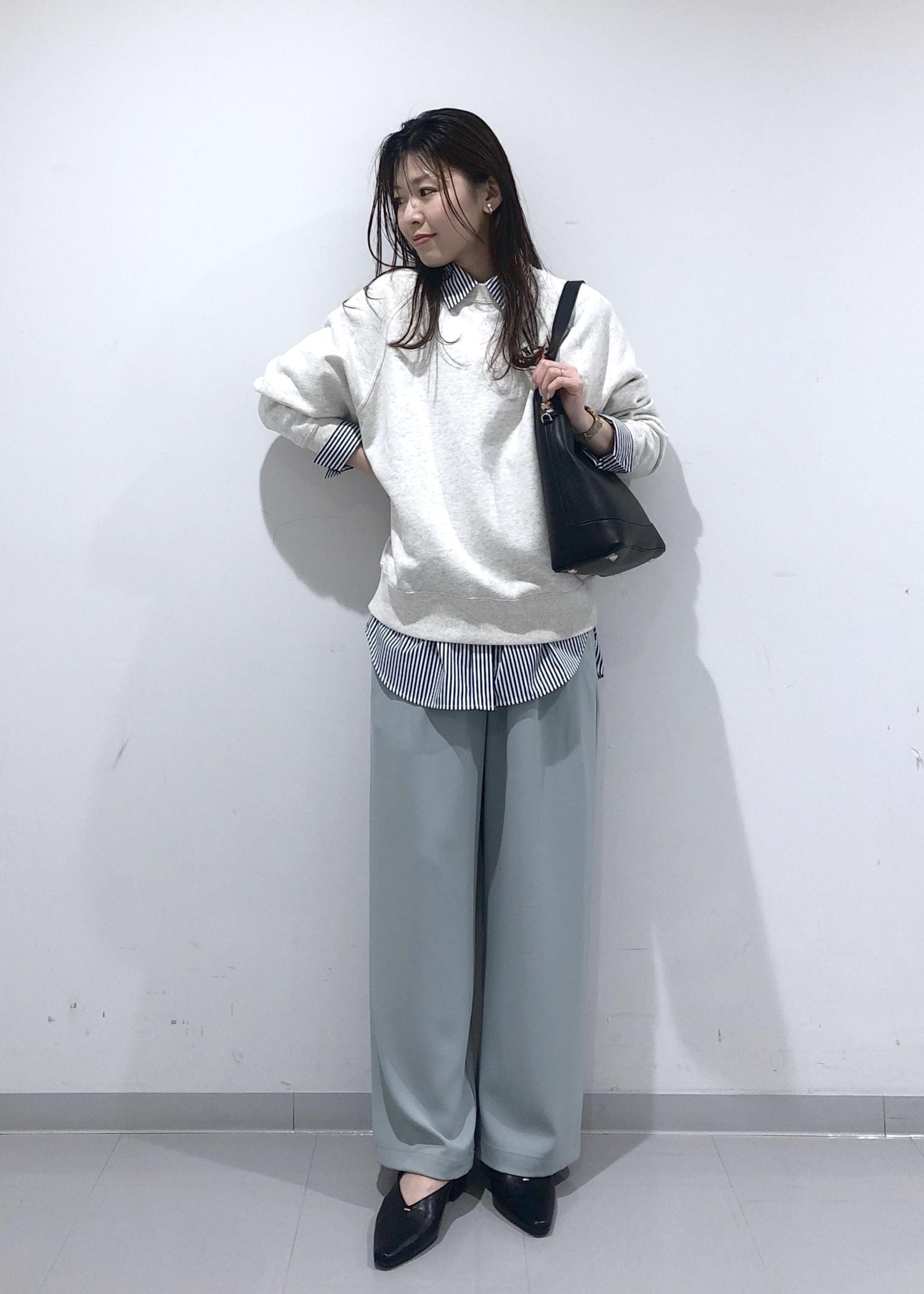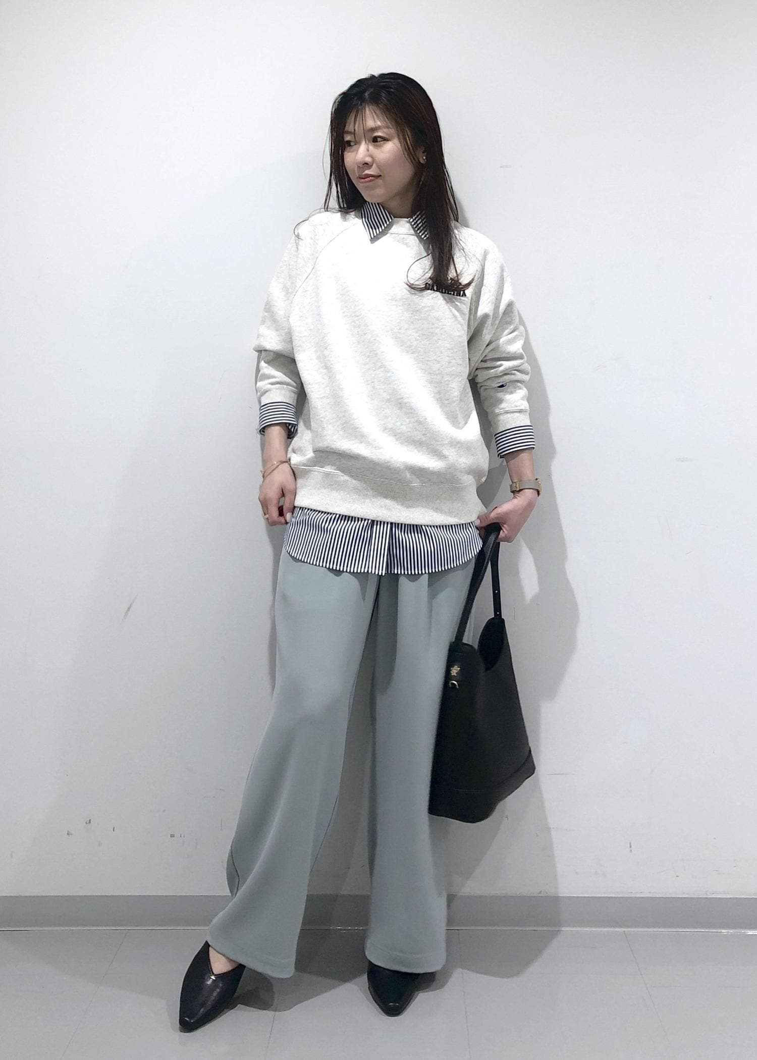 スウェットとシャツのレイヤードに、きれいな色味のグリーンのイージーワイドパンツを合わせ、春らしい淡いカラーでコーディネートし、小物は黒で引き締めました!