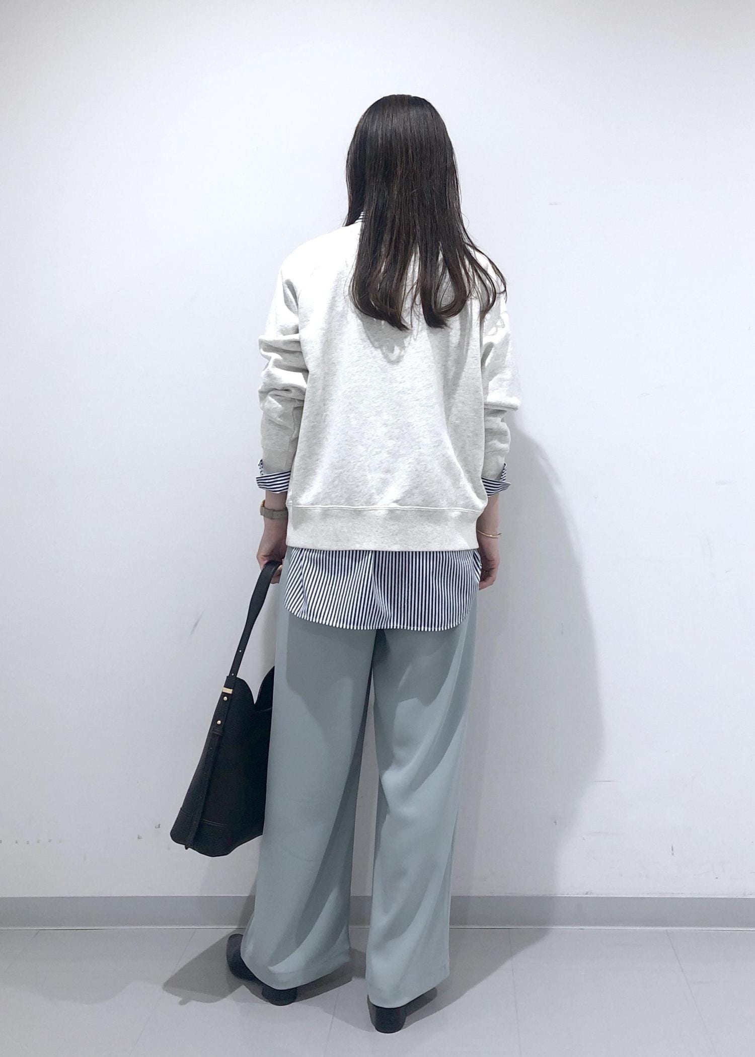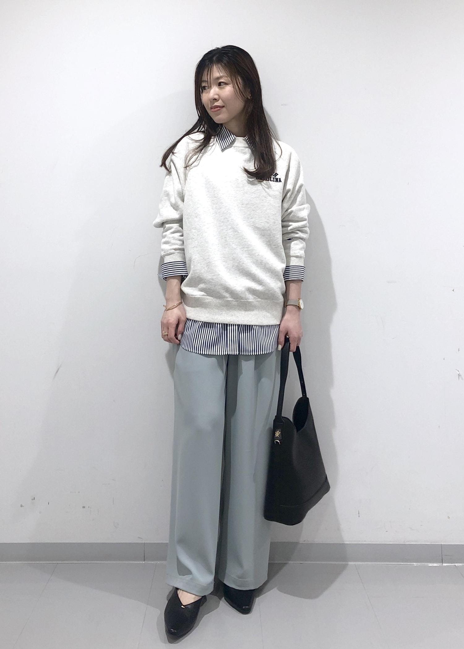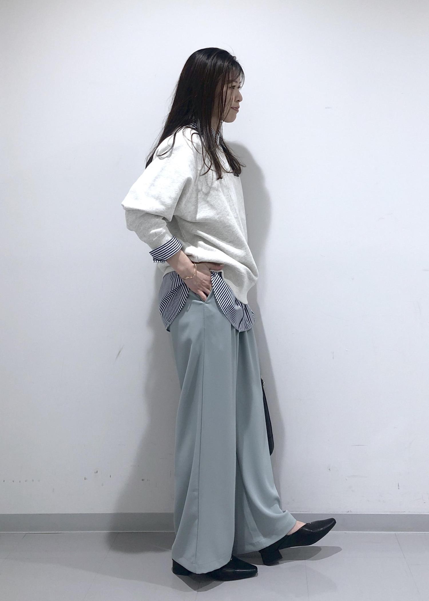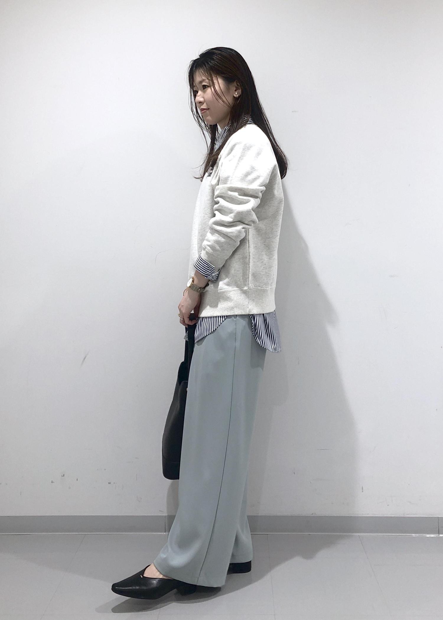 スウェットとシャツのレイヤードに、きれいな色味のグリーンのイージーワイドパンツを合わせ、春らしい淡いカラーでコーディネートし、小物は黒で引き締めました!