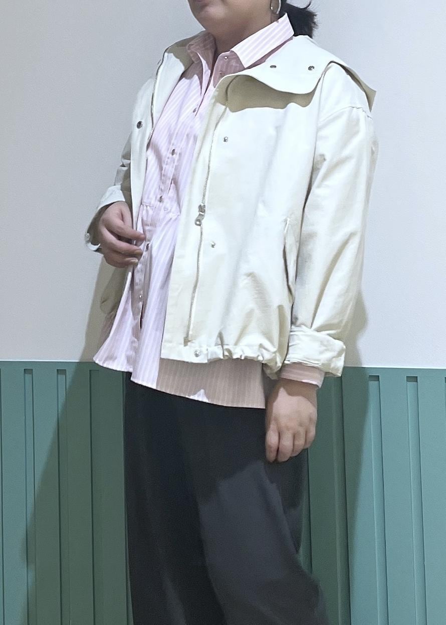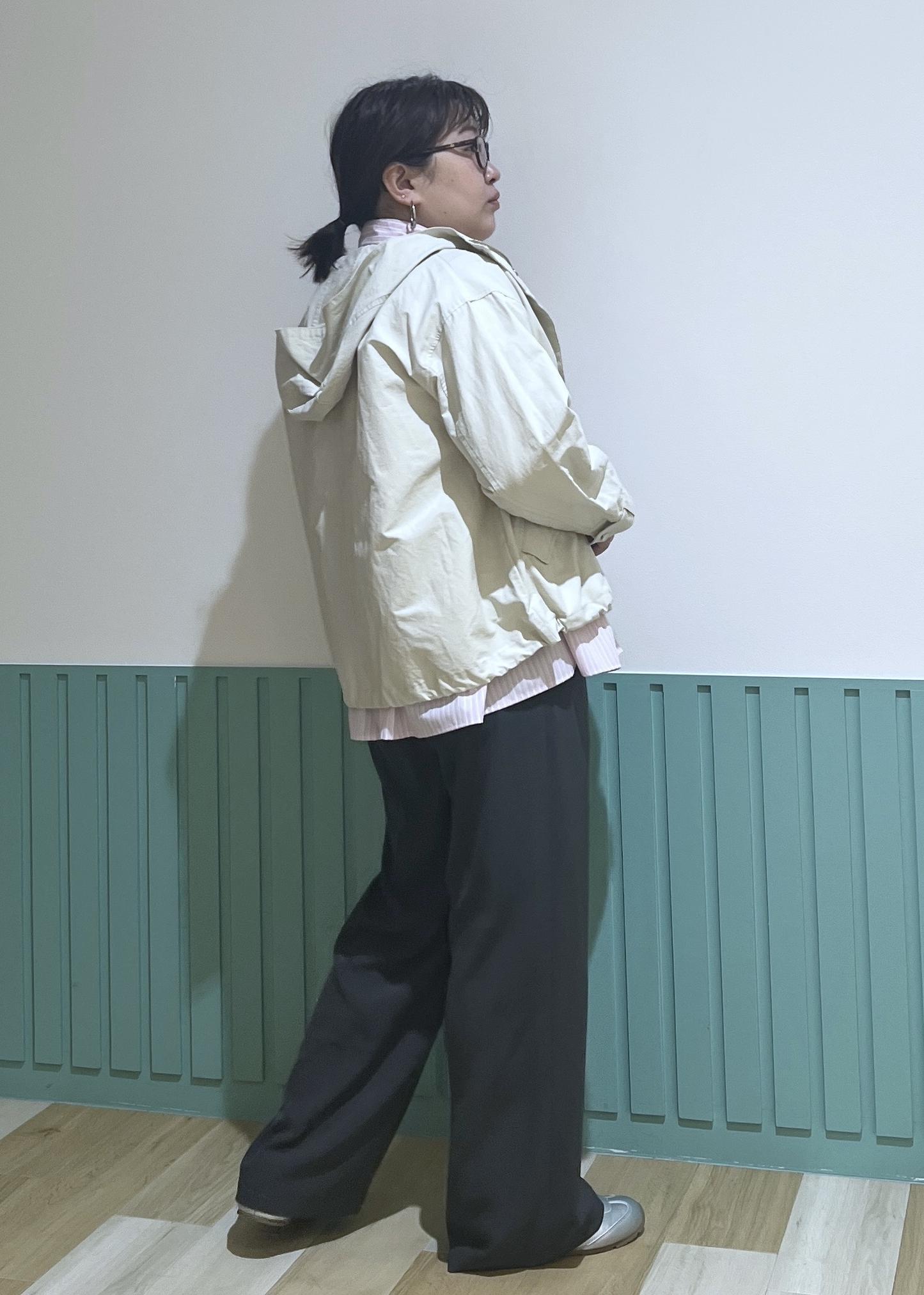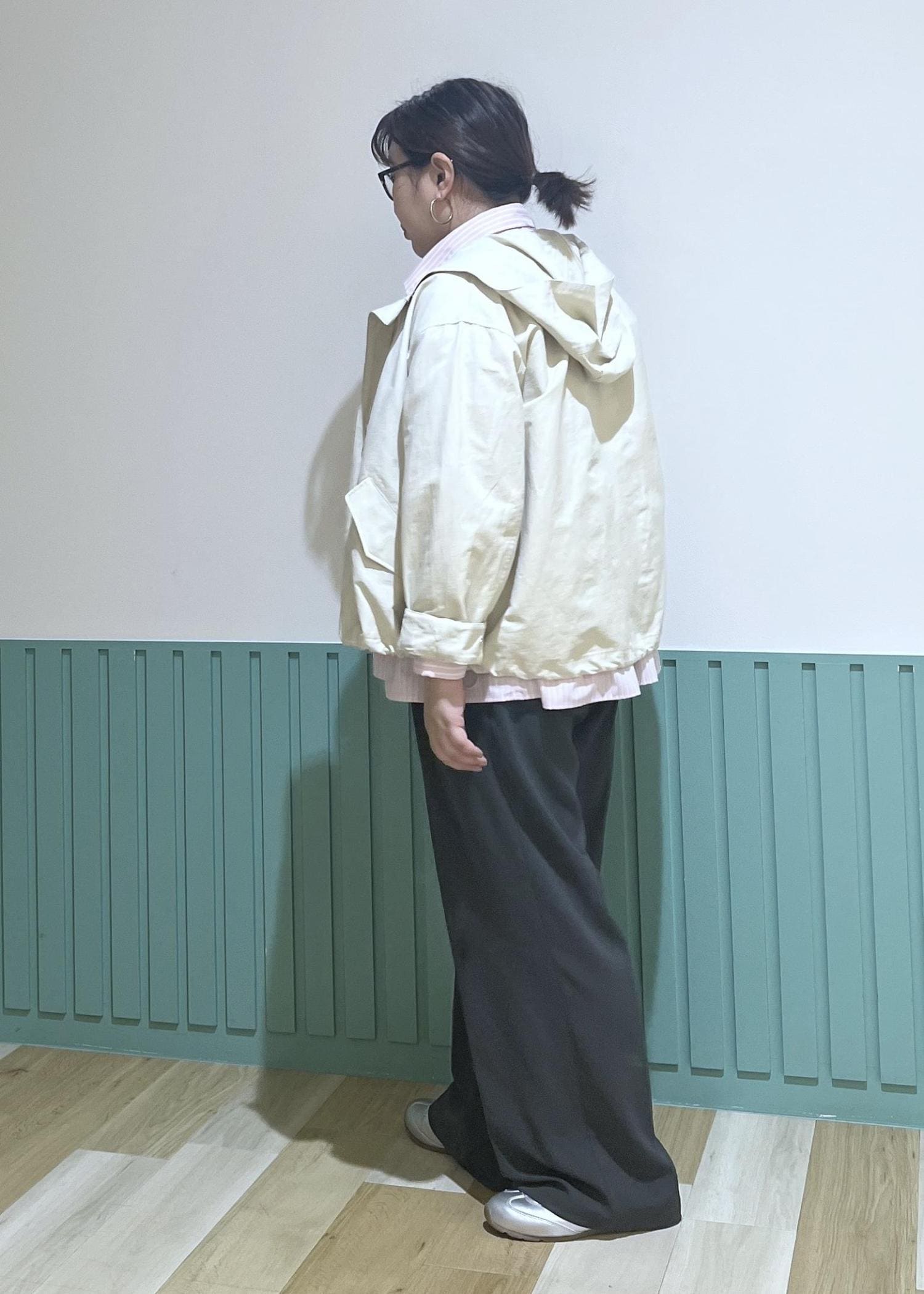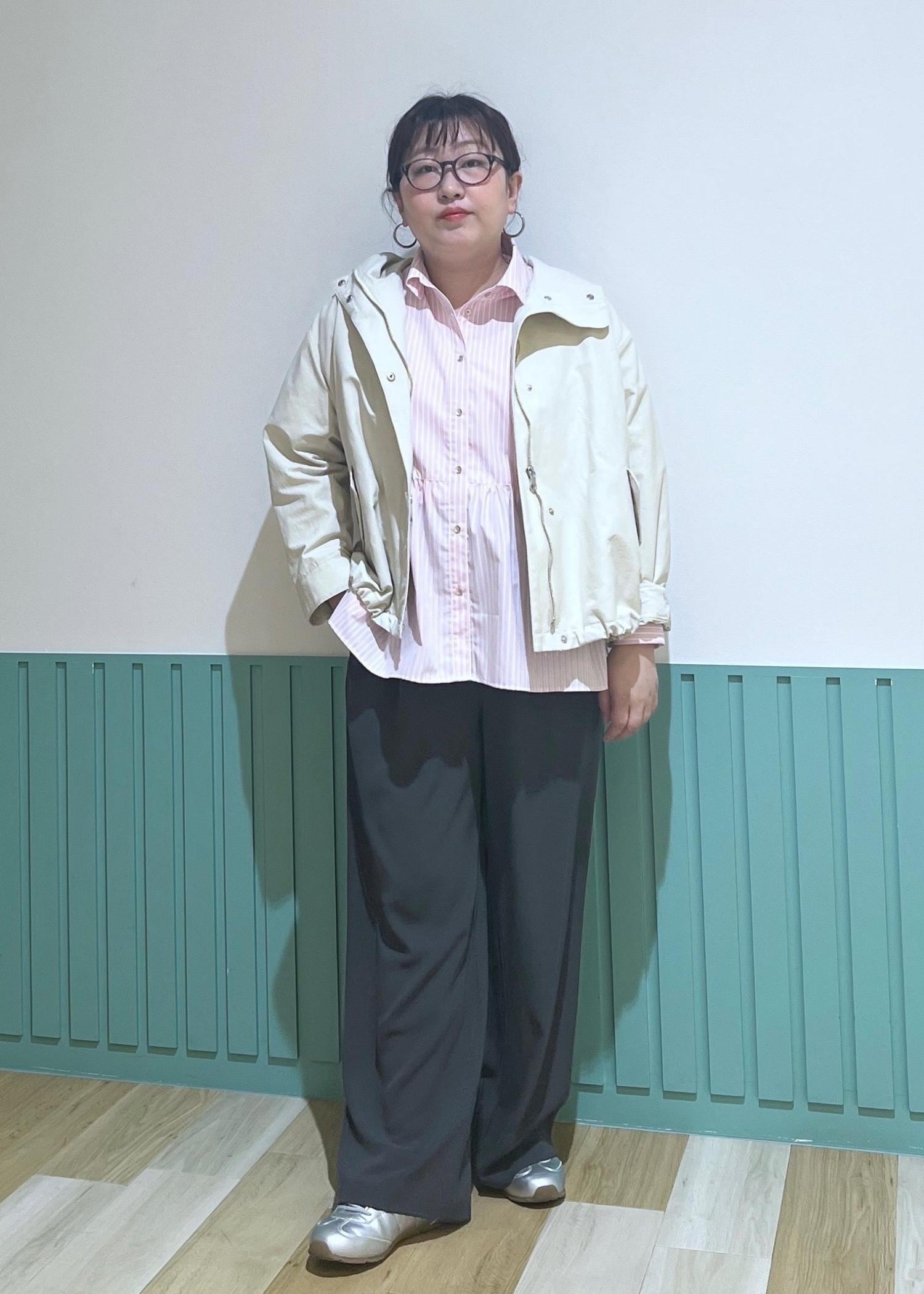 マウンテンパーカーとワイドパンツで、大人カジュアルに。ブラウスをピンクのペプラムにすることによって、女性らしさをプラス。