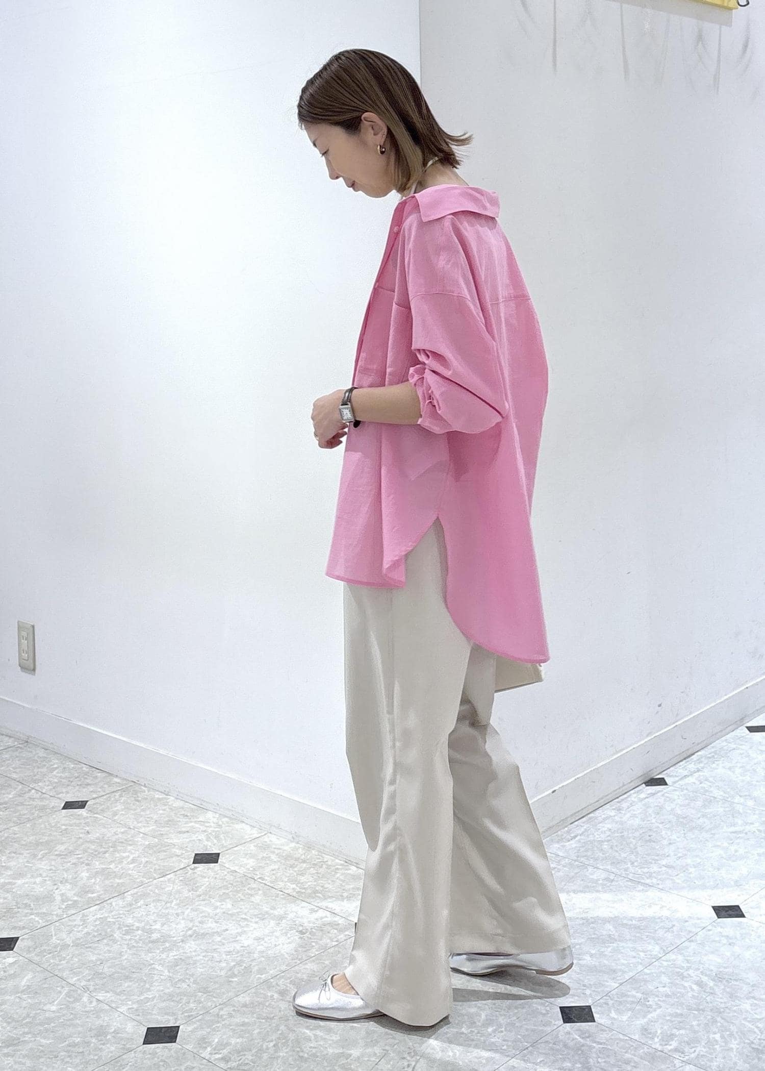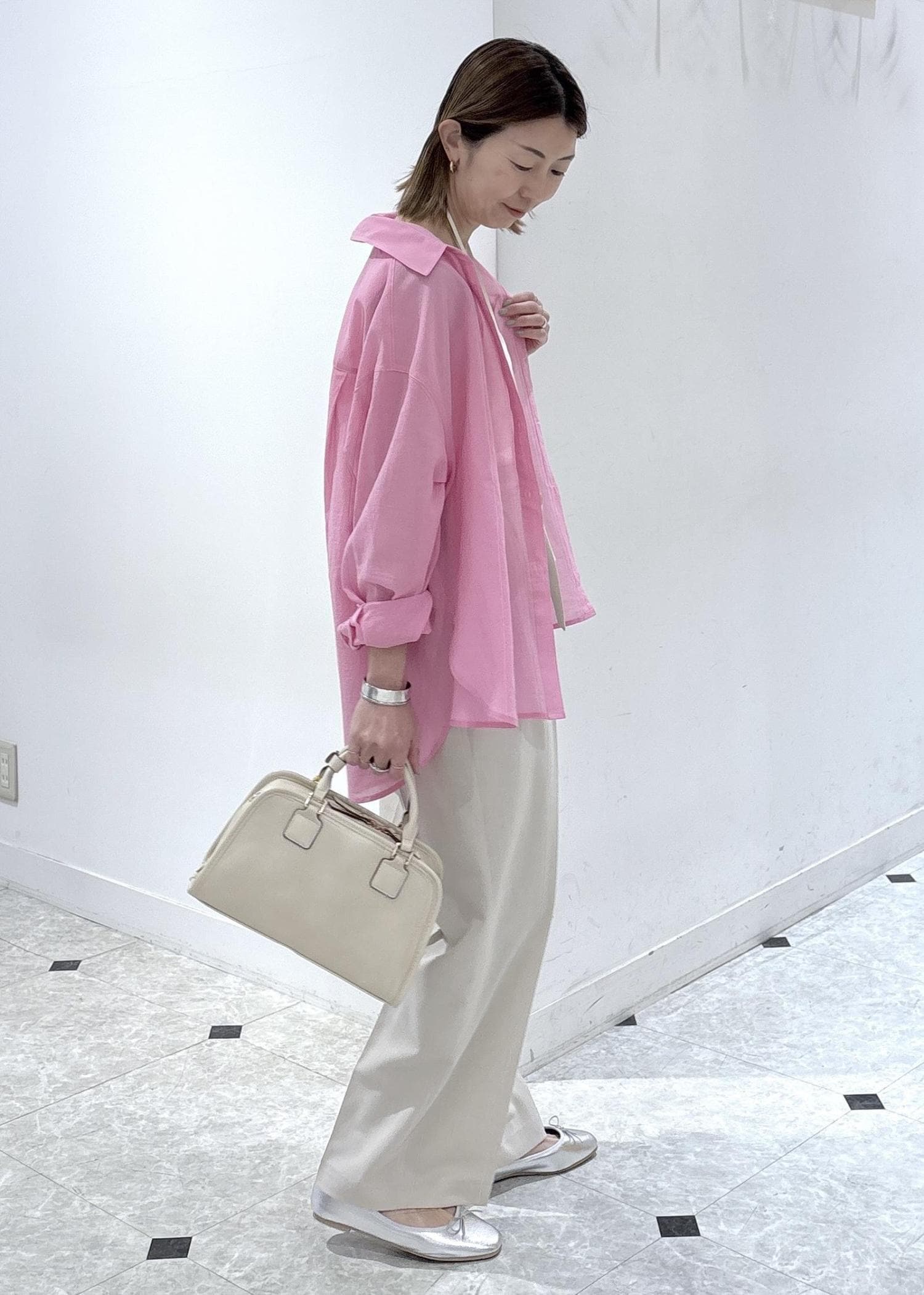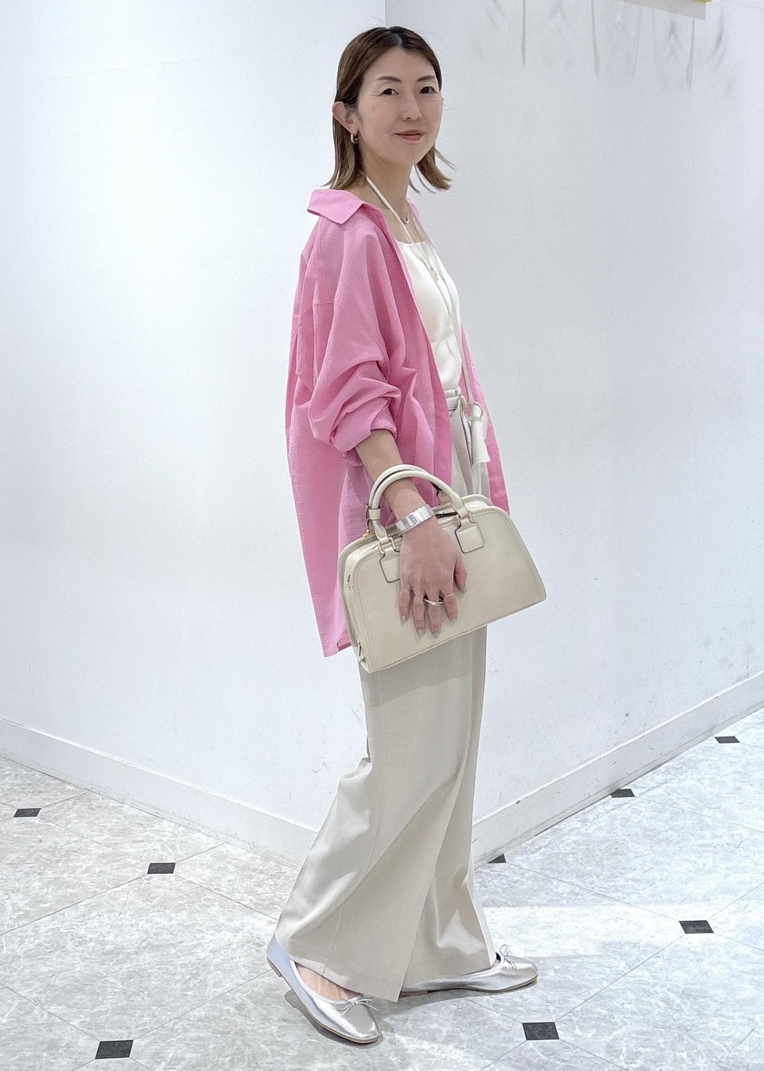 ベージュのパンツを合わせて柔らかい優しい印象の大人カジュアルスタイリング